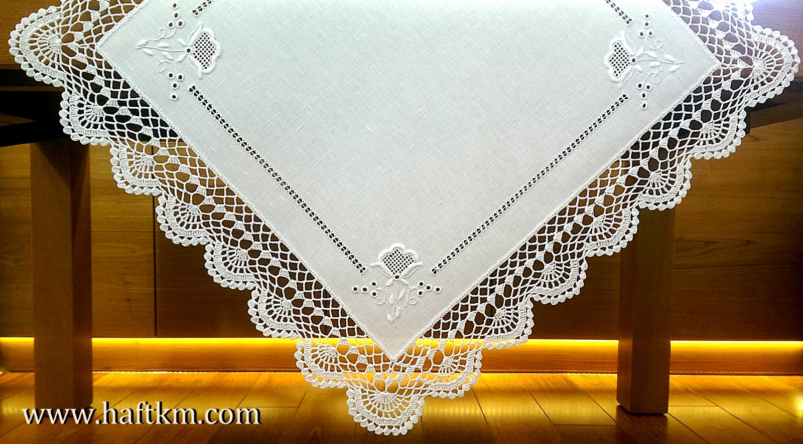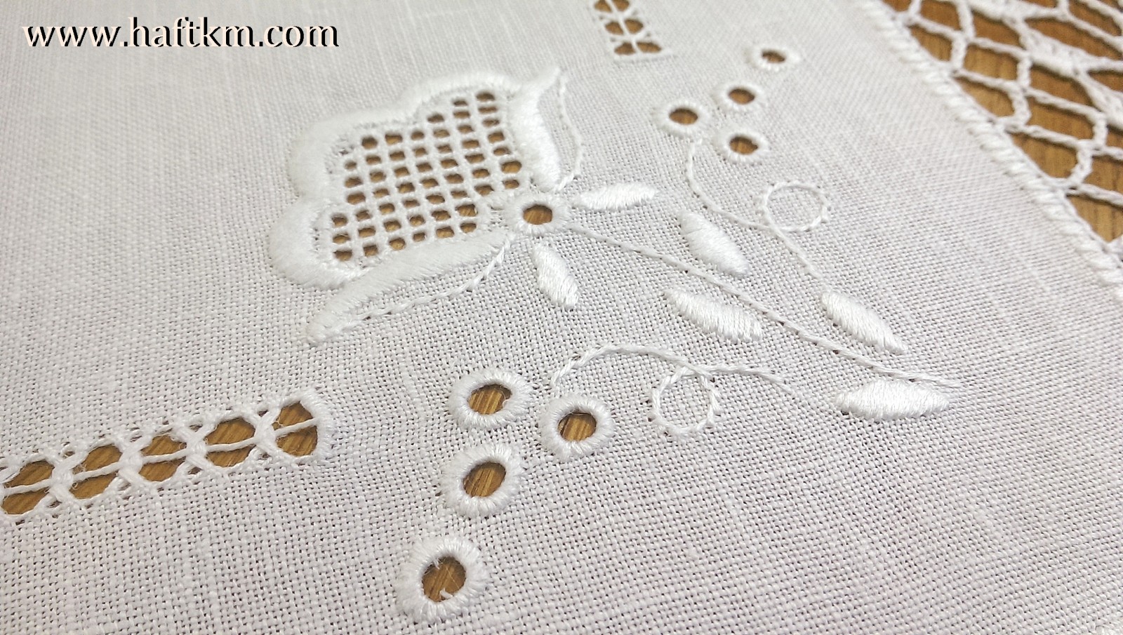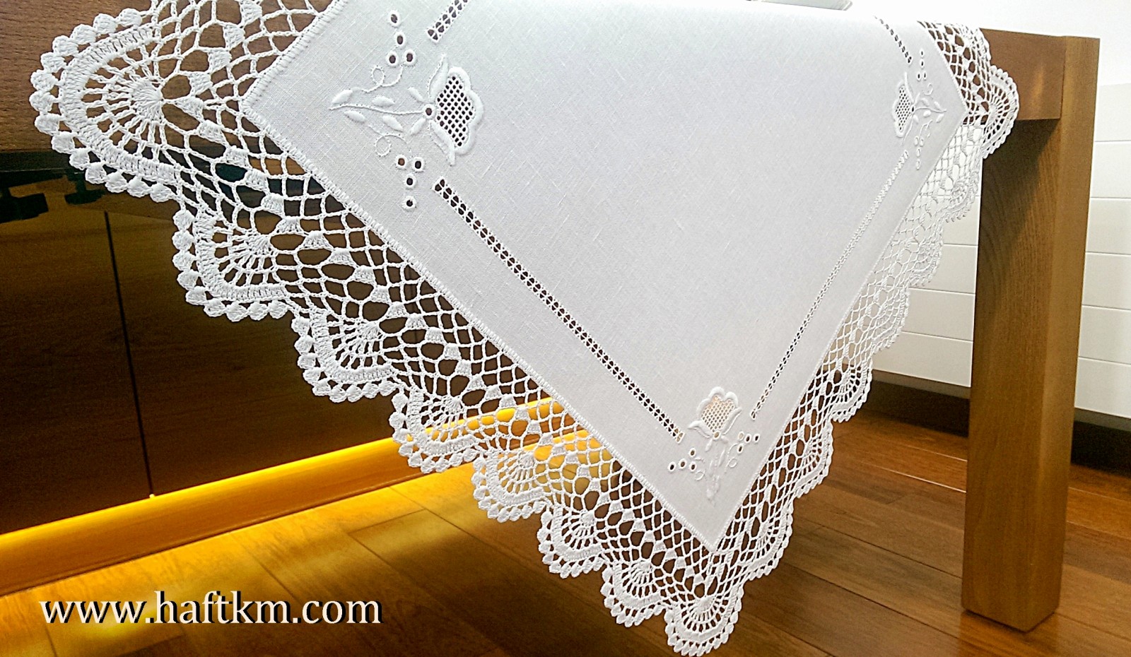 techniką hafciarską - haft wypukły, haft toledo. Serweta został misternie ozdobiony elegancką i estetyczną mereżką. Brzegi serwety ozdabia, elegancka koronka szydełkowa.