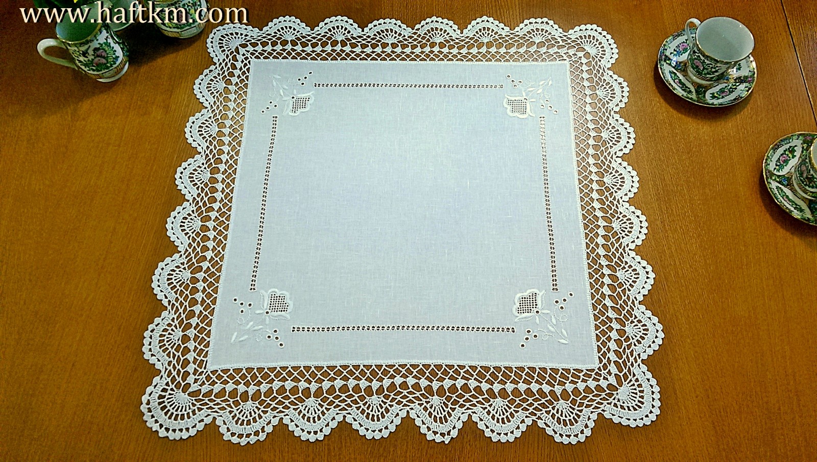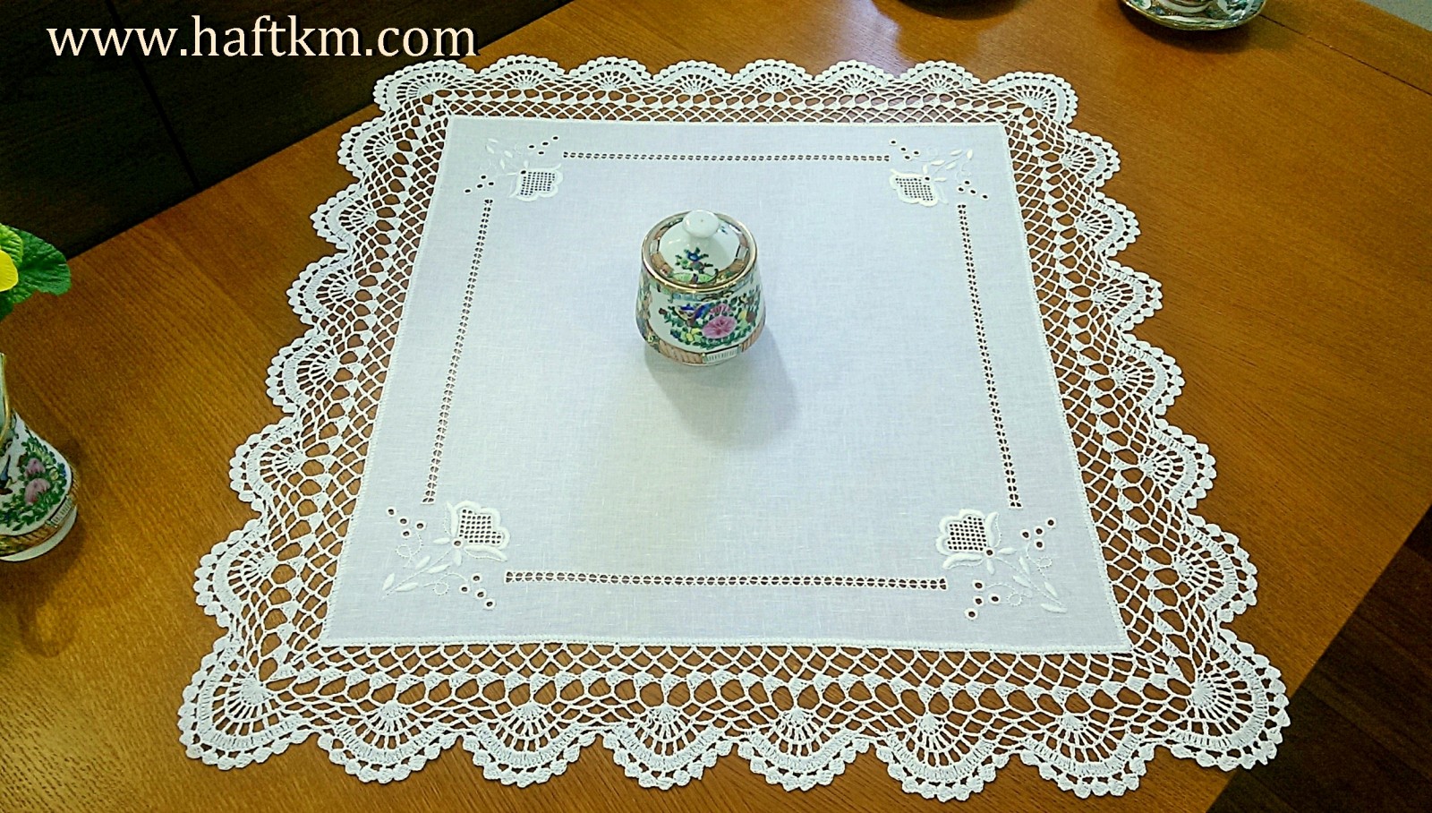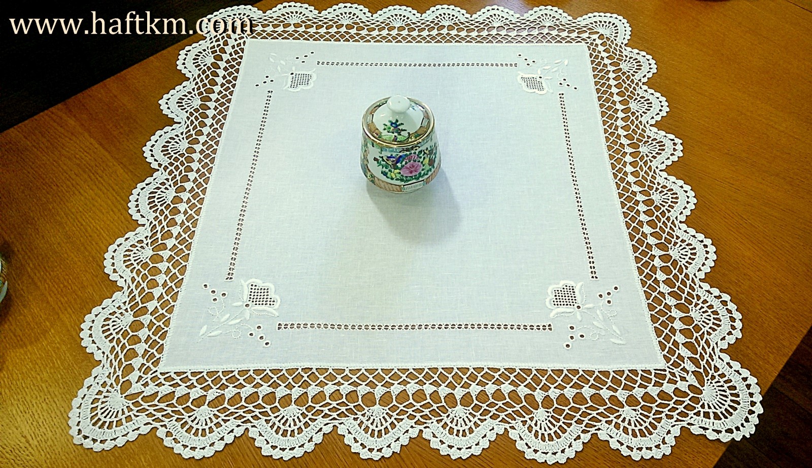 techniką hafciarską - haft wypukły, haft toledo. Serweta został misternie ozdobiony elegancką i estetyczną mereżką. Brzegi serwety ozdabia, elegancka koronka szydełkowa.
