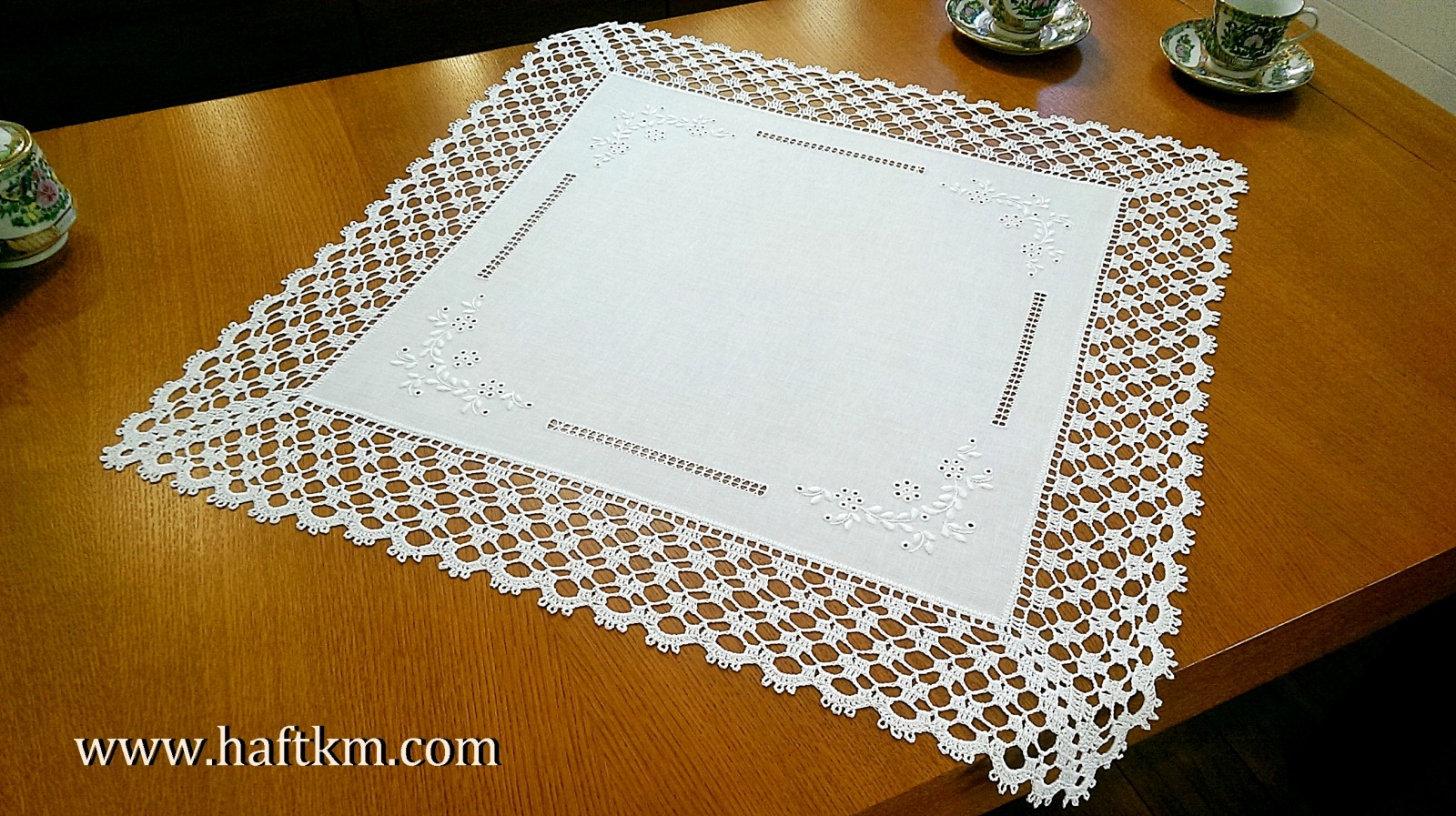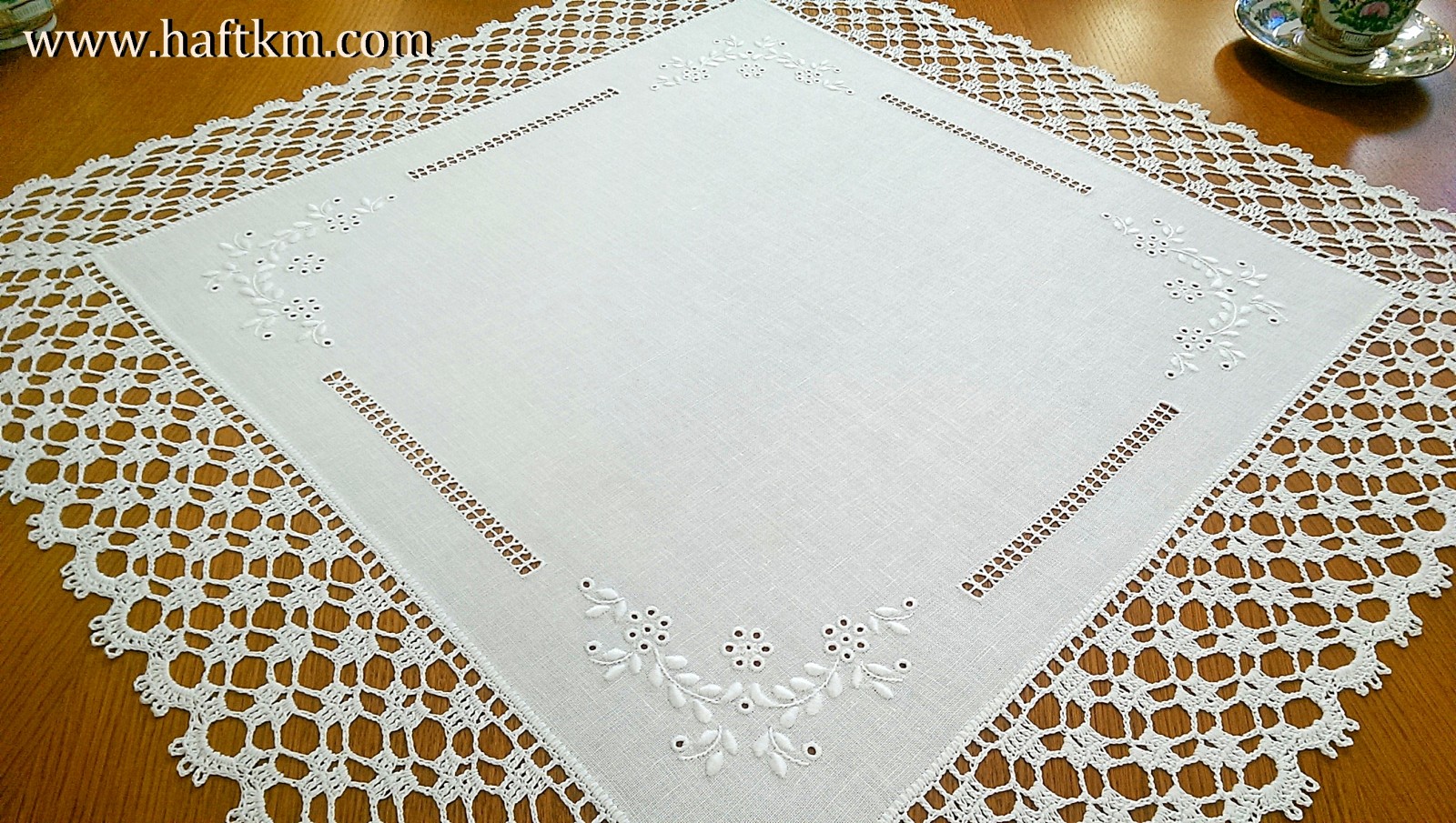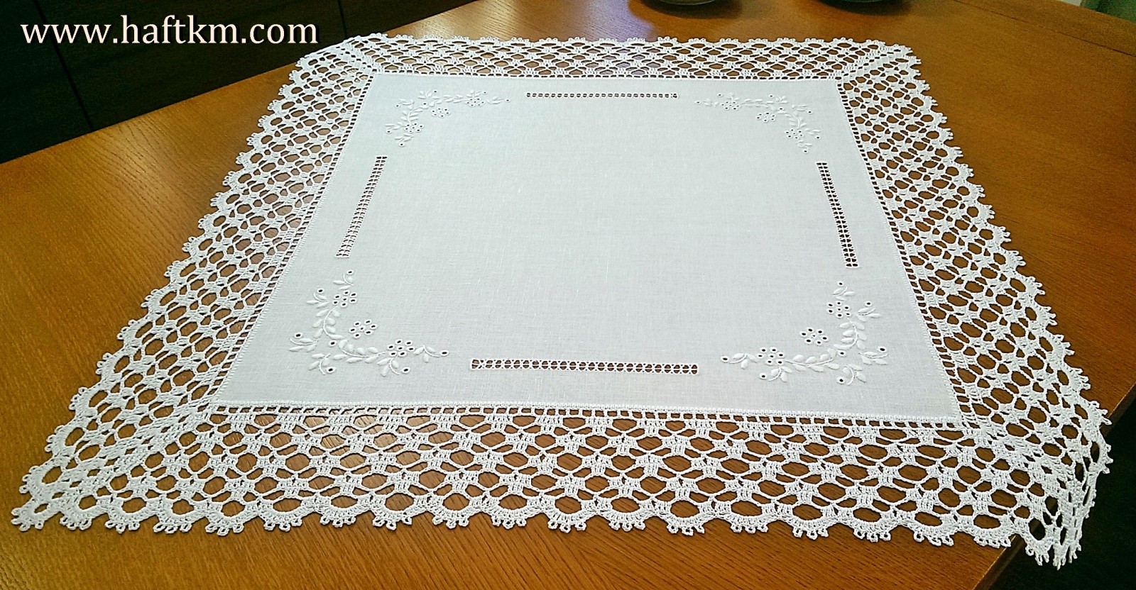 techniką hafciarską, haft angielski. Ponadto serweta została misternie ozdobiona elegancką i misterną koronką szydełkową.