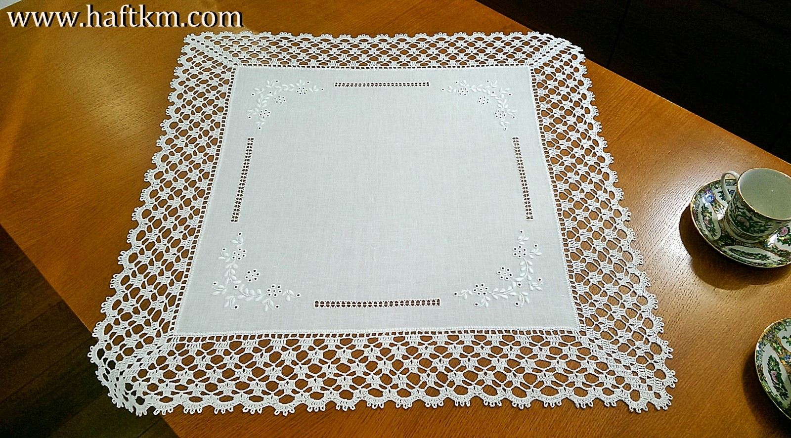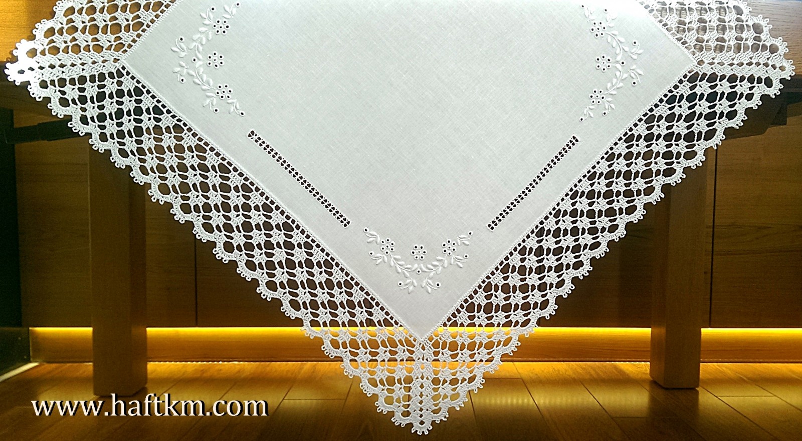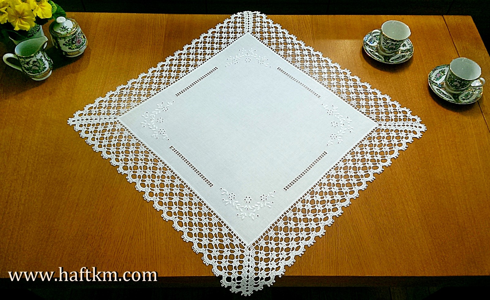 techniką hafciarską, haft angielski. Ponadto serweta została misternie ozdobiona elegancką i misterną koronką szydełkową.
