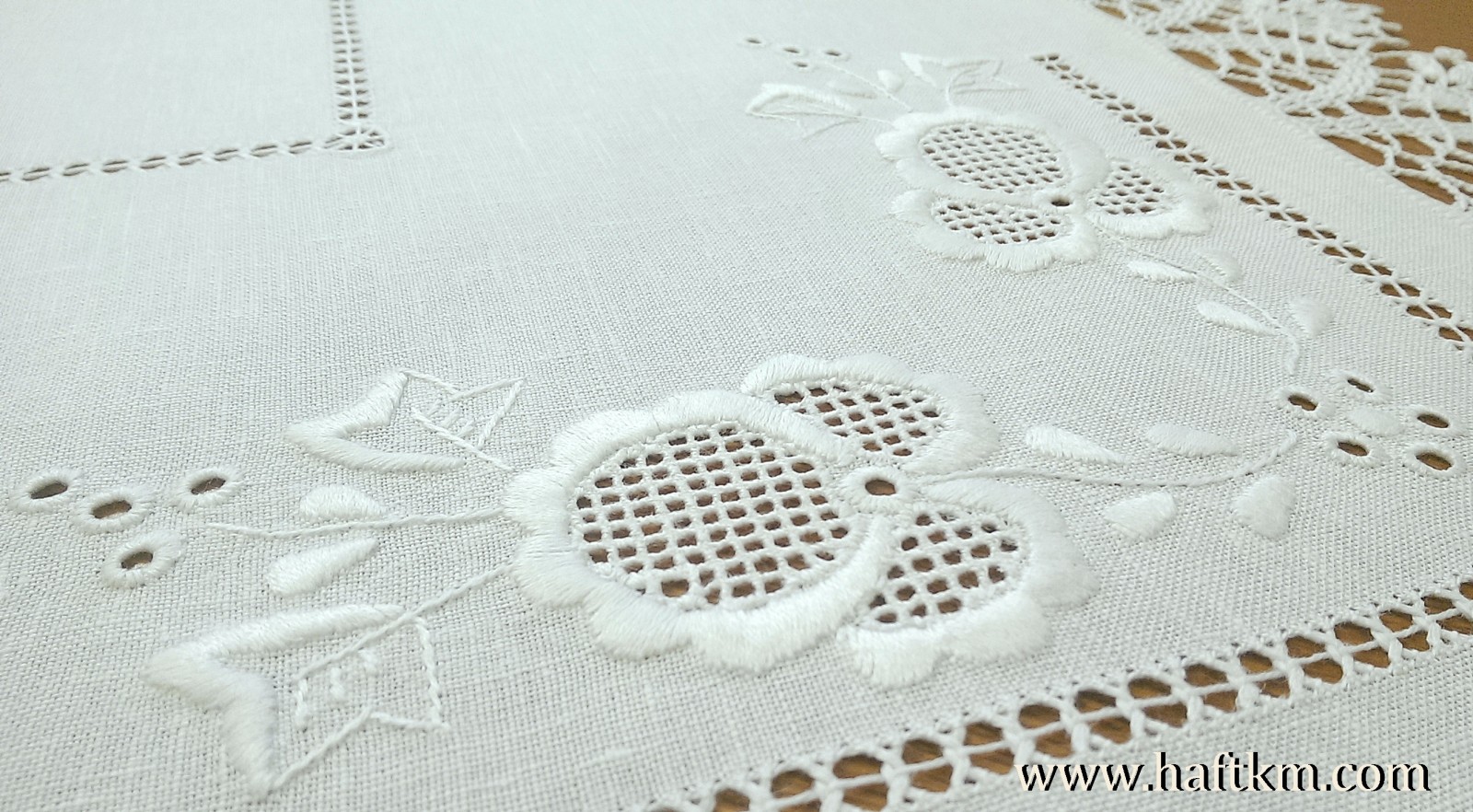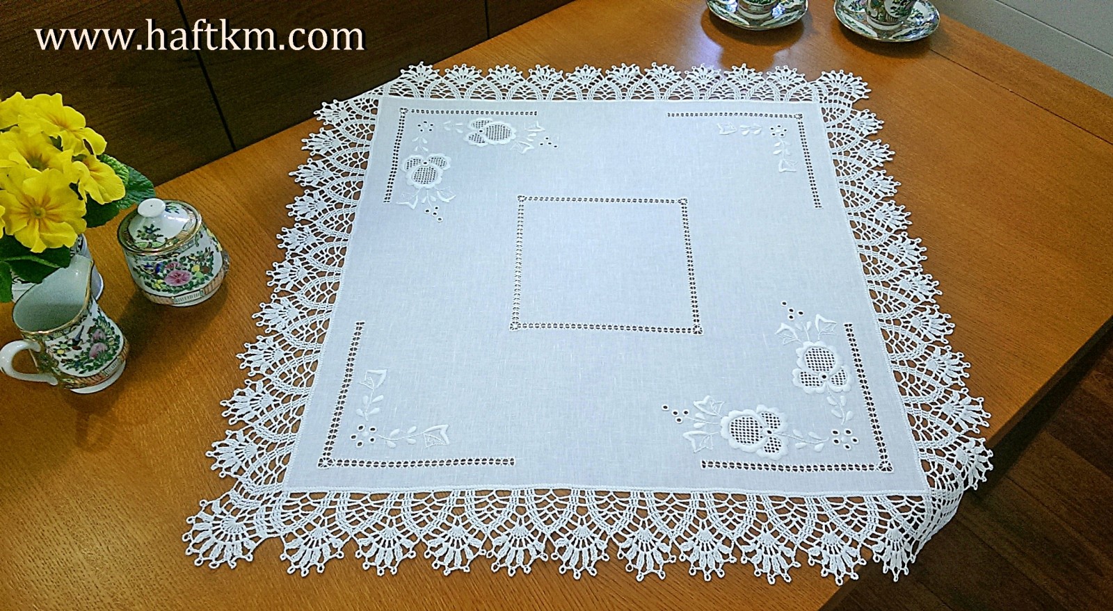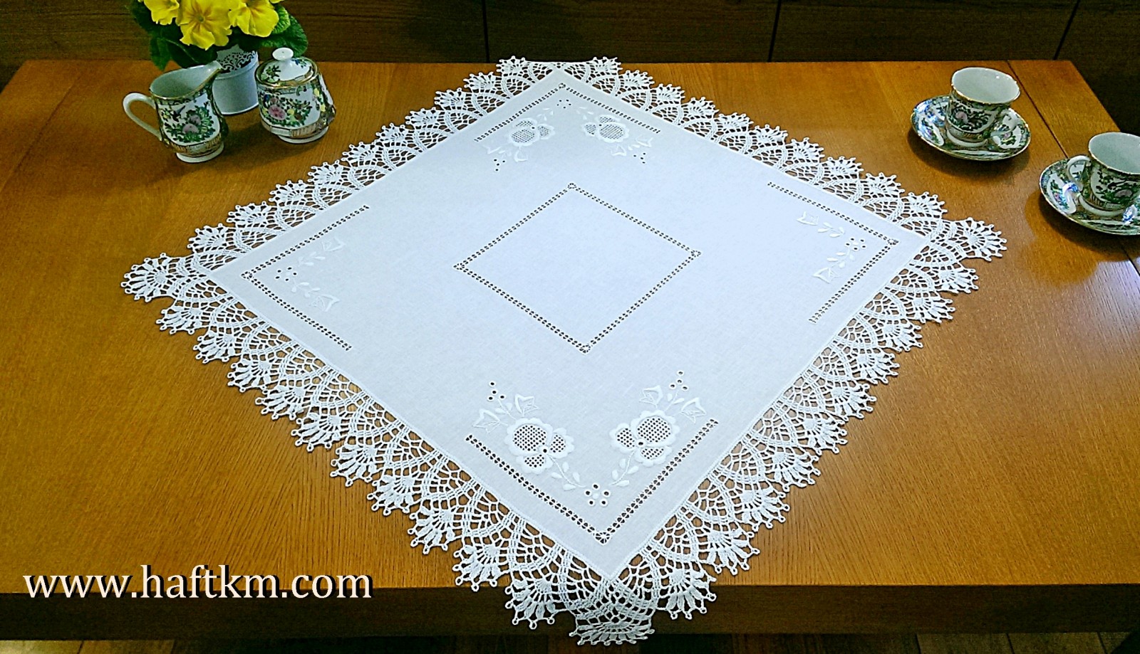 techniką hafciarską - haft wypukły, haft toledo. Serweta został misternie ozdobiony elegancką i estetyczną mereżką. Brzegi serwety ozdabia, elegancka koronka szydełkowa.