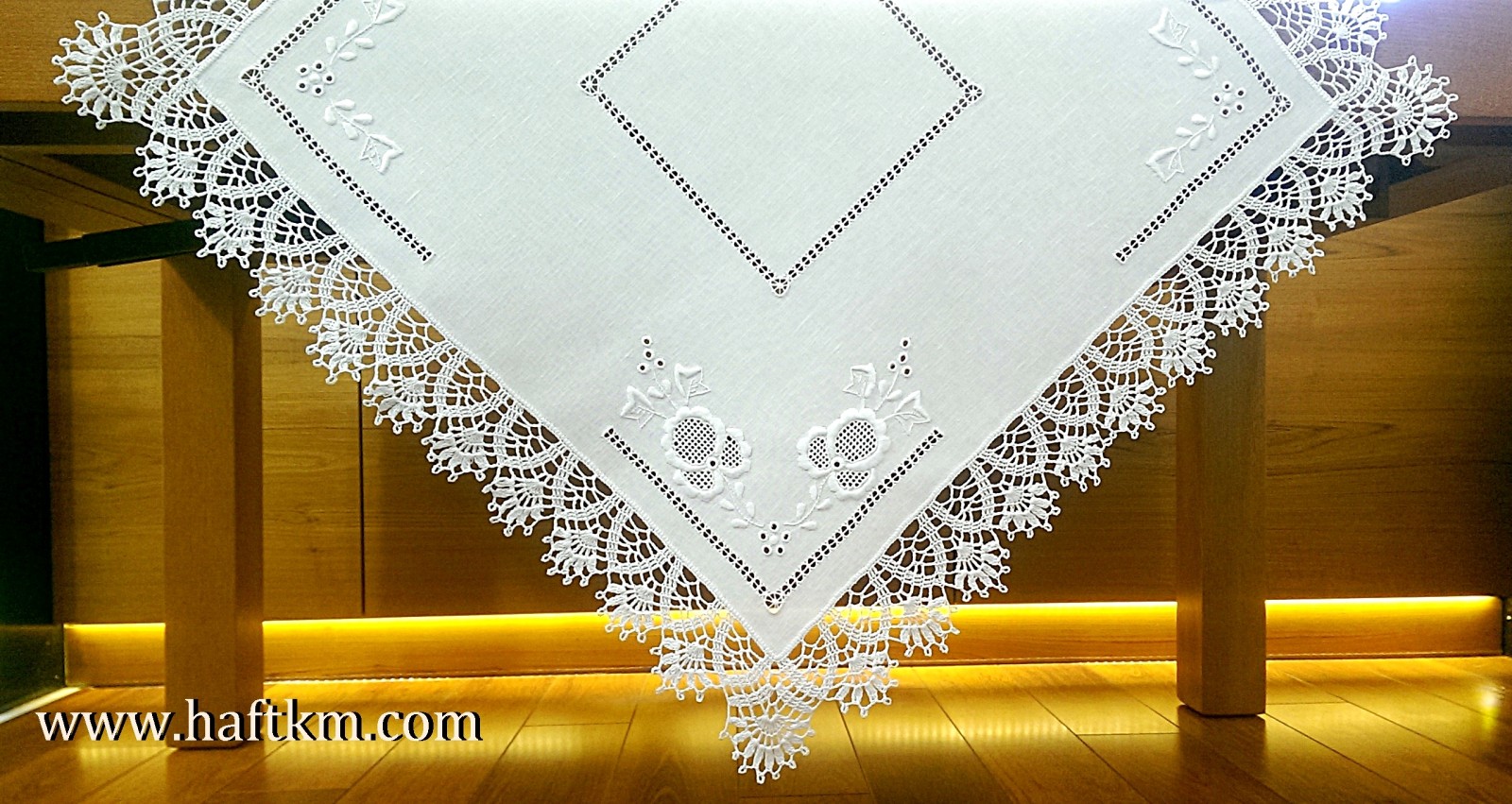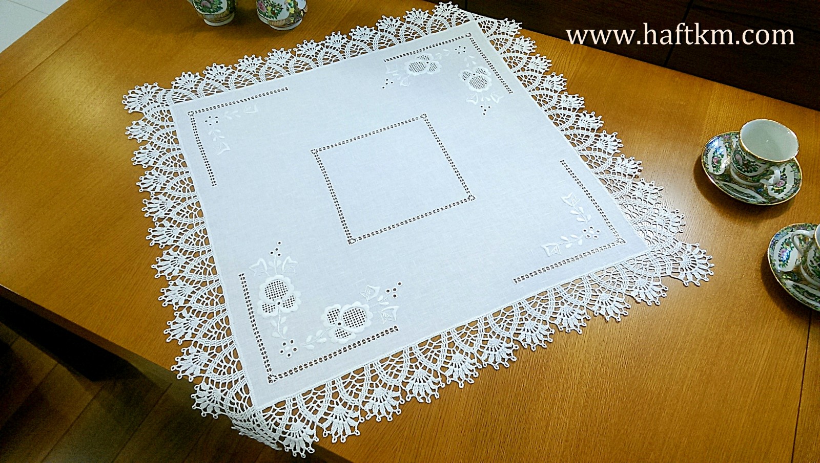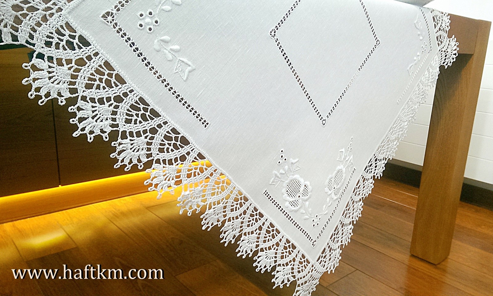 techniką hafciarską - haft wypukły, haft toledo. Serweta został misternie ozdobiony elegancką i estetyczną mereżką. Brzegi serwety ozdabia, elegancka koronka szydełkowa.