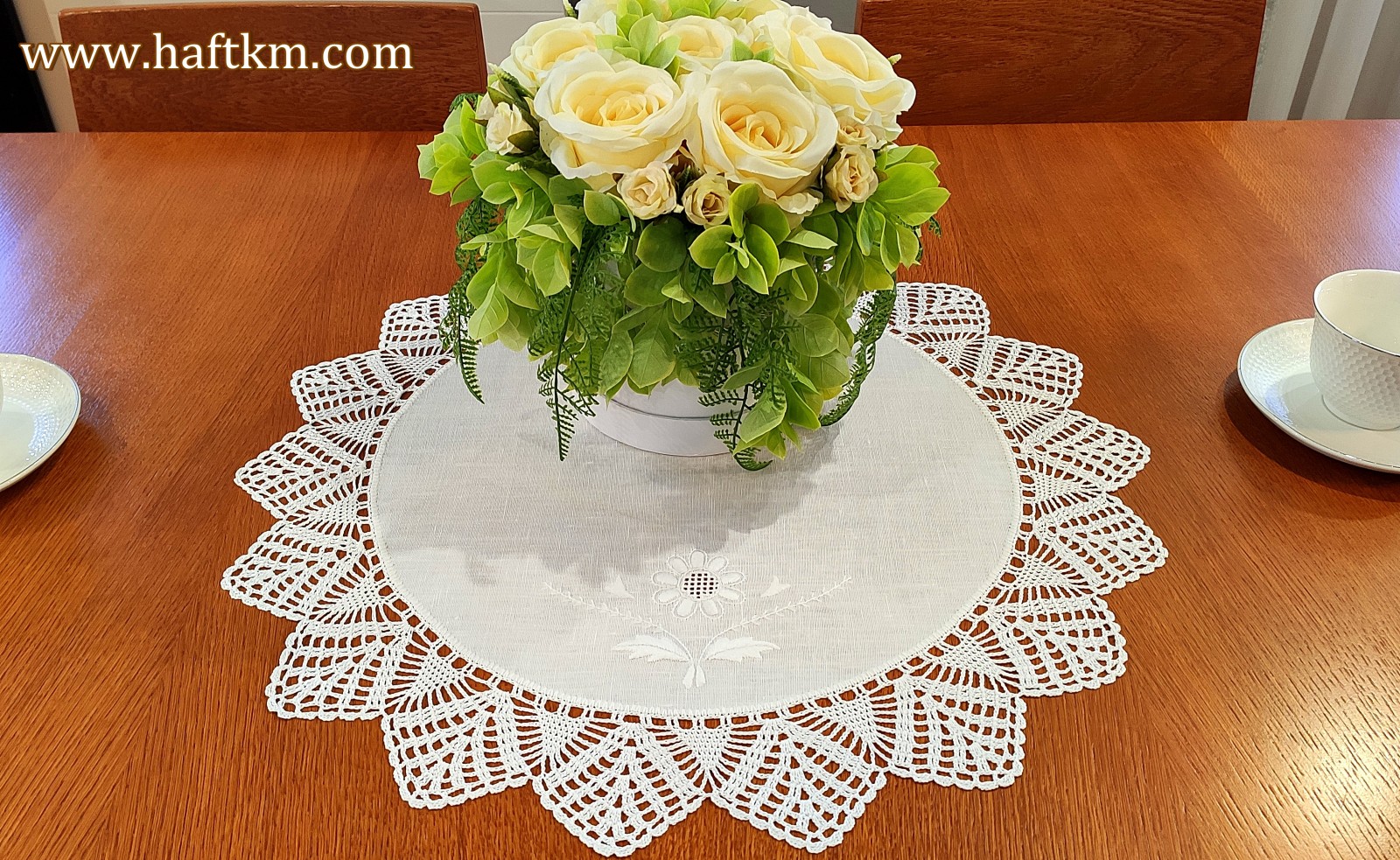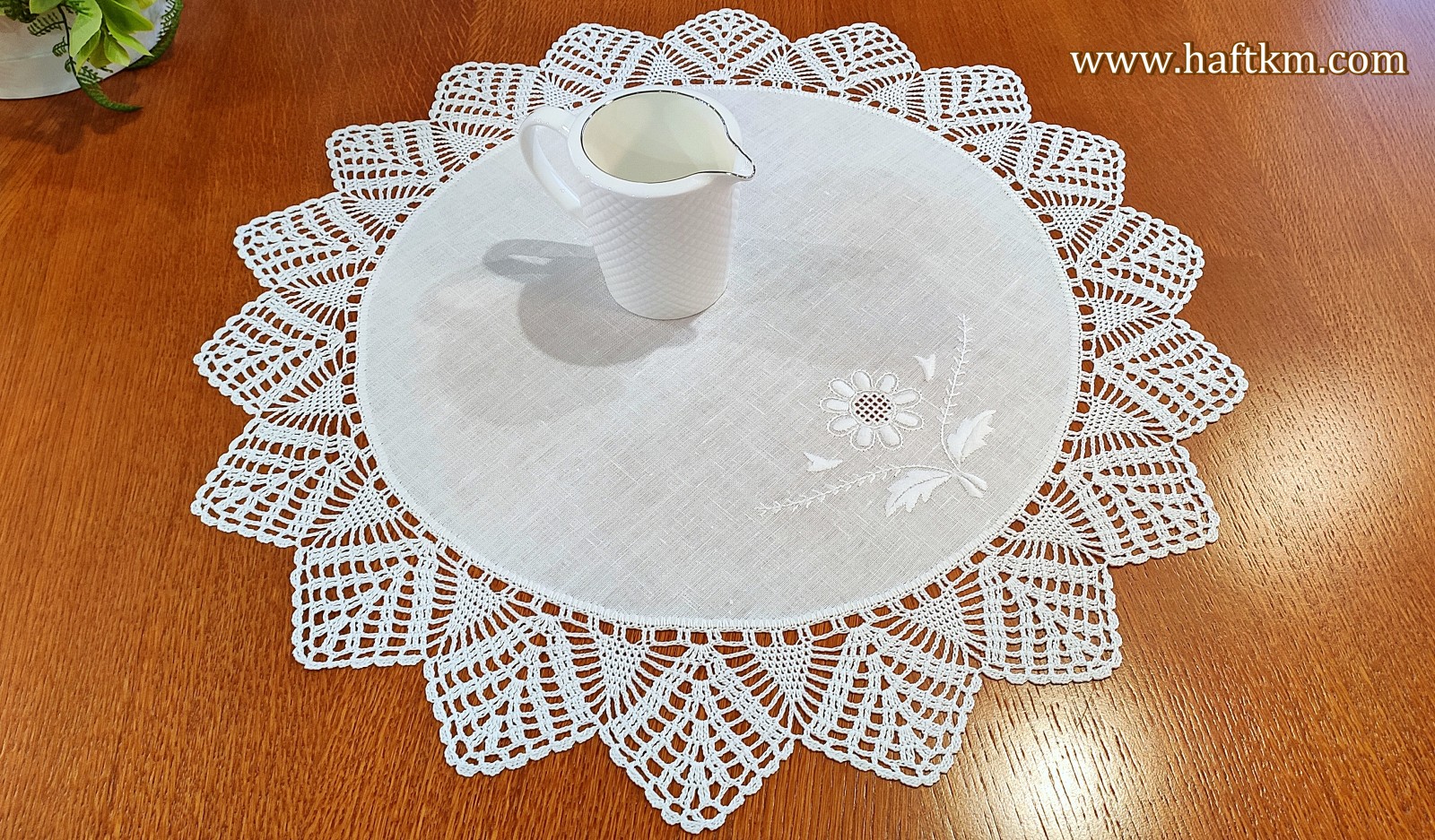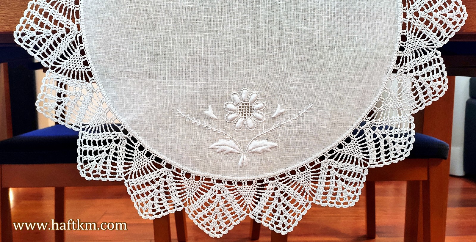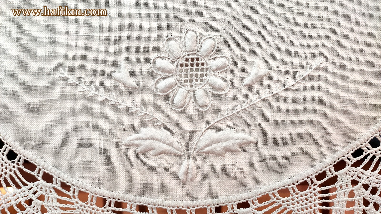techniką hafciarską, haft wypukły. Ponadto serweta została misternie ozdobiona elegancką i misterną koronką szydełkową.