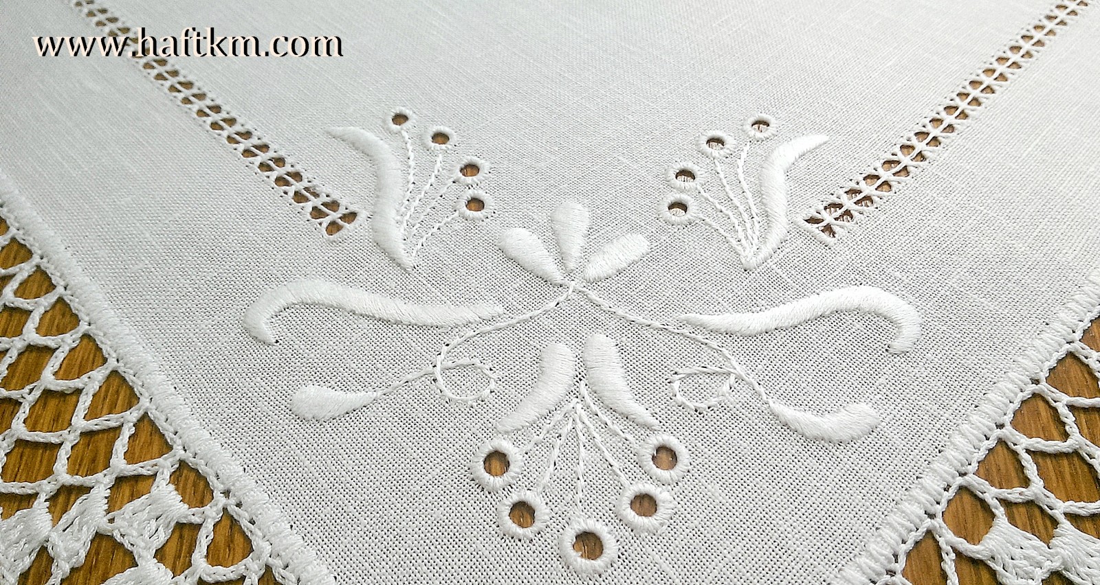 techniką hafciarską, haft wypukły. Ponadto serweta została misternie ozdobiona elegancką i misterną koronką szydełkową.