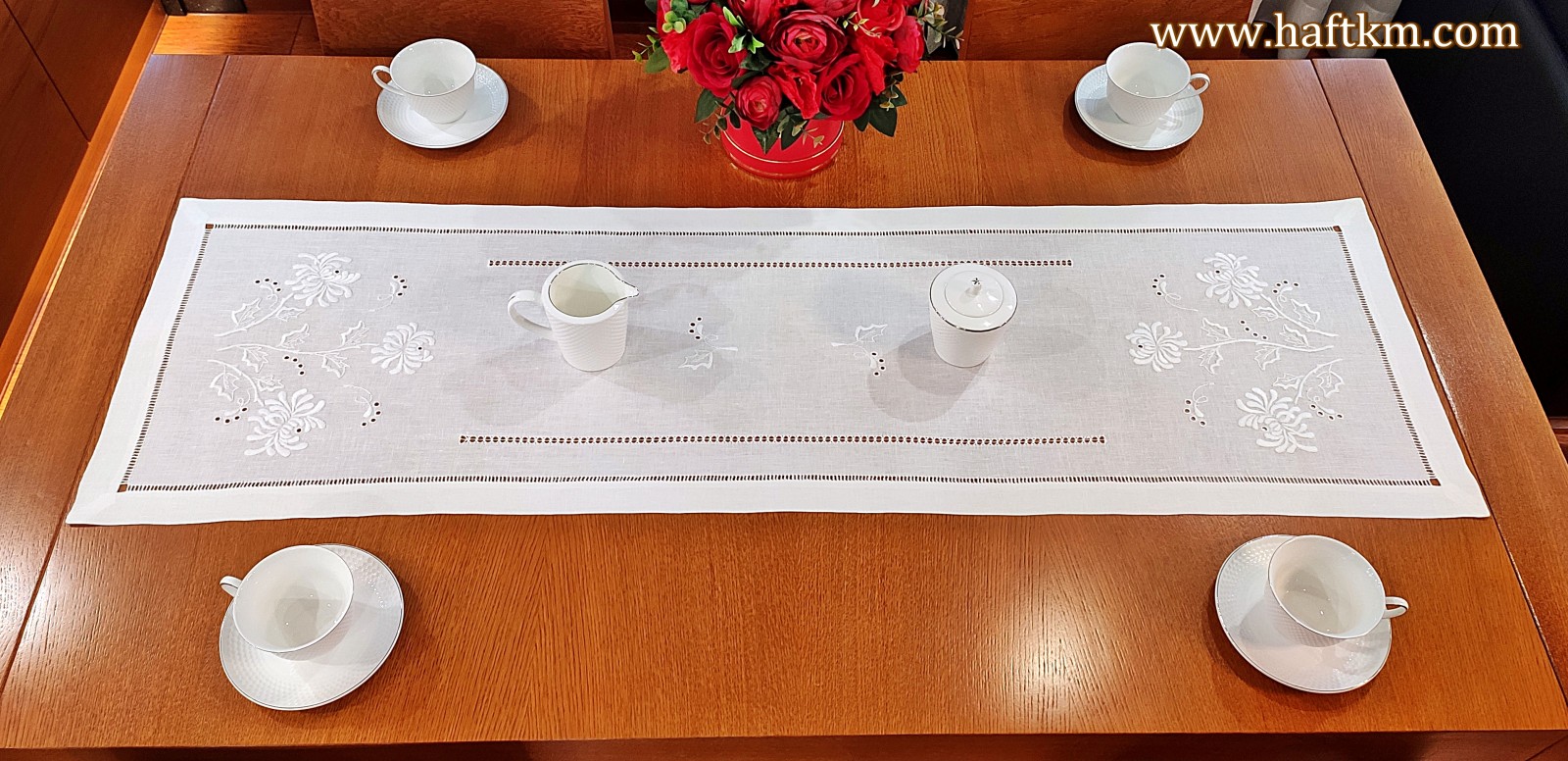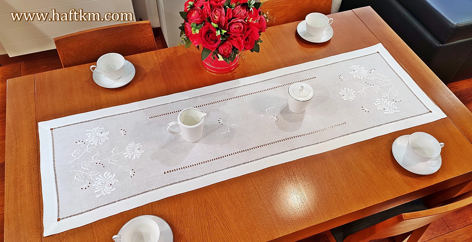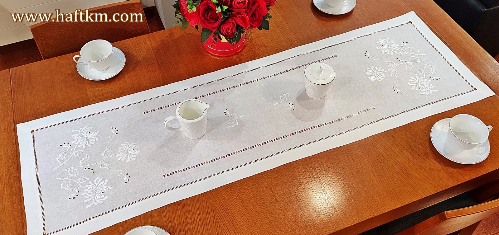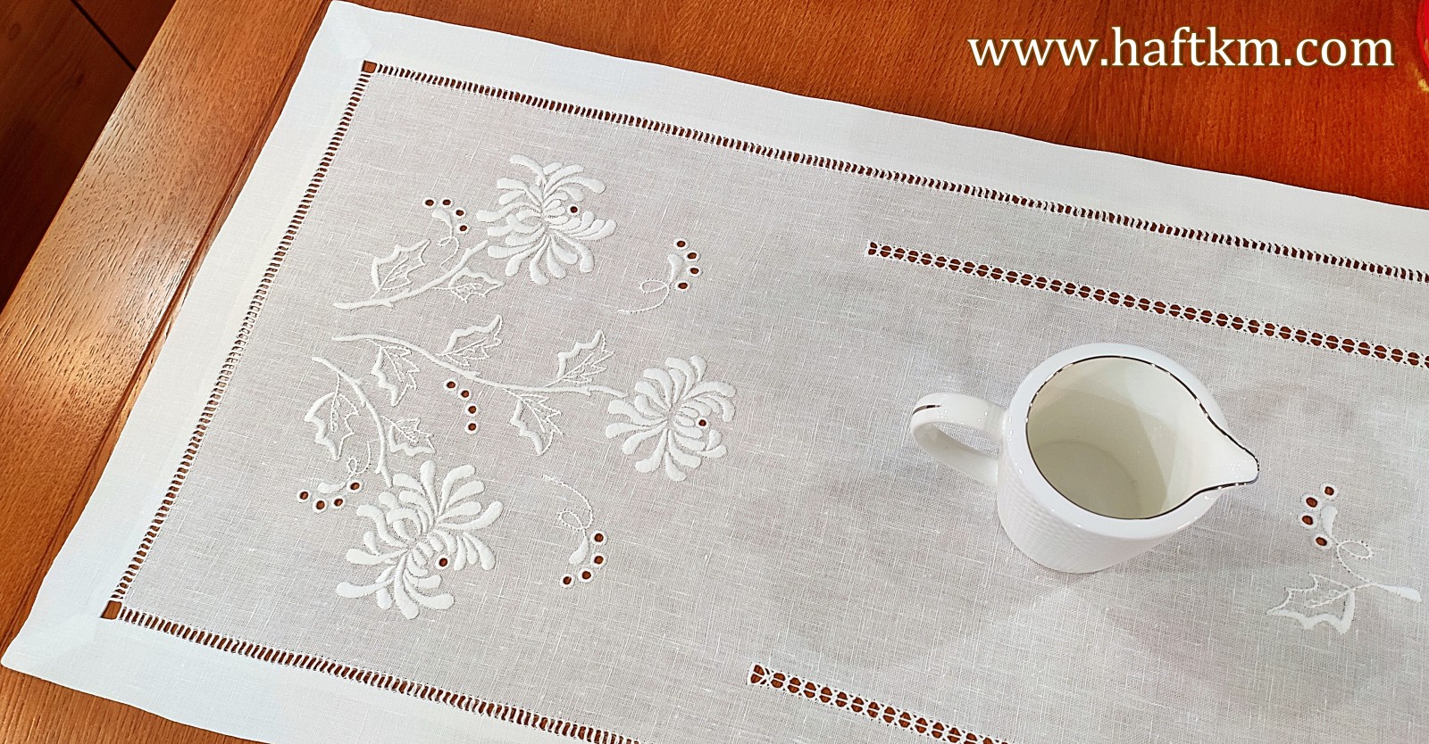 Technika hafciarską - haft wypukły, mereżka. Ponadto bieżnik został misternie ozdobiony elegancka i estetyczna mereżką.