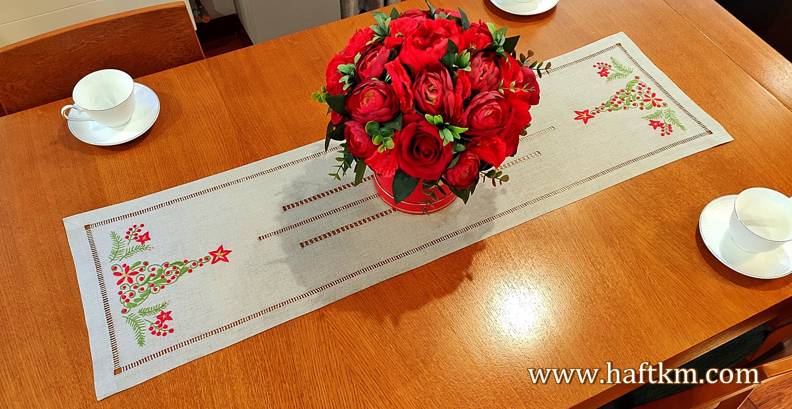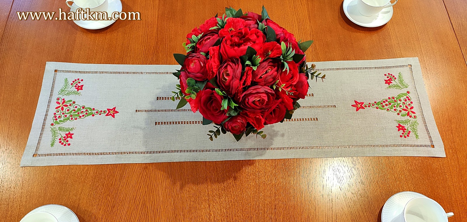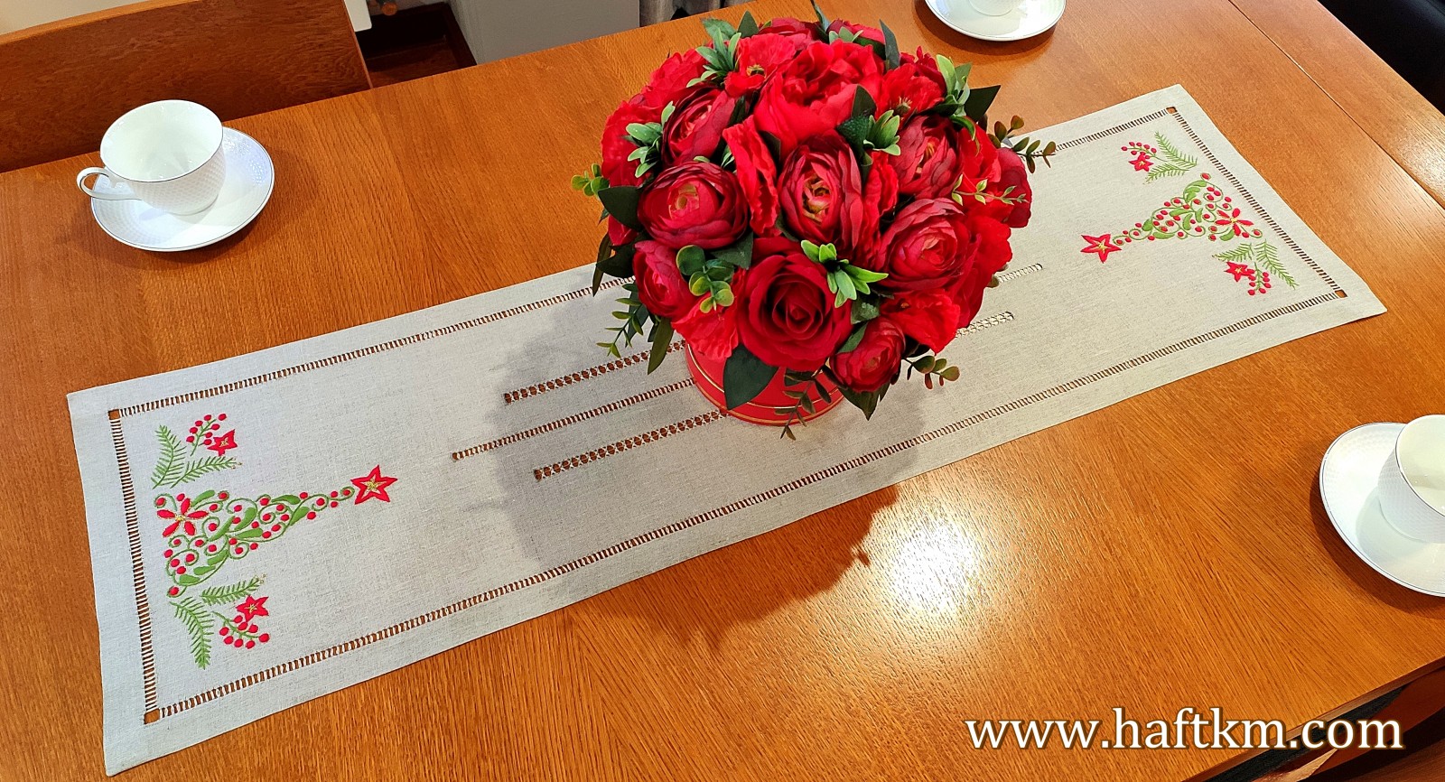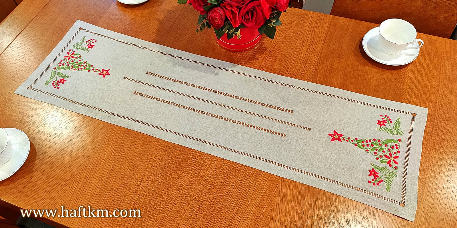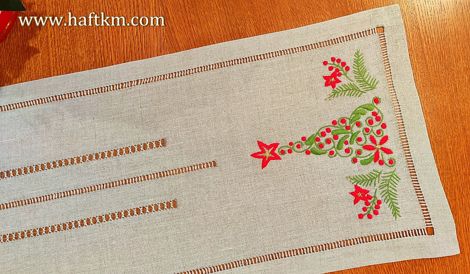 Ponadto bieżnik został misternie ozdobiony elegancką i estetyczną mereżką.