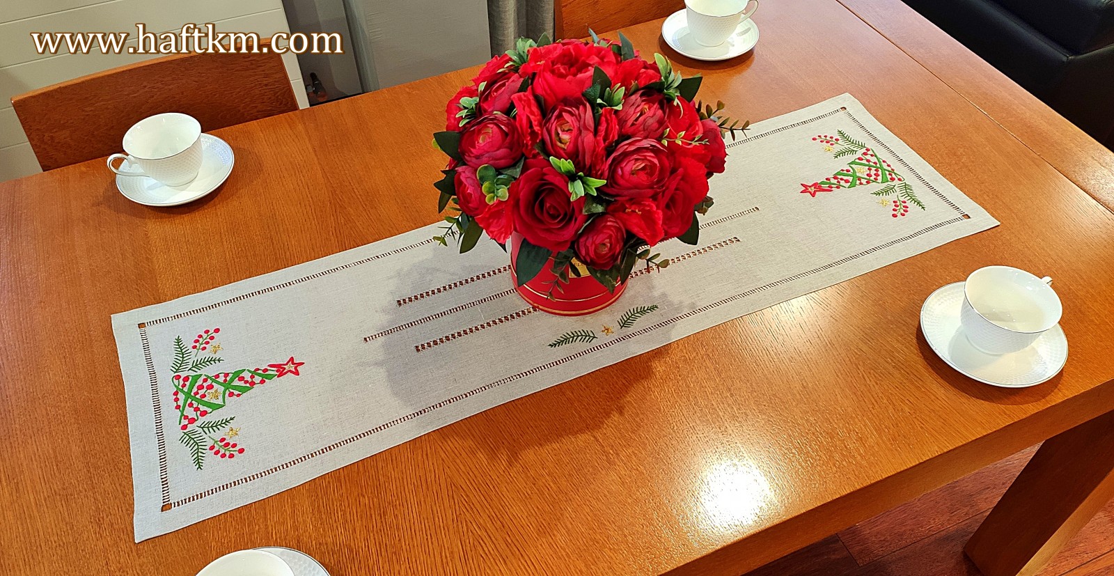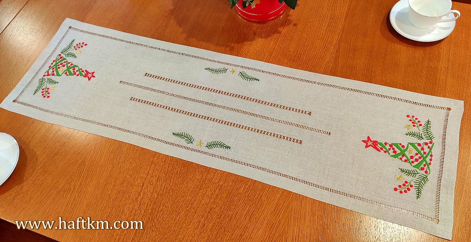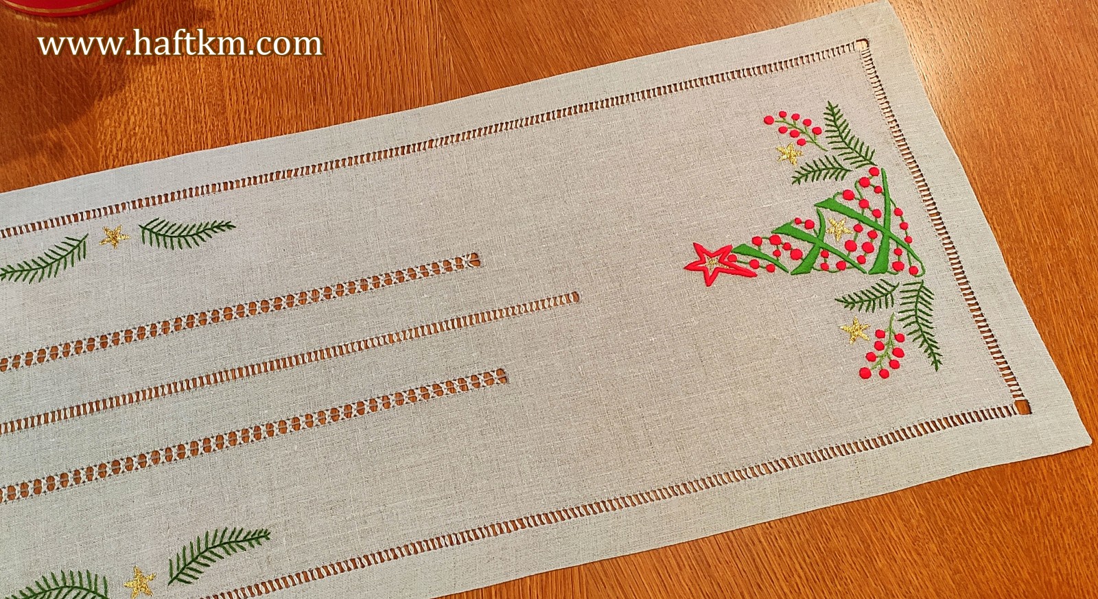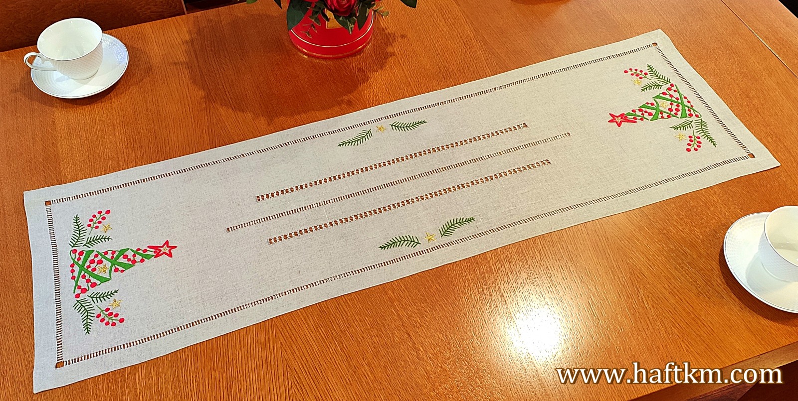 Ponadto bieżnik został misternie ozdobiony elegancką i estetyczną mereżką.