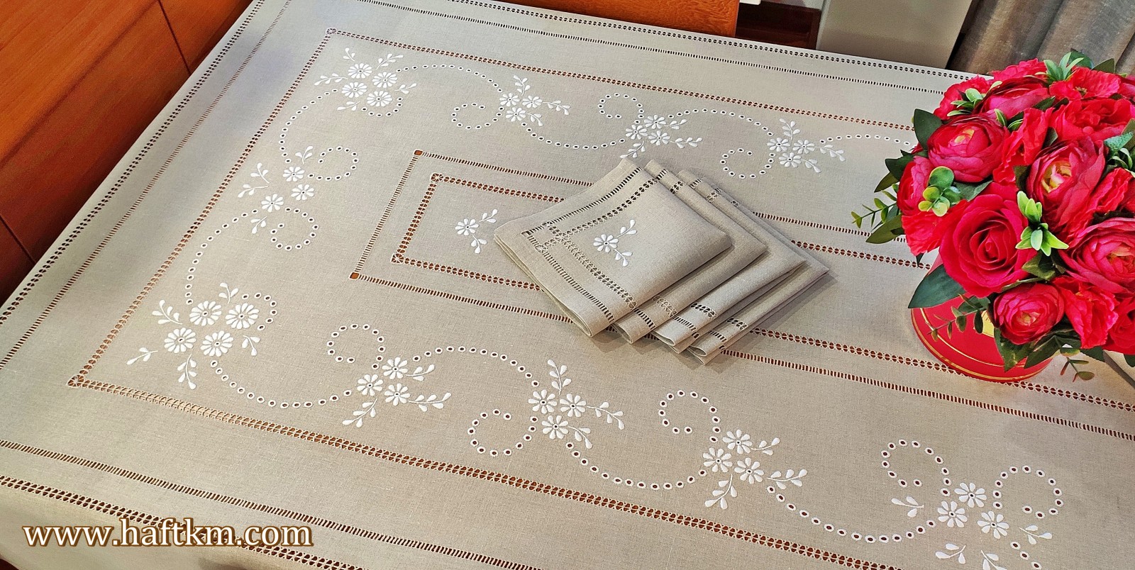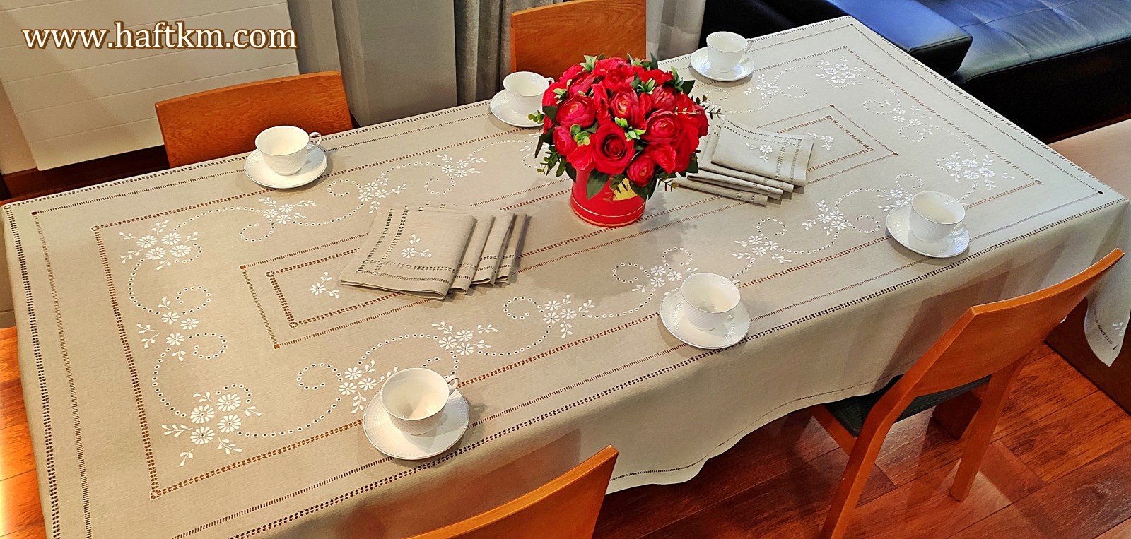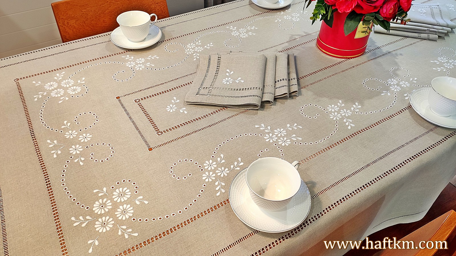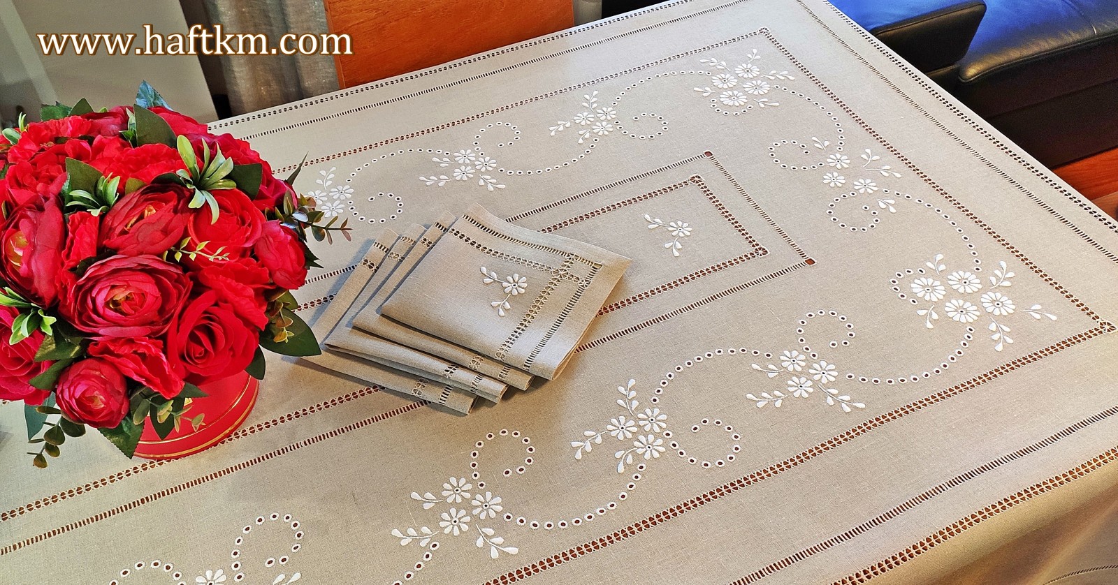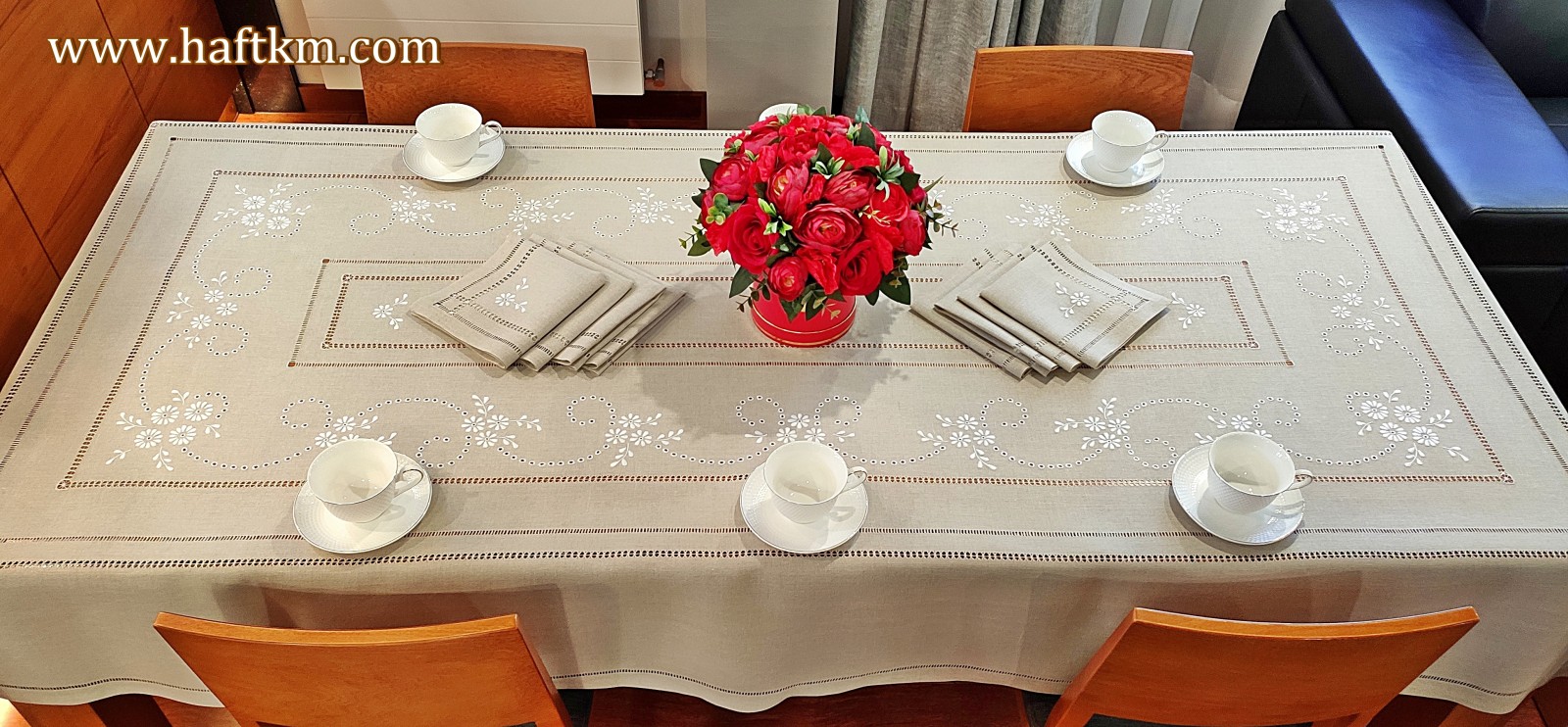 Komplet składa się z obrusa i osmiu serwetek.