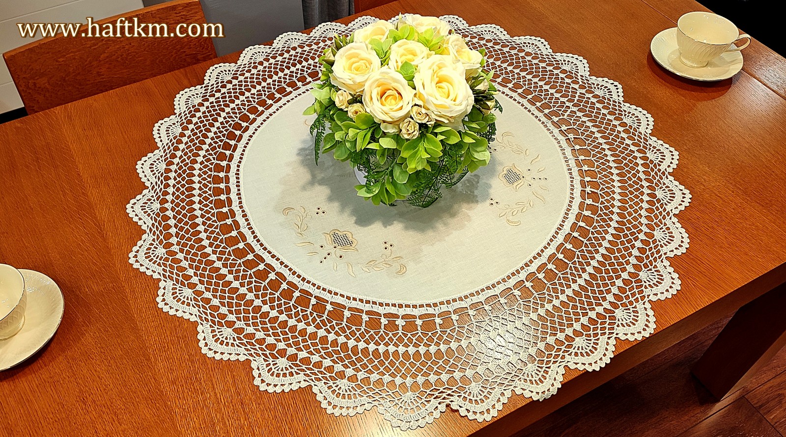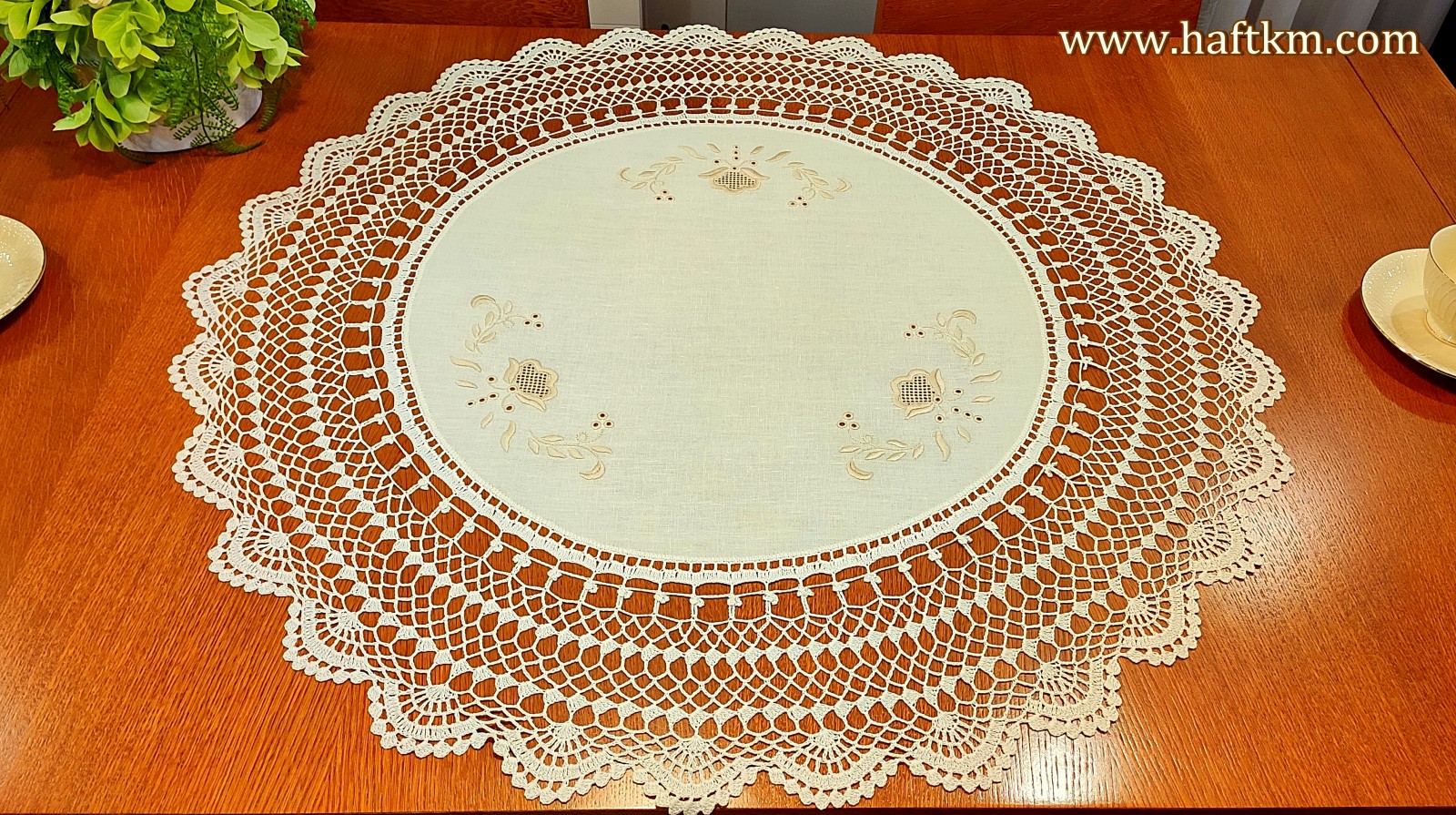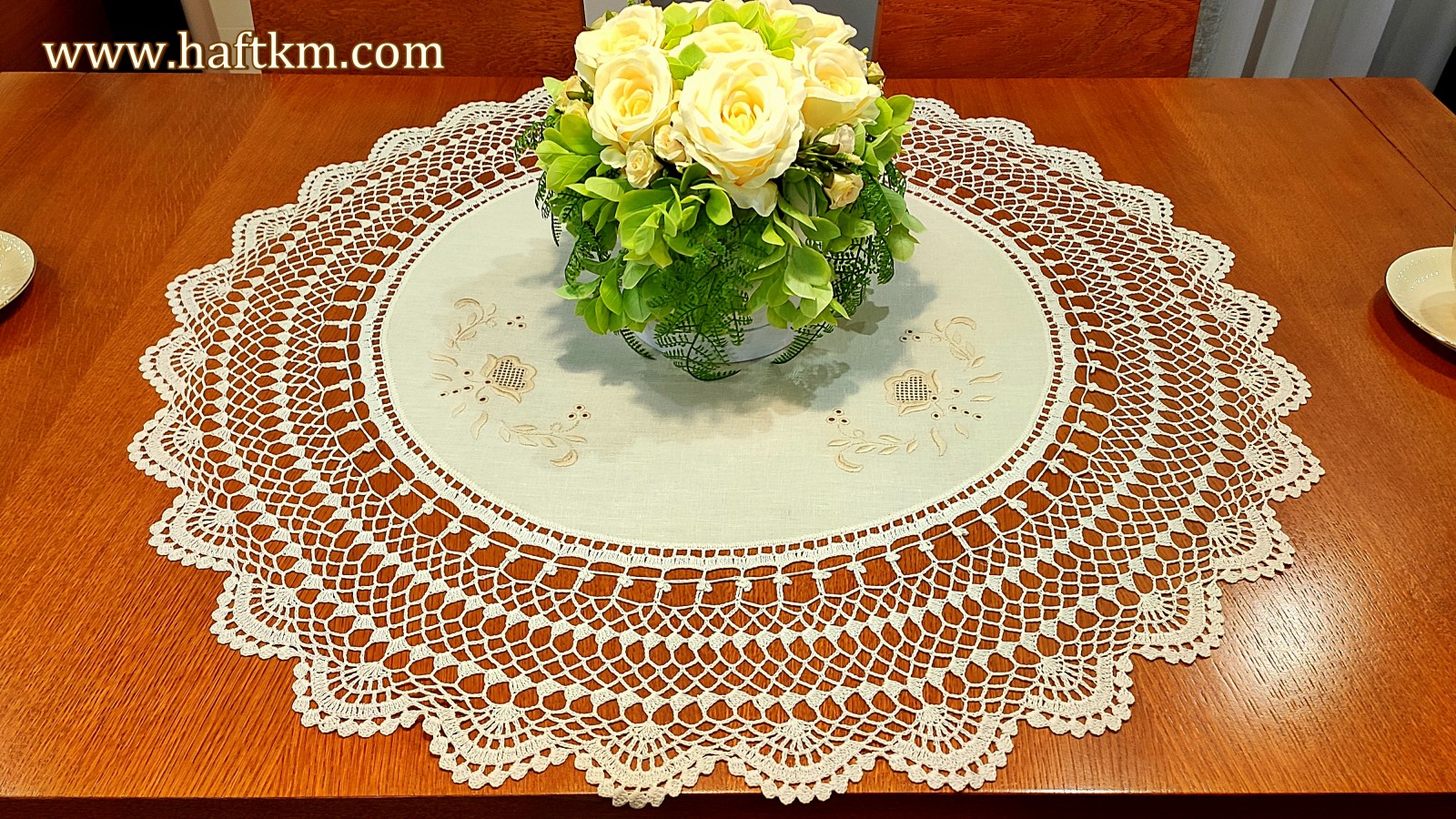 techniką hafciarską, haft wypukły, haft toledo. Ponadto obrus został misternie ozdobiona elegancką i misterną koronką szydełkową.