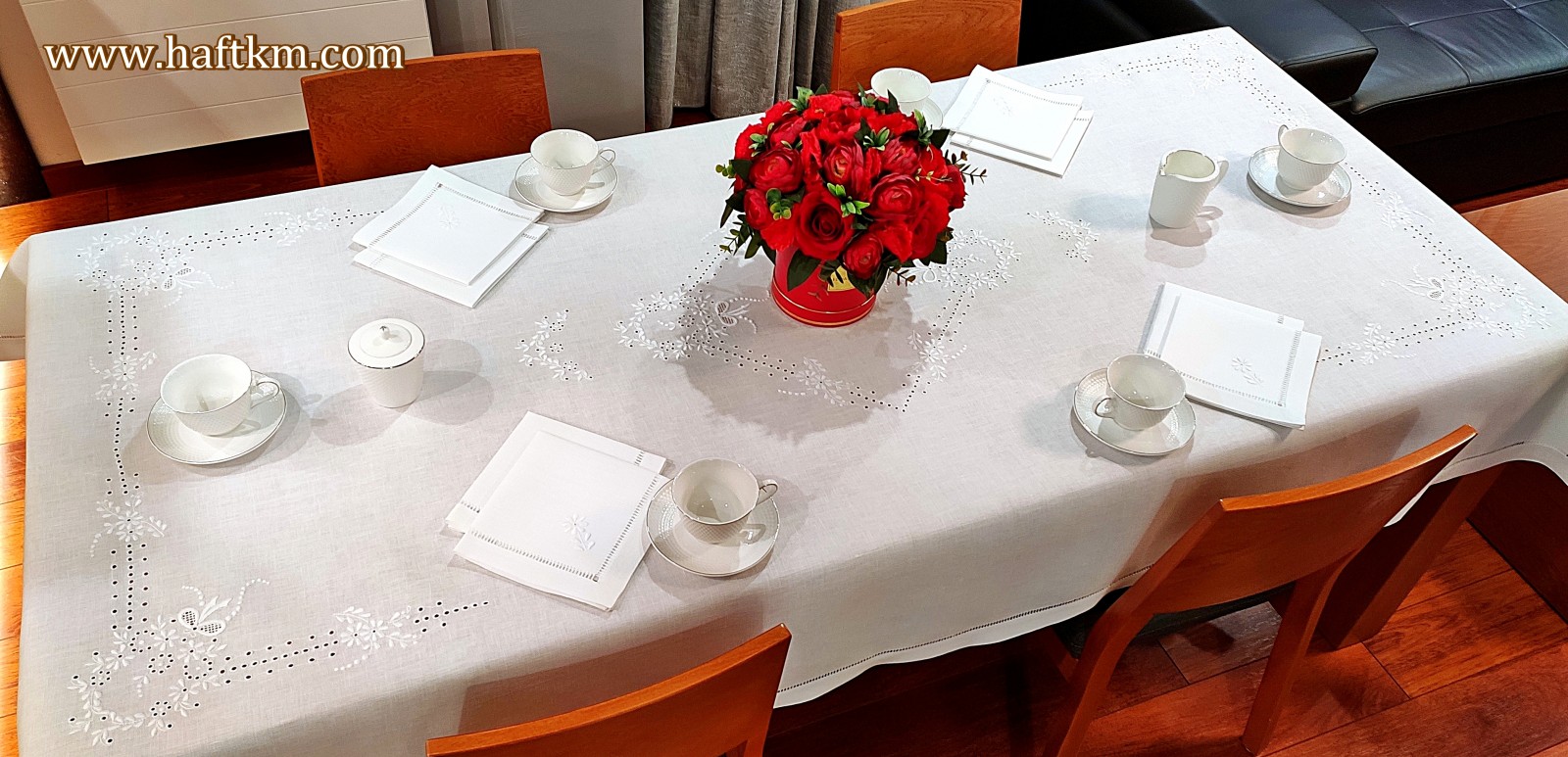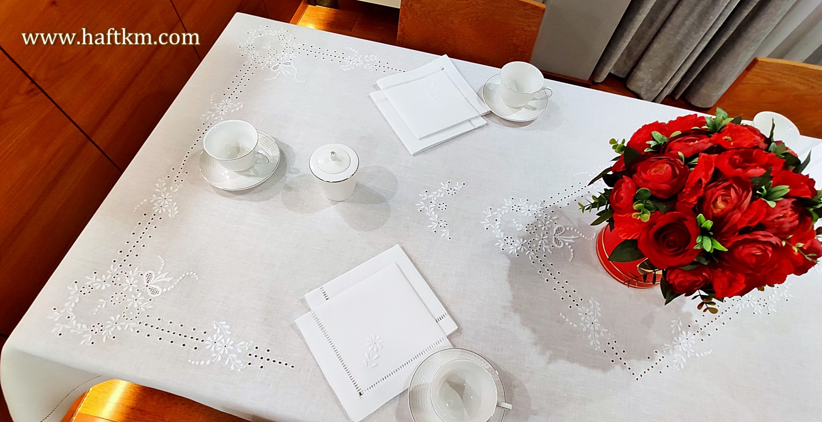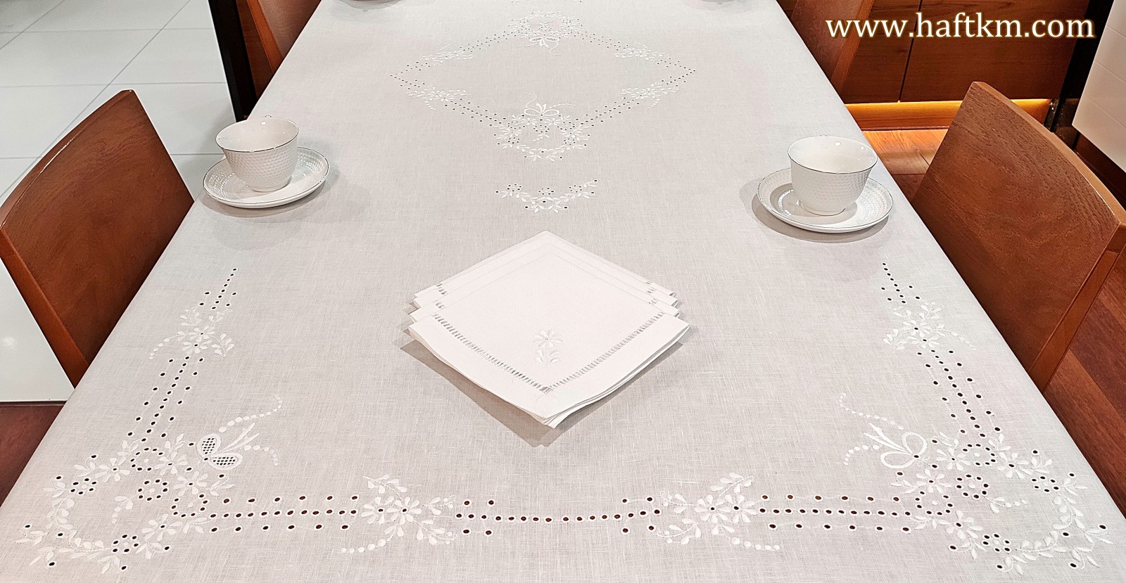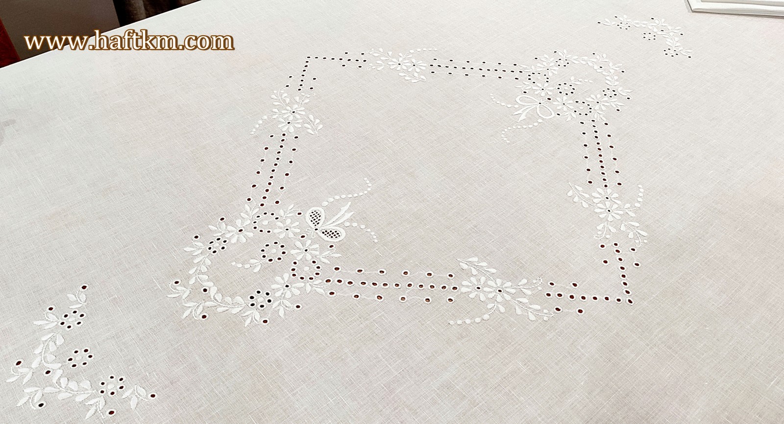 techniką hafciarską - haft angielski, haft toledo. Ponadto obrus został misternie ozdobiony elegancką i estetyczną mereżką.