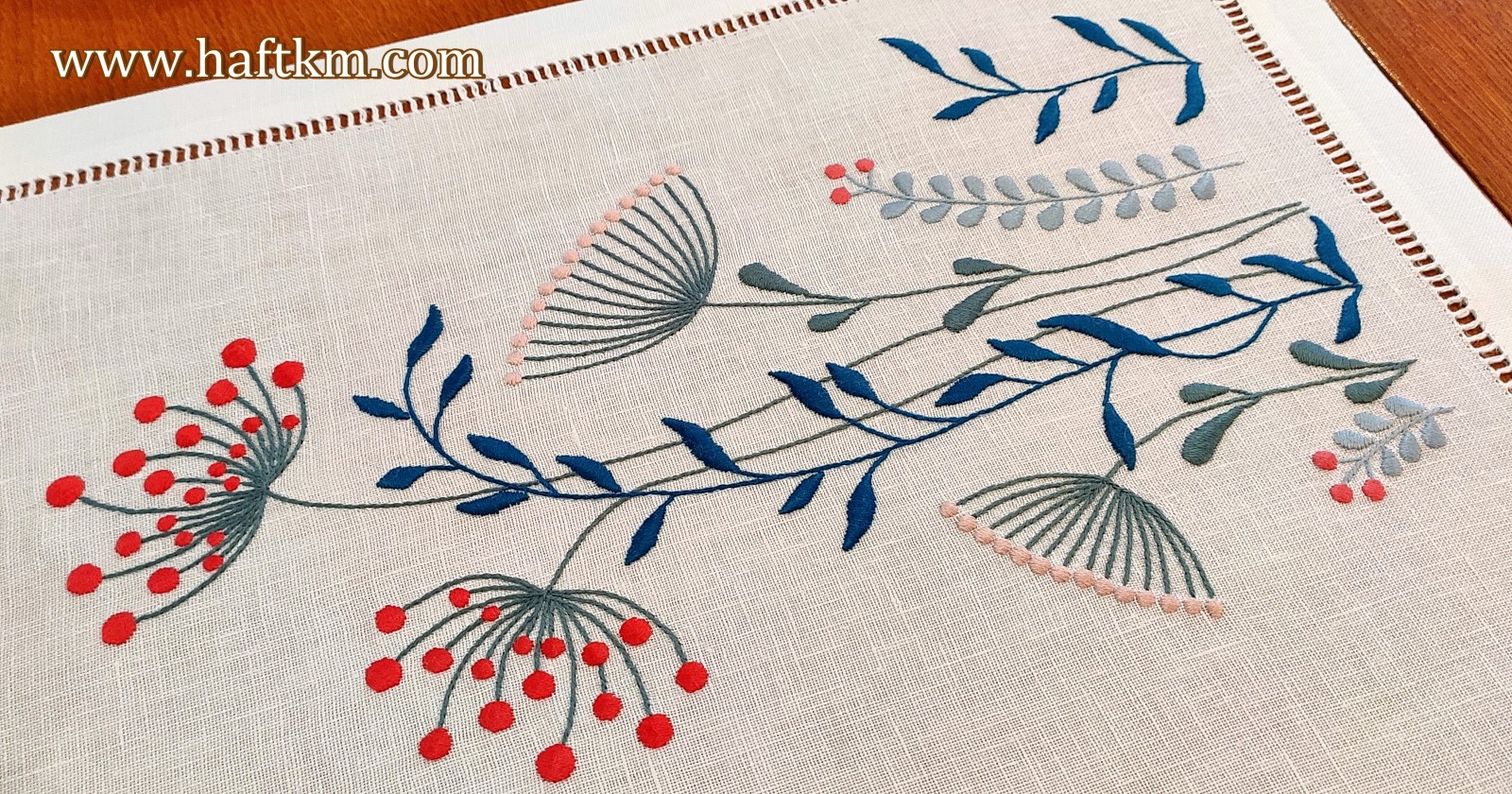 Technika wykonania: haft wypukły, mereżka wiązana i mereżka prosta.