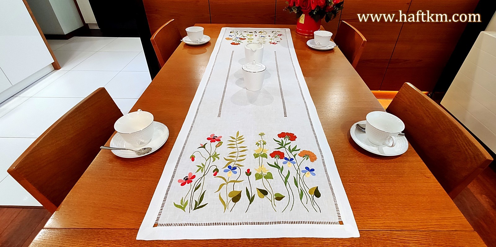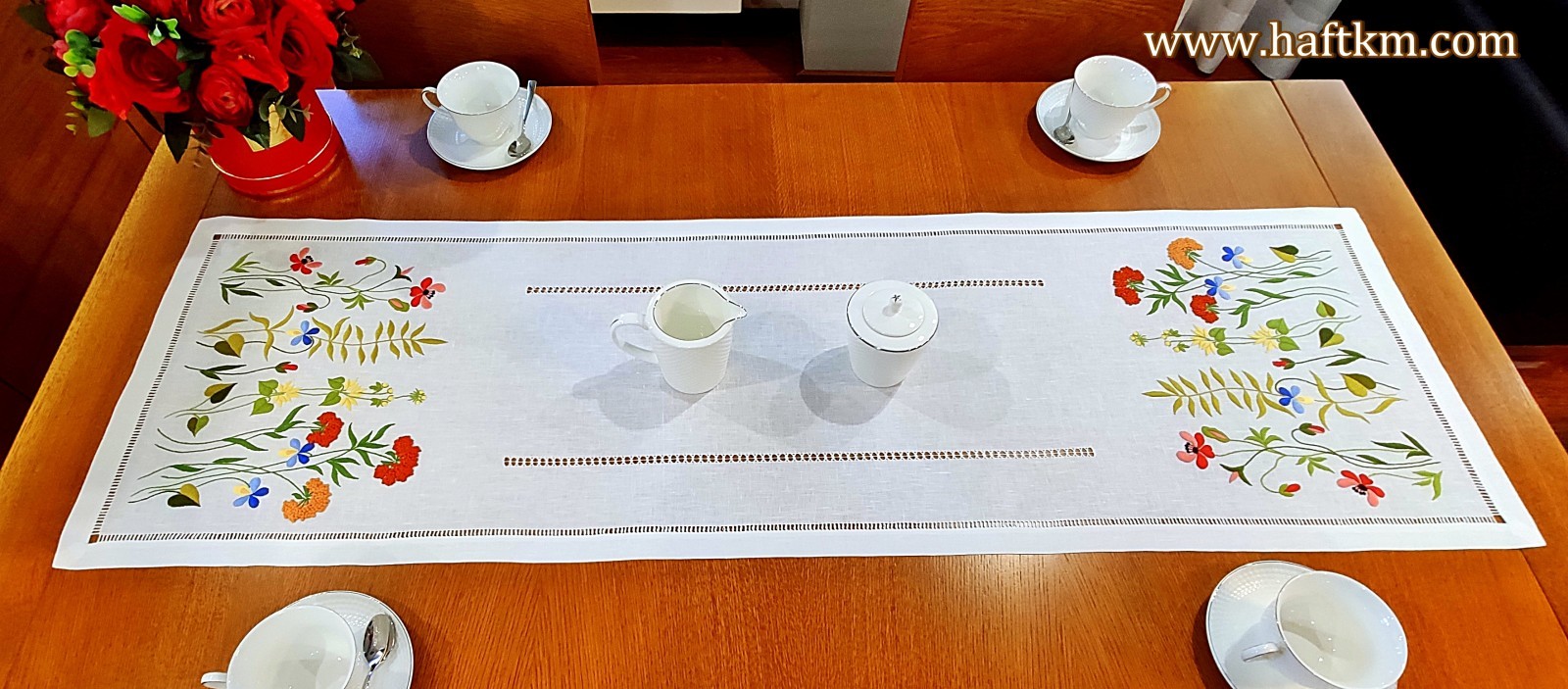 techniką hafciarską - haft wypukły. Ponadto bieżnik został misternie ozdobiony elegancką i estetyczną mereżką.