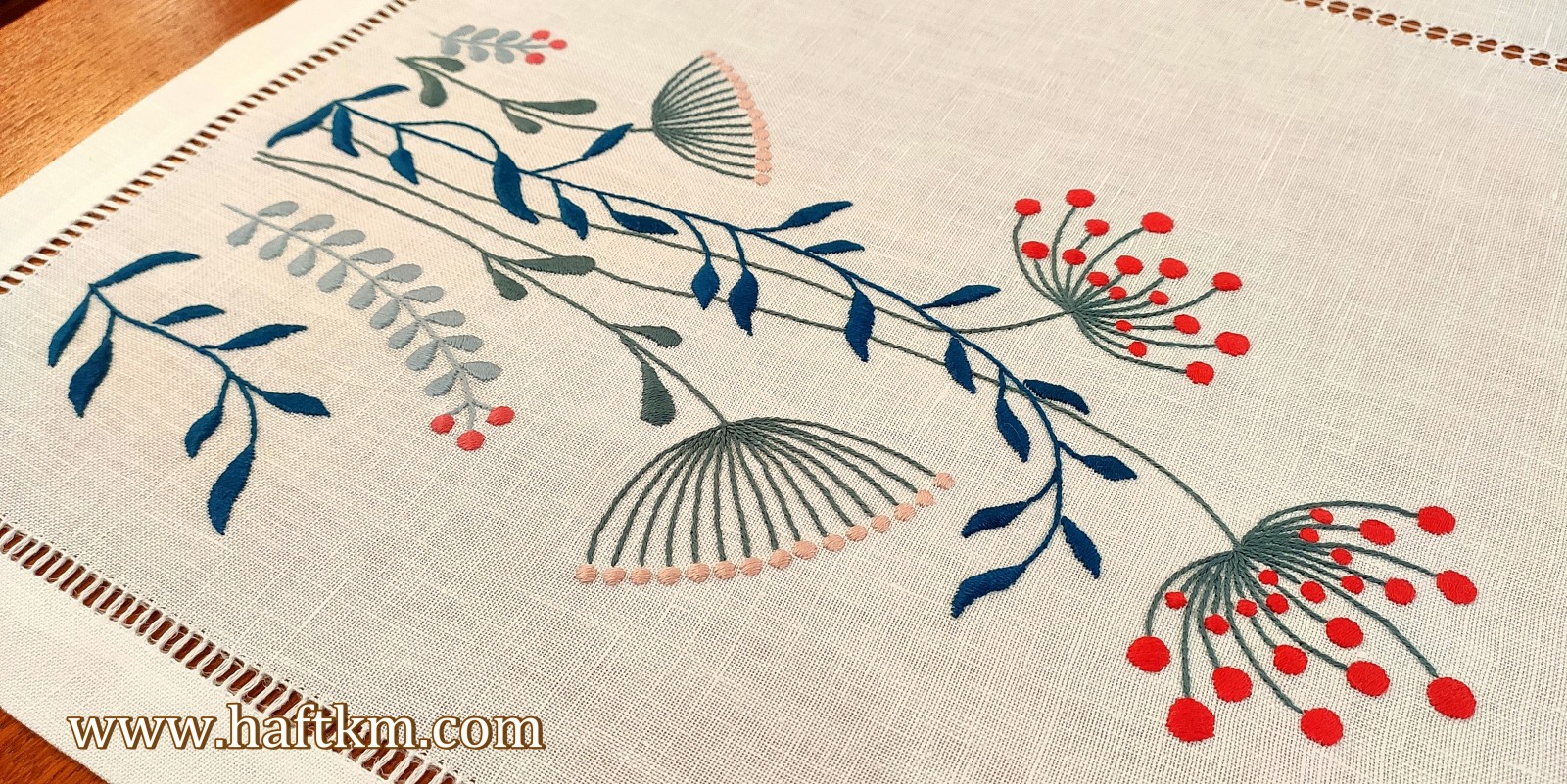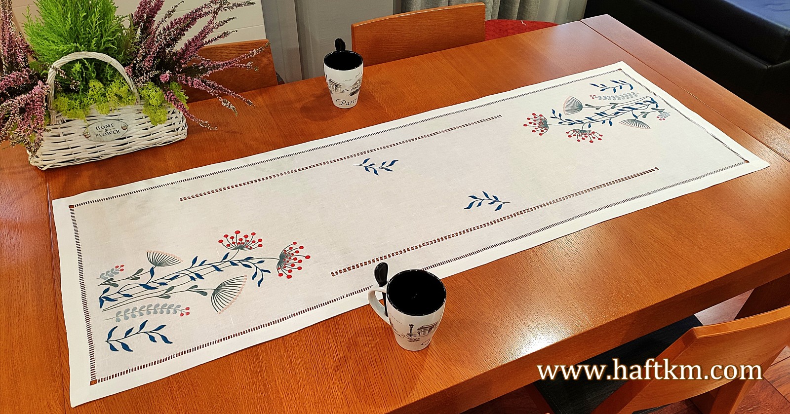 techniką hafciarską - haft wypukły. Ponadto bieżnik został misternie ozdobiony elegancką i estetyczną mereżką.