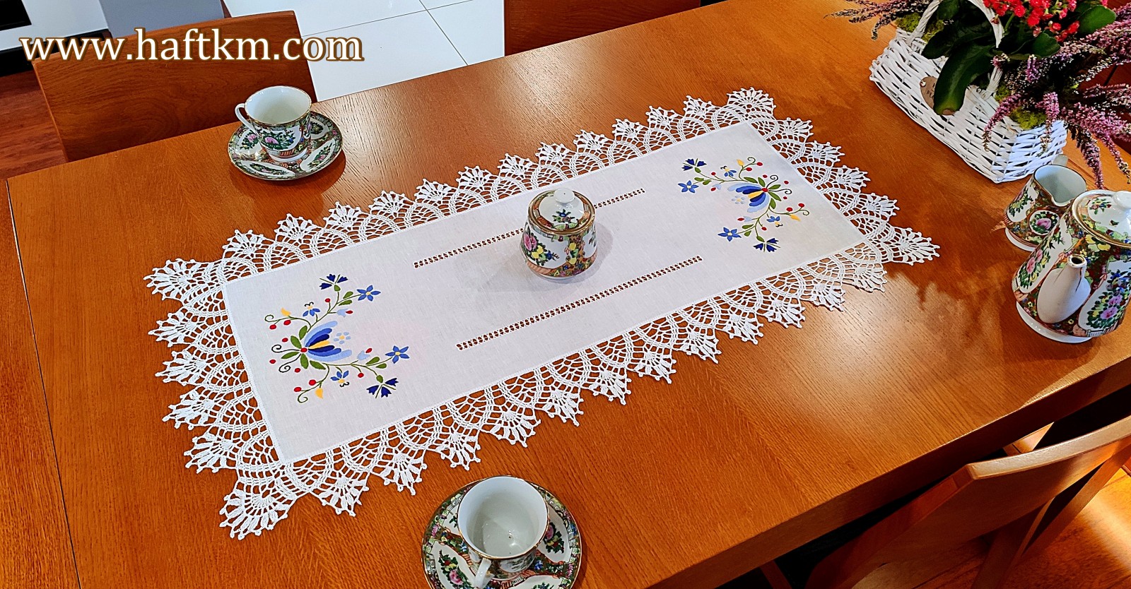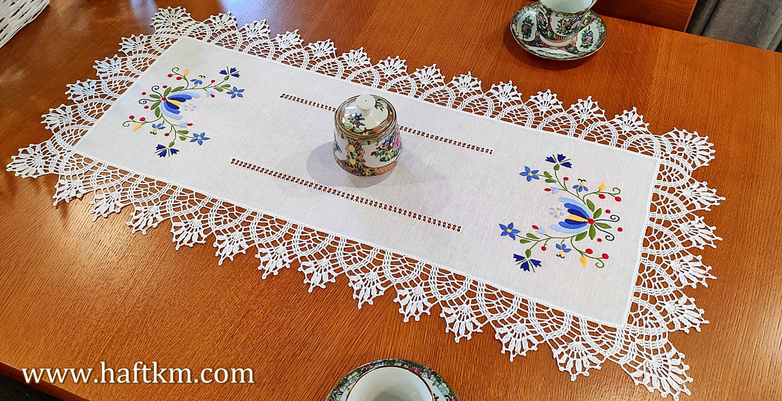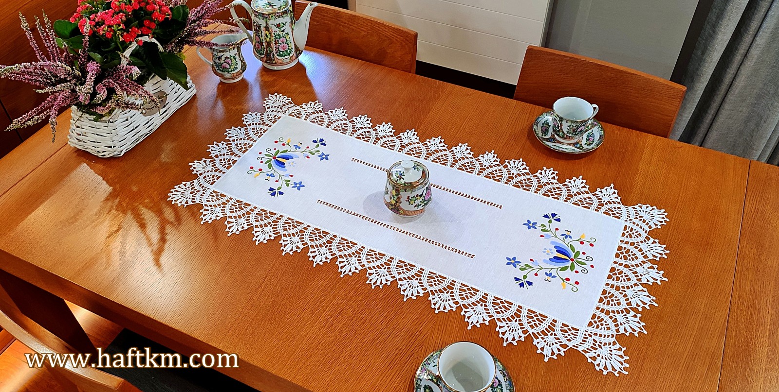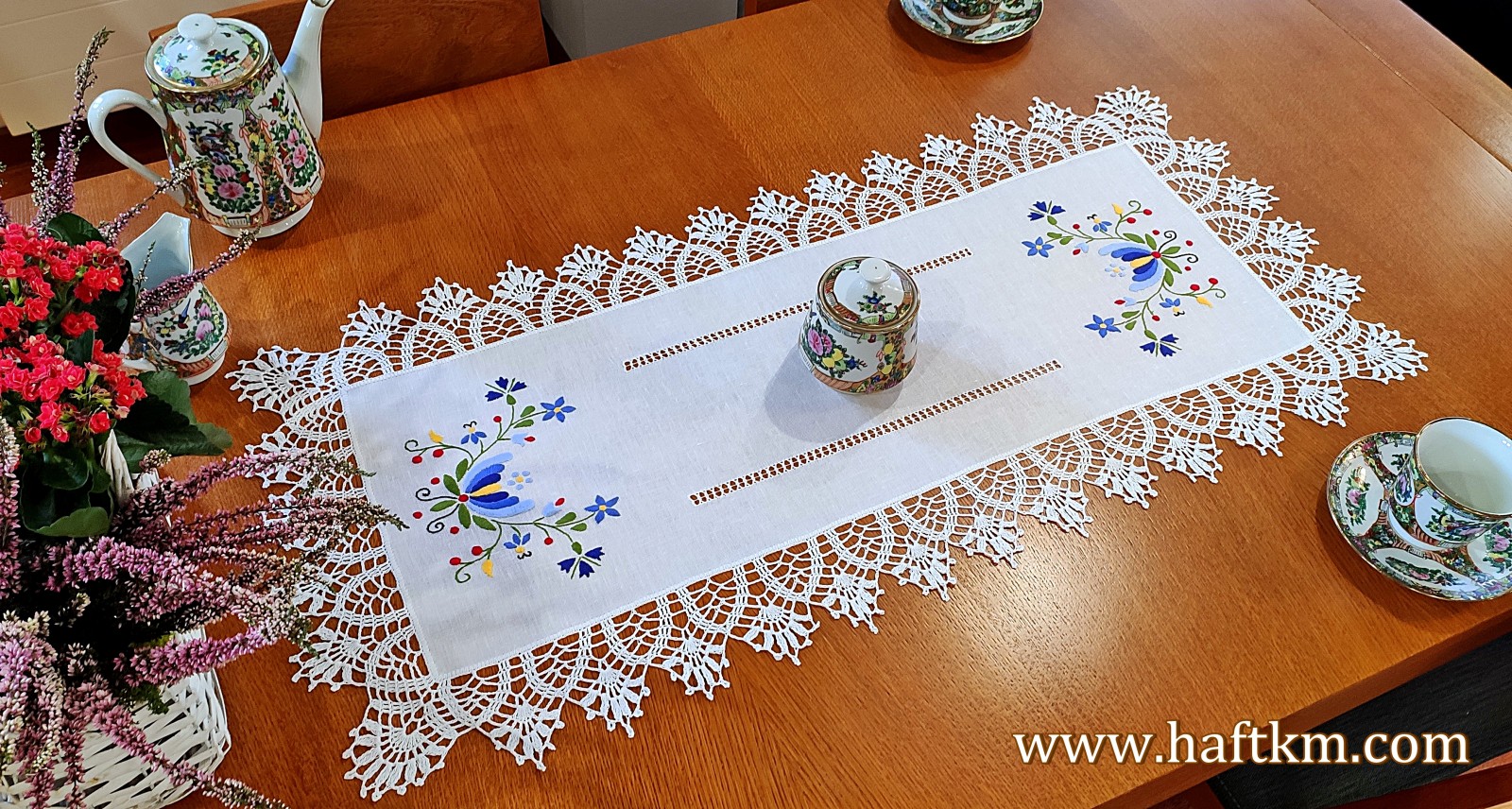 techniką hafciarską - haft wypukły. Ponadto bieżnik został misternie ozdobiony, elegancką i estetyczną koronką szydełkową.
