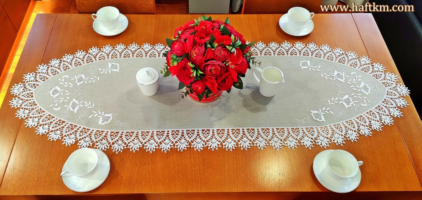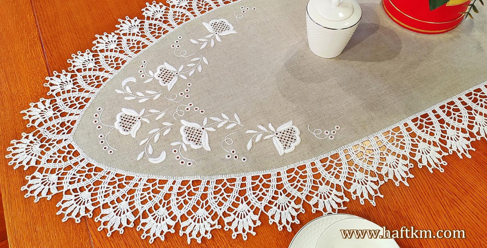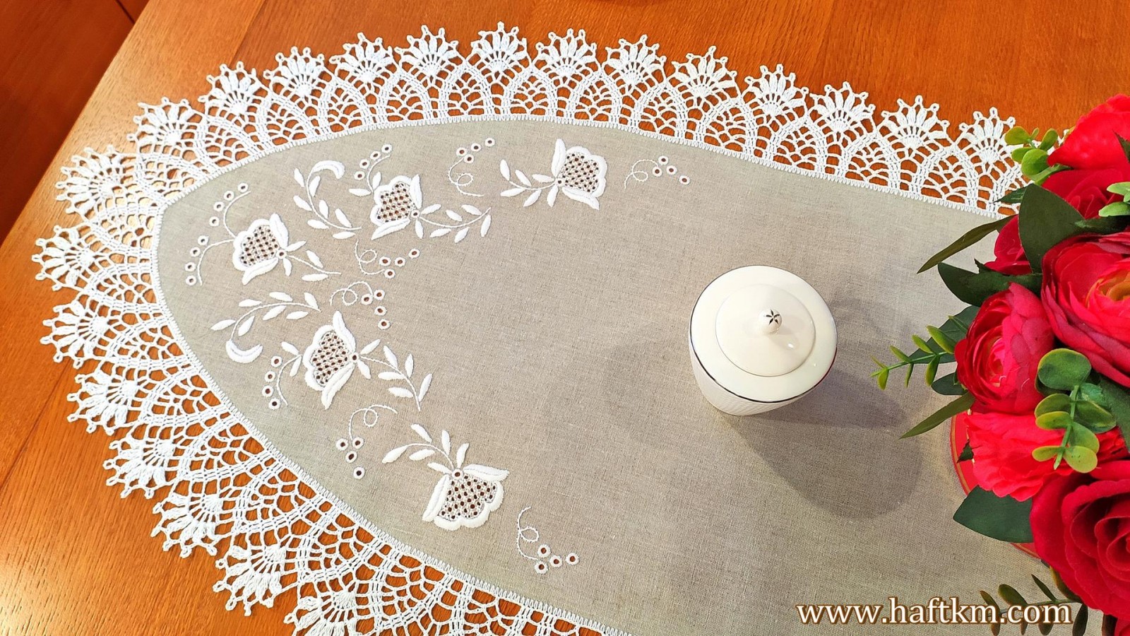 techniką hafciarską, haft wypukły, haft toledo. Ponadto serweta została misternie ozdobiona elegancką i misterną koronką szydełkową.