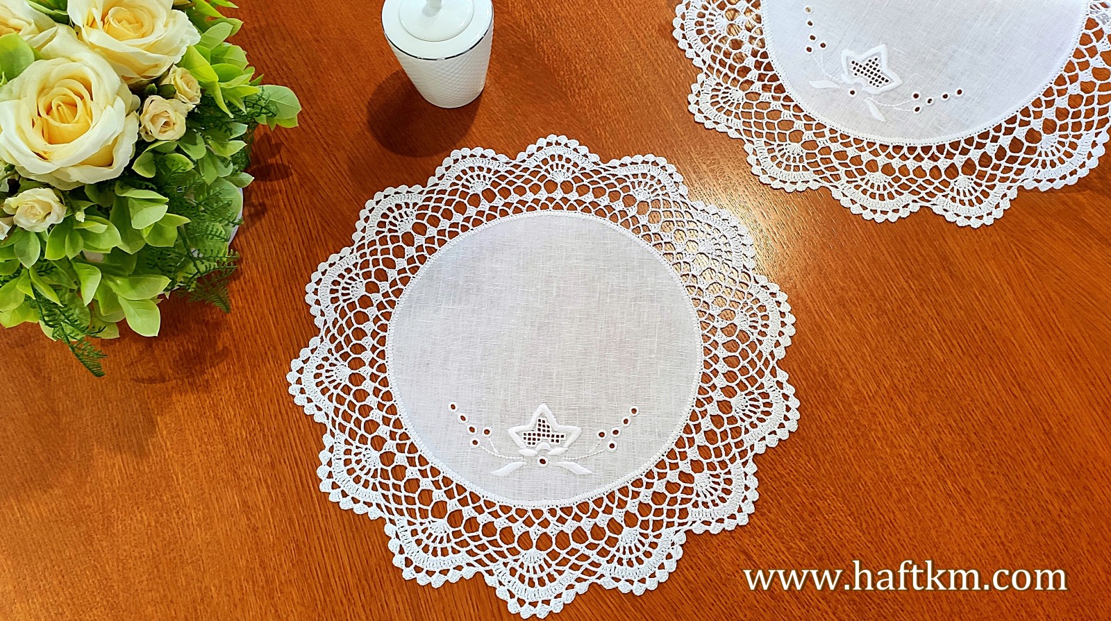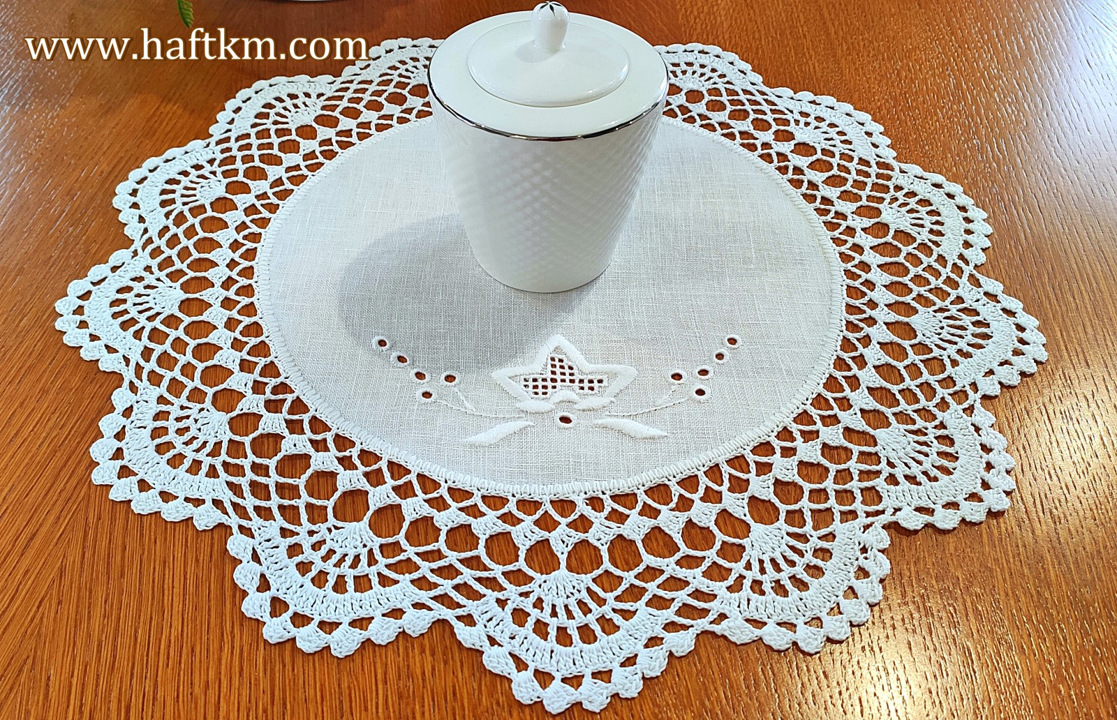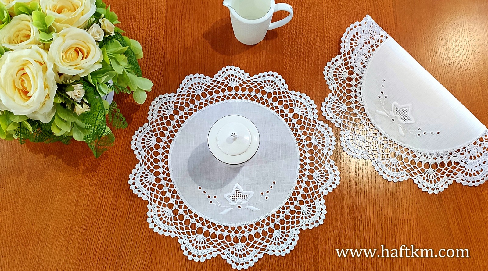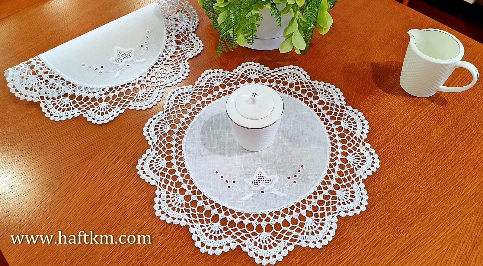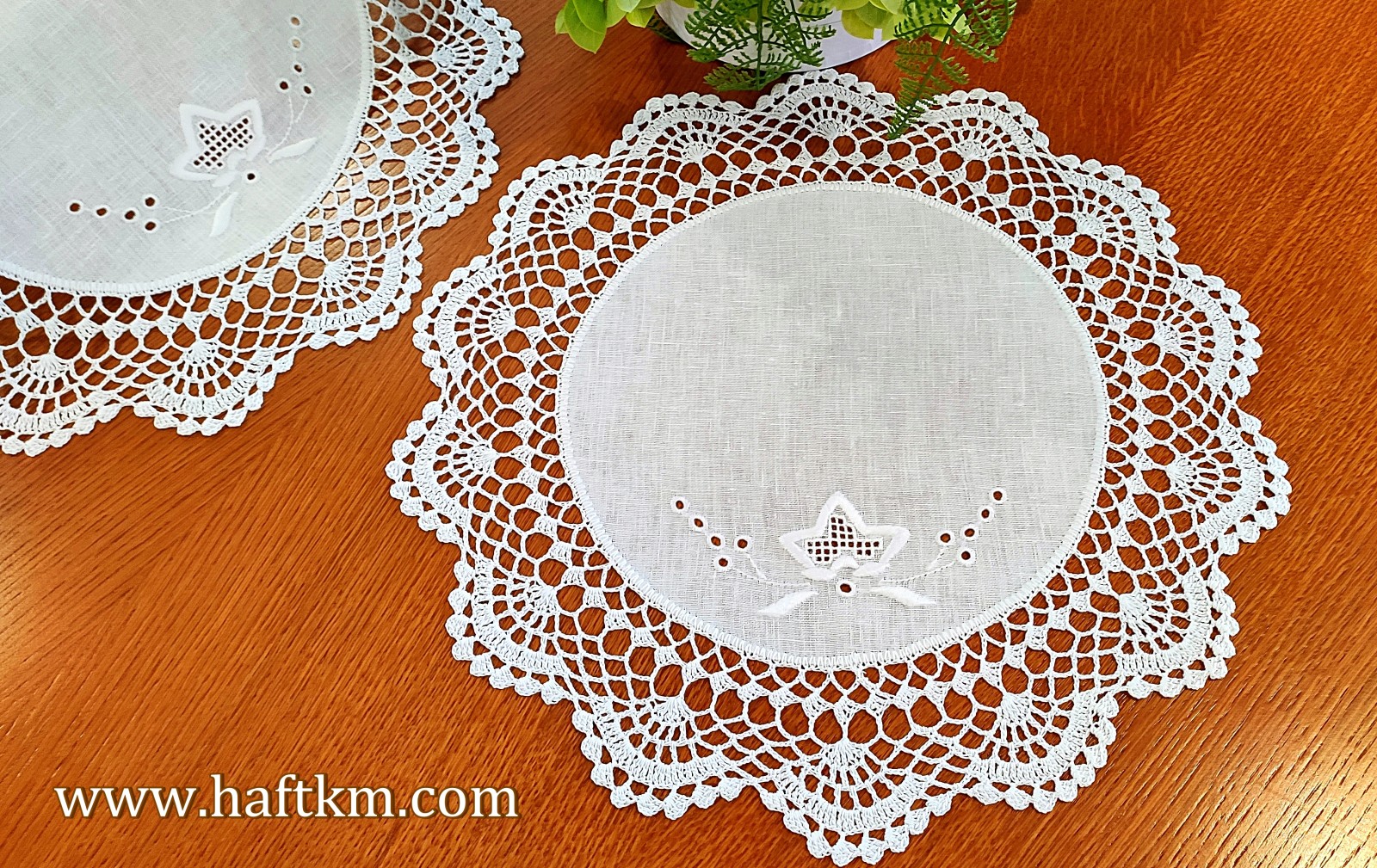 techniką hafciarską, haft wypukły. Ponadto serweta została misternie ozdobiona elegancką i misterną koronką szydełkową.