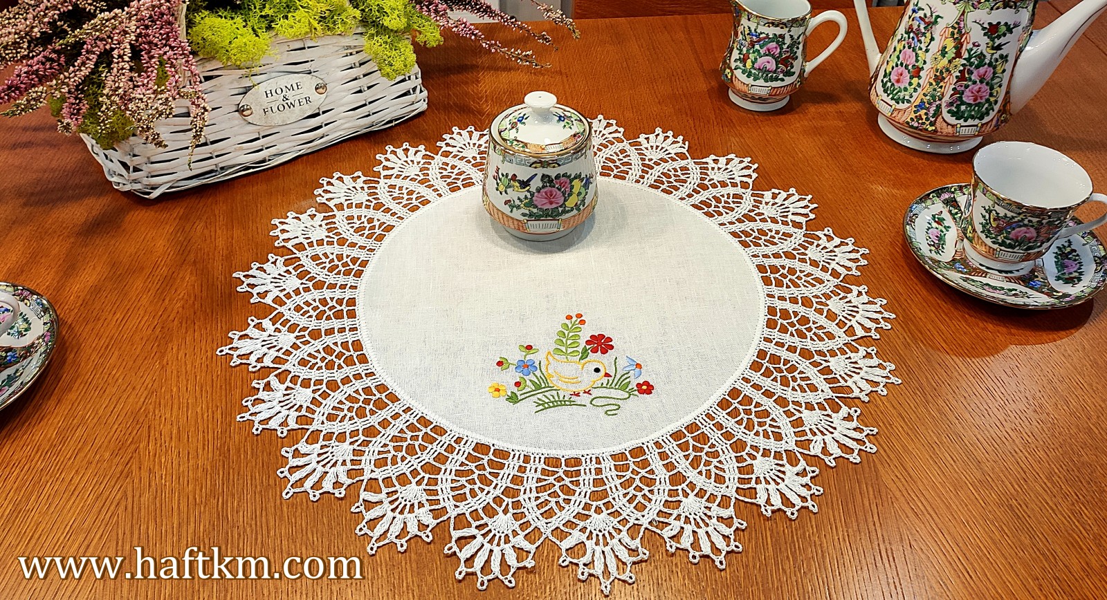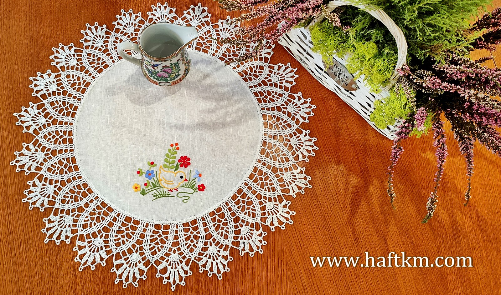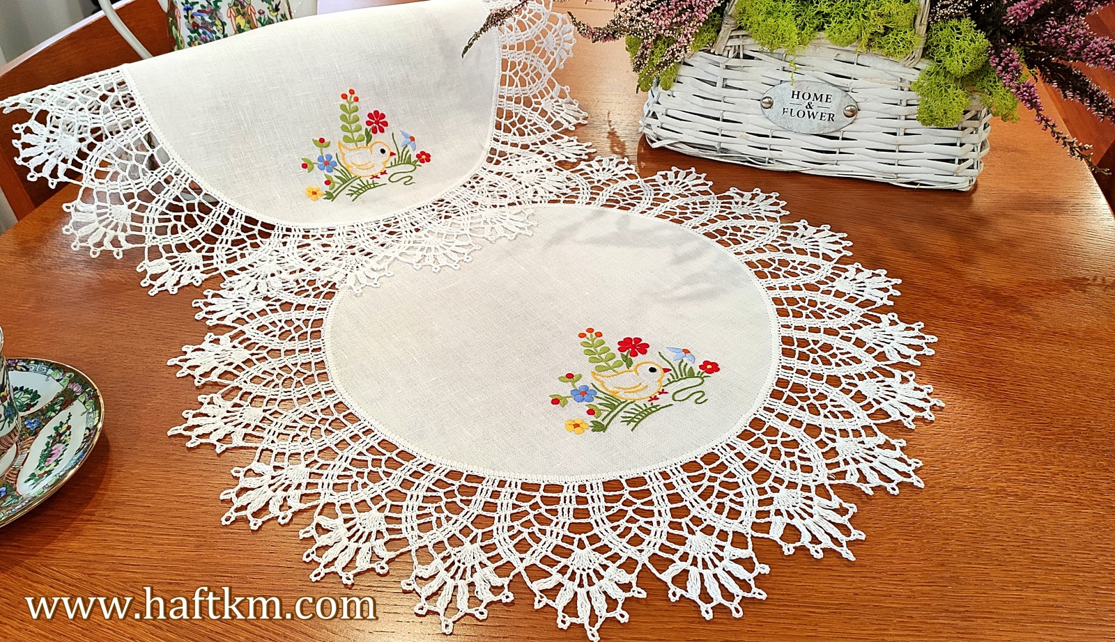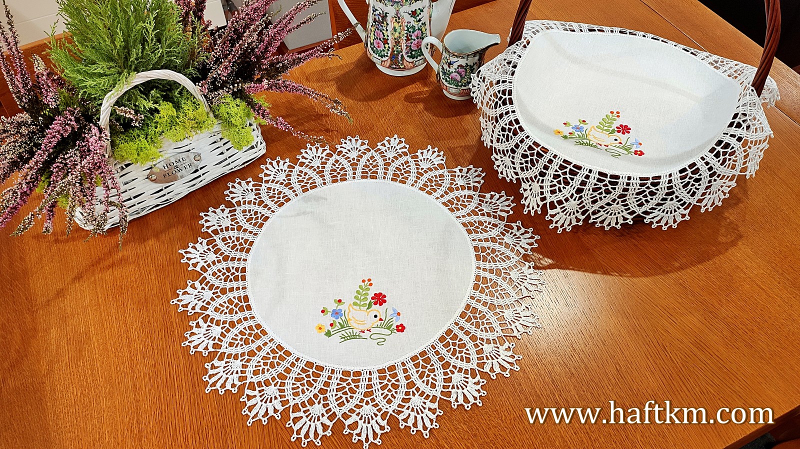 techniką hafciarską, haft wypukły. Ponadto serweta została misternie ozdobiona elegancką i misterną koronką szydełkową.