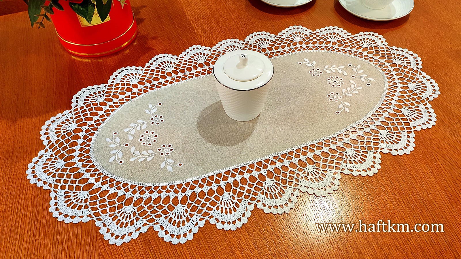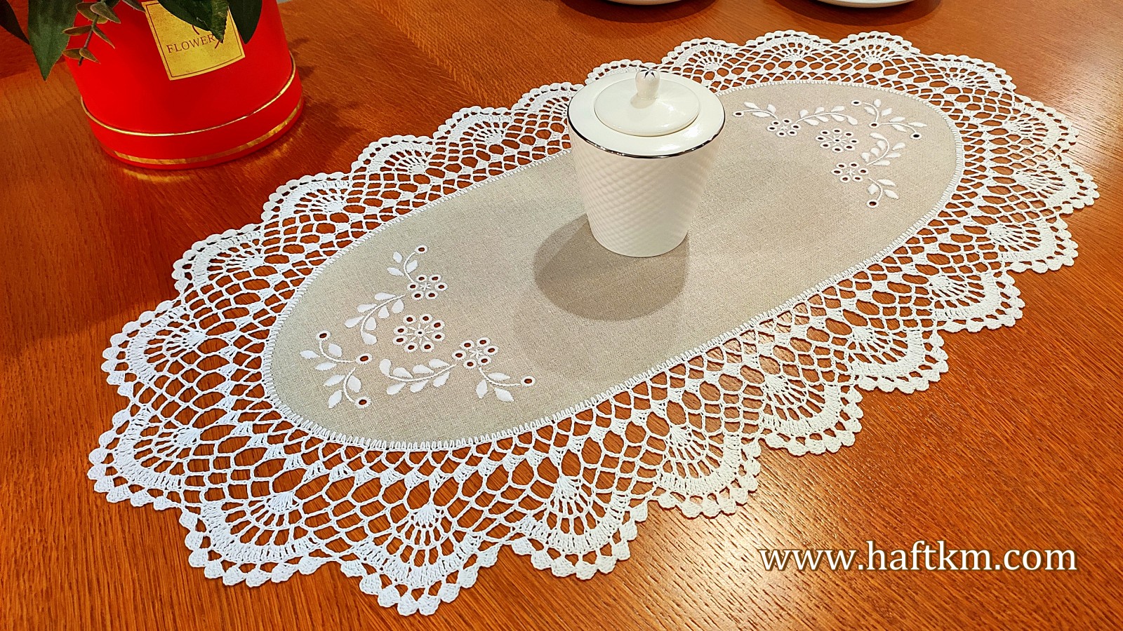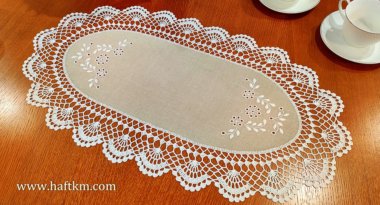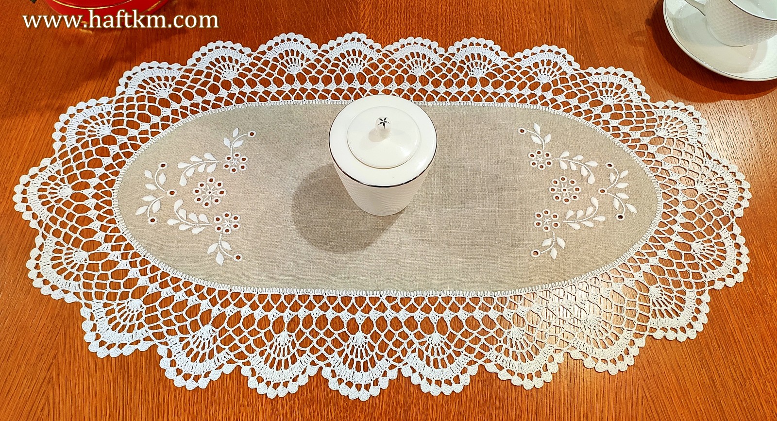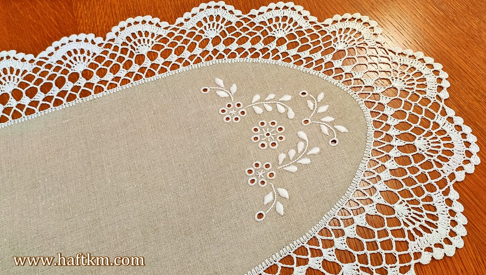 Ręcznie haftowana serweta owalna z koronką szydełkową.