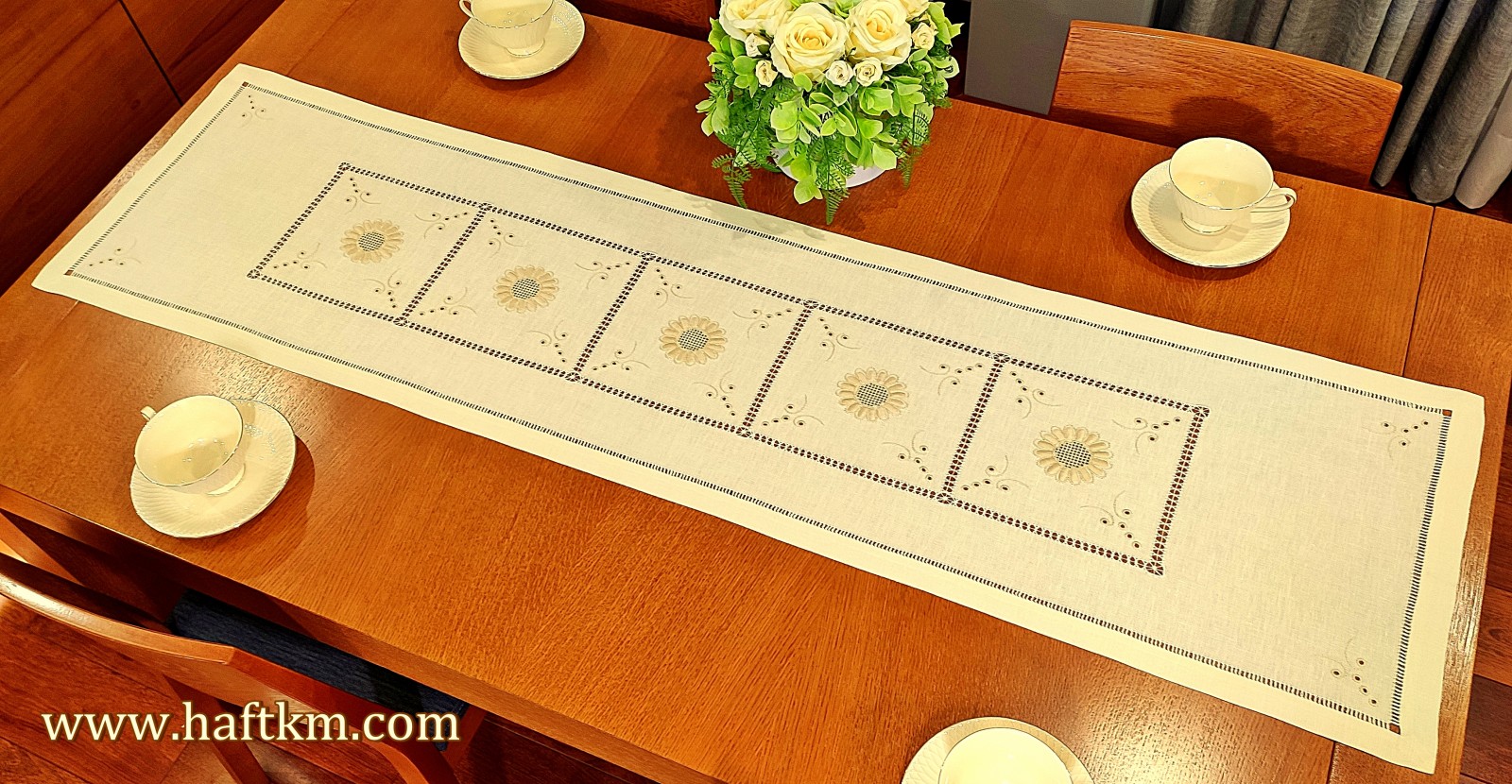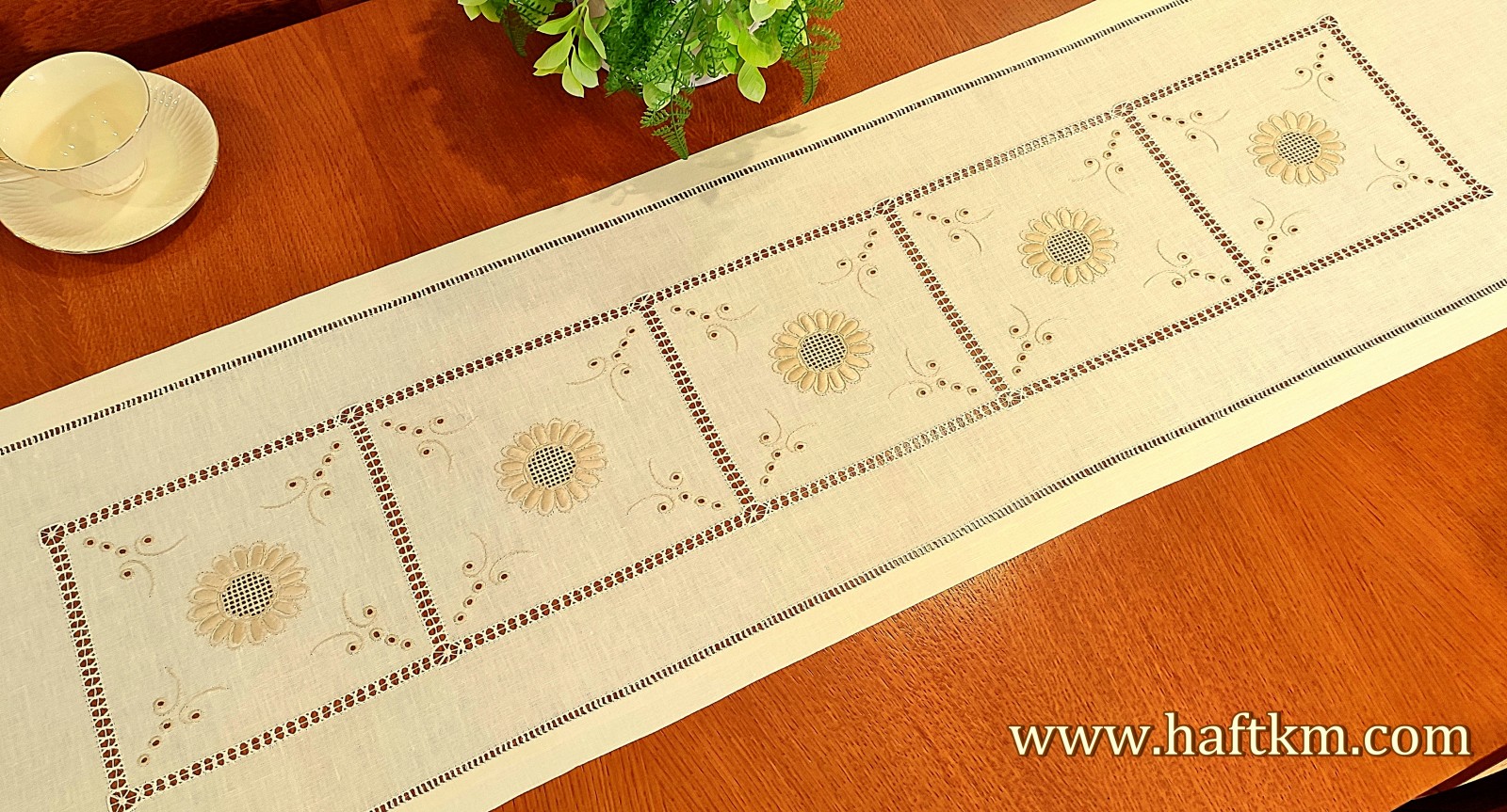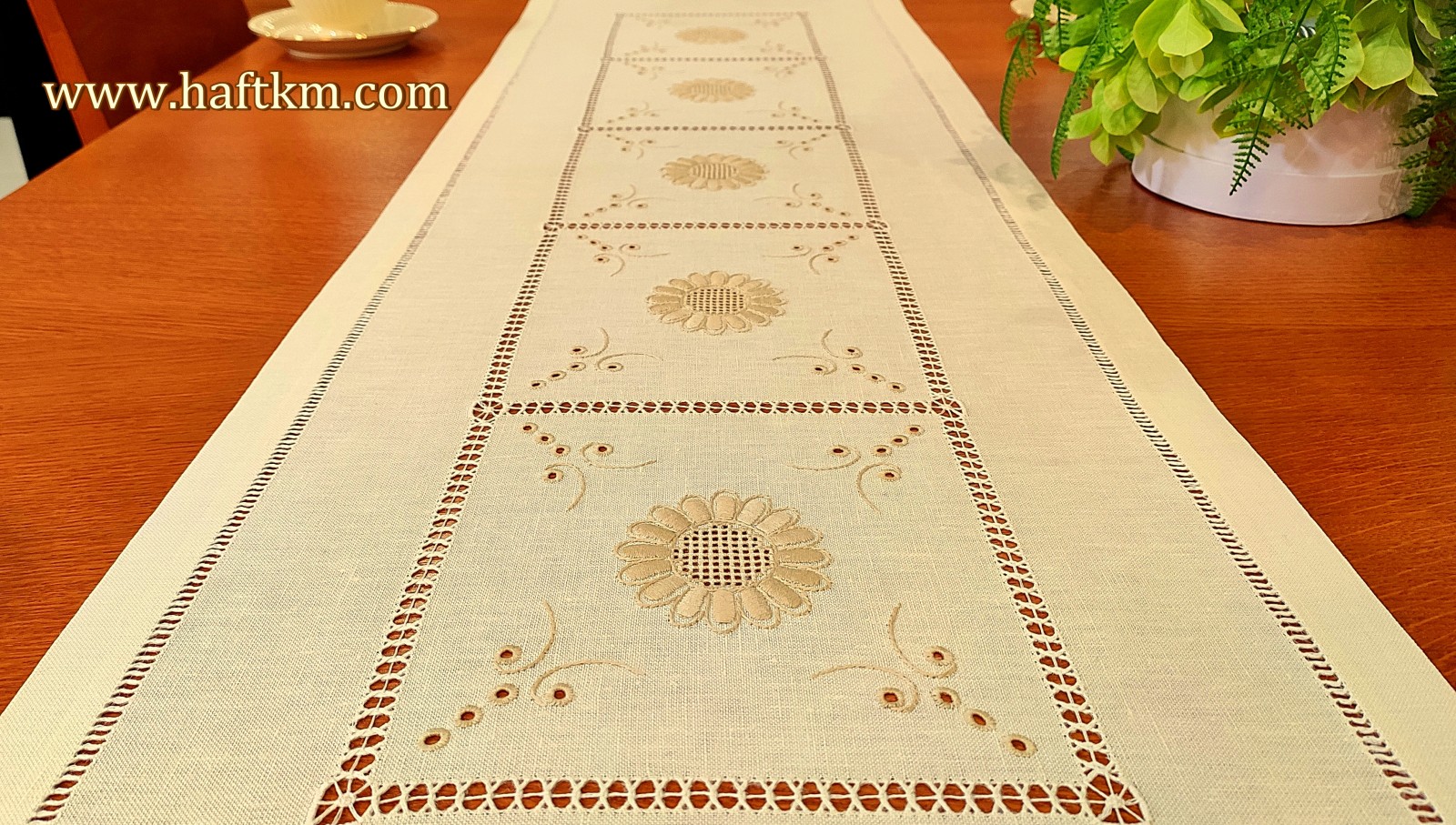 techniką hafciarską, haft wypukły, haft toledo. Ponadto bieżnik został misternie ozdobiony elegancką i estetyczną mereżką.