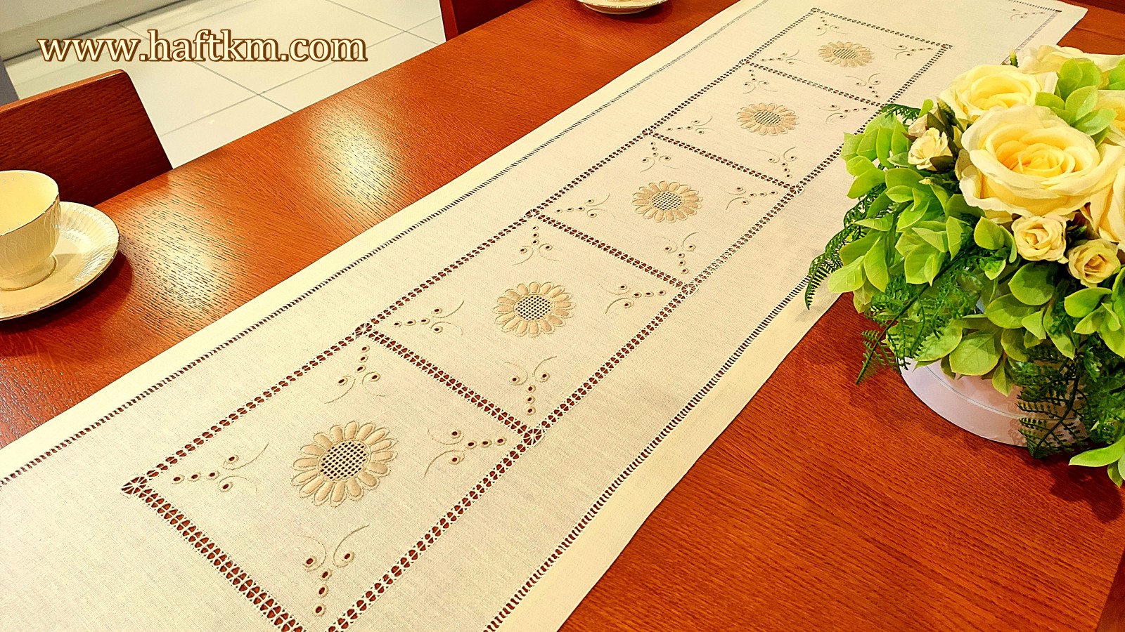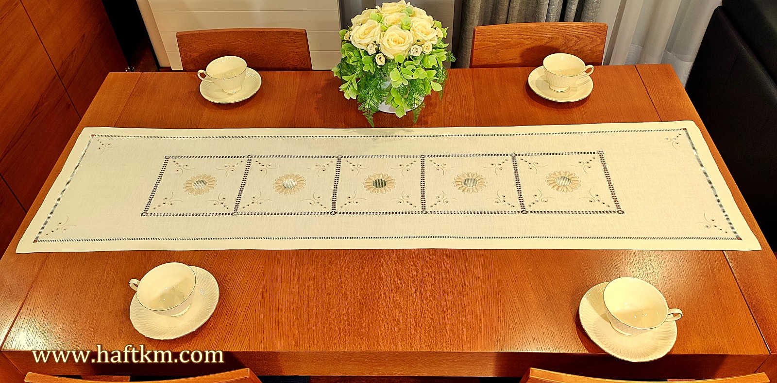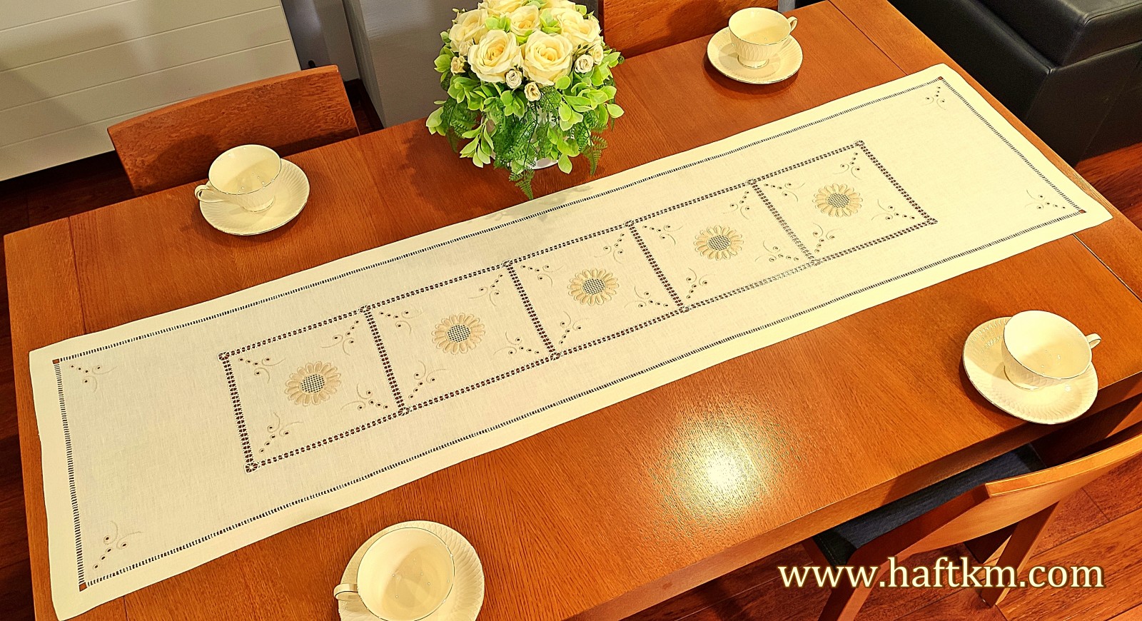 techniką hafciarską, haft wypukły, haft toledo. Ponadto bieżnik został misternie ozdobiony elegancką i estetyczną mereżką.