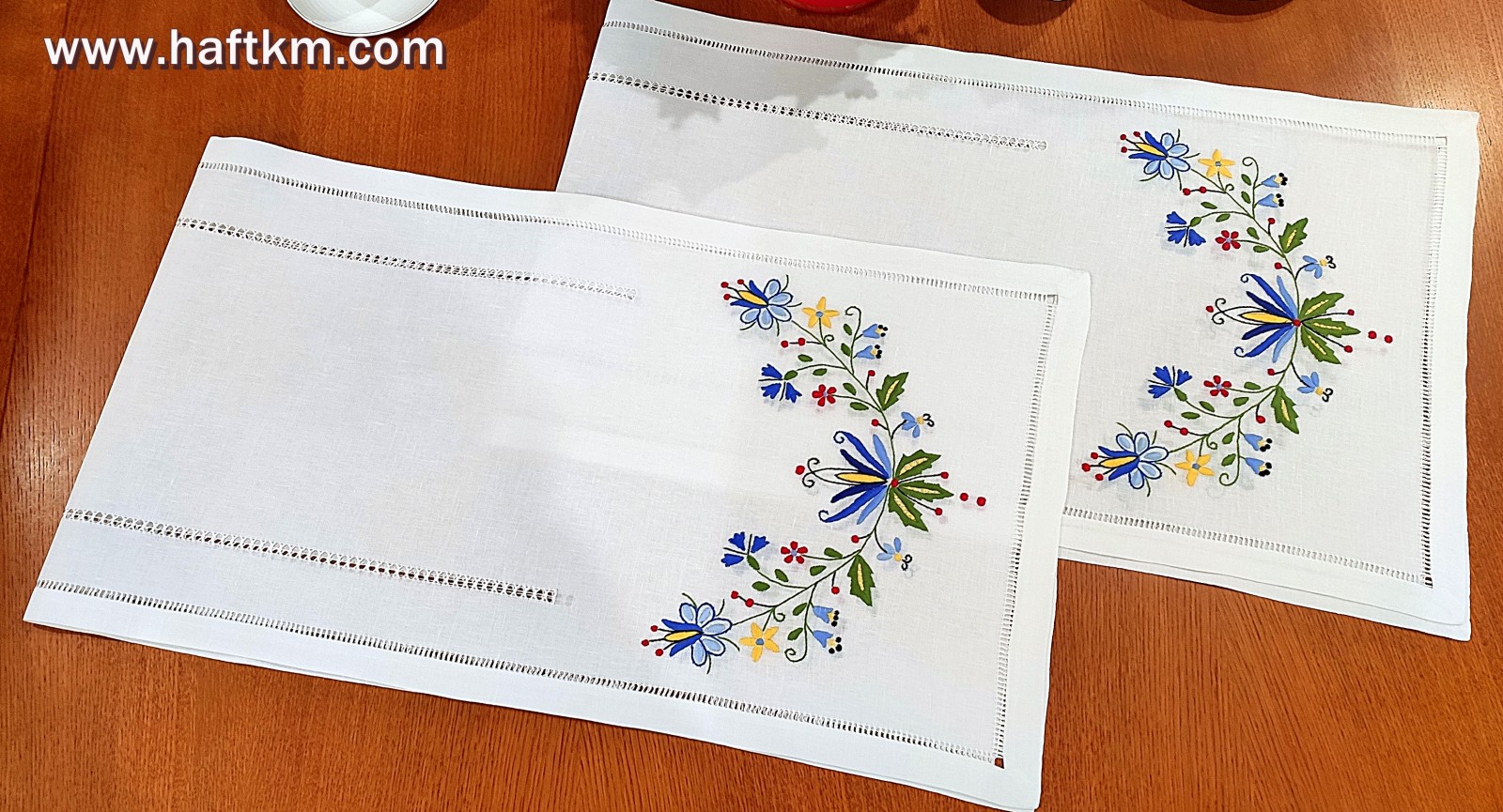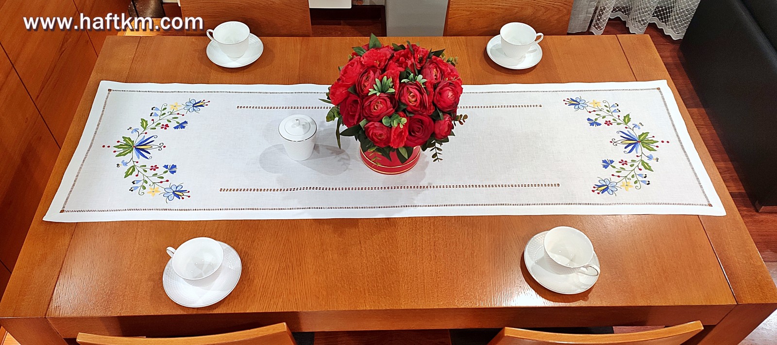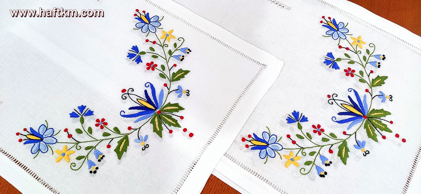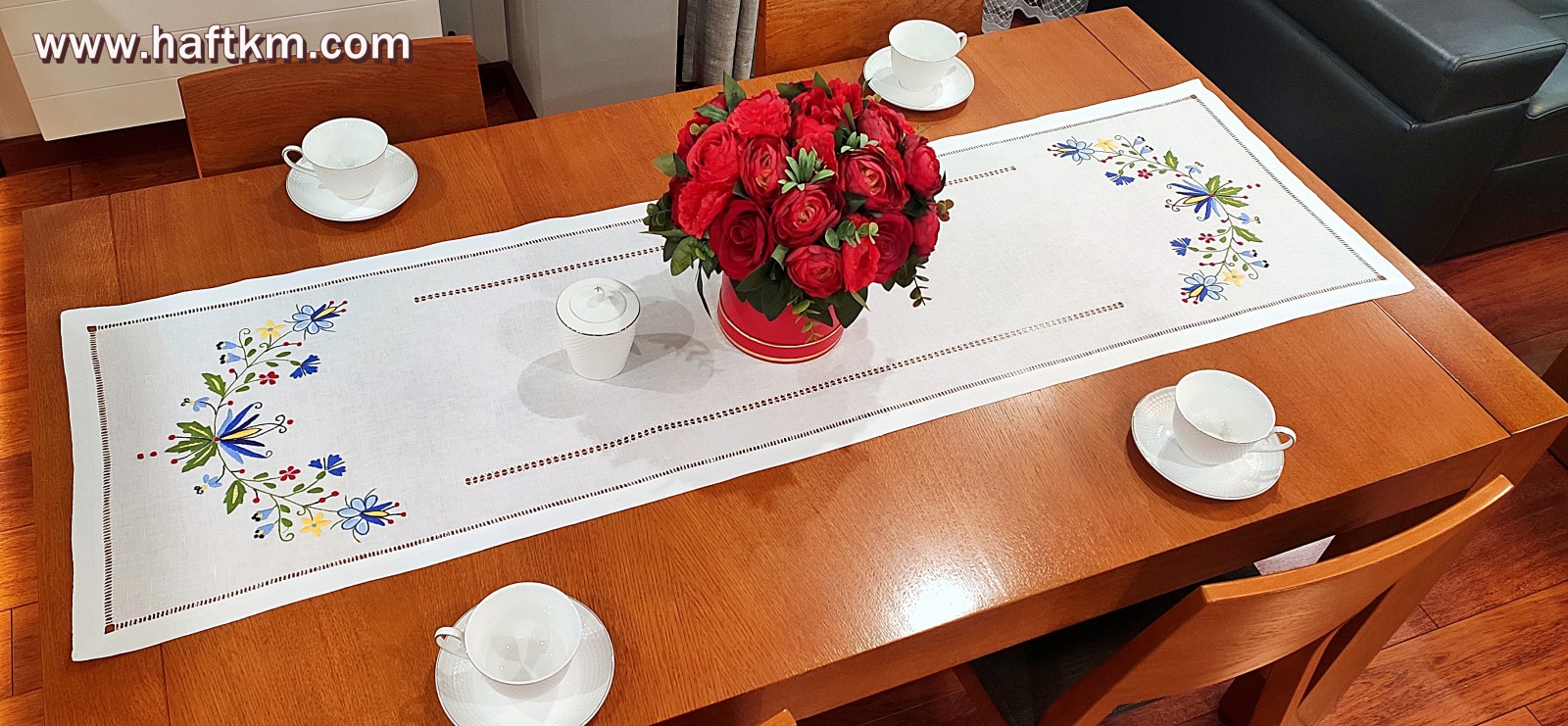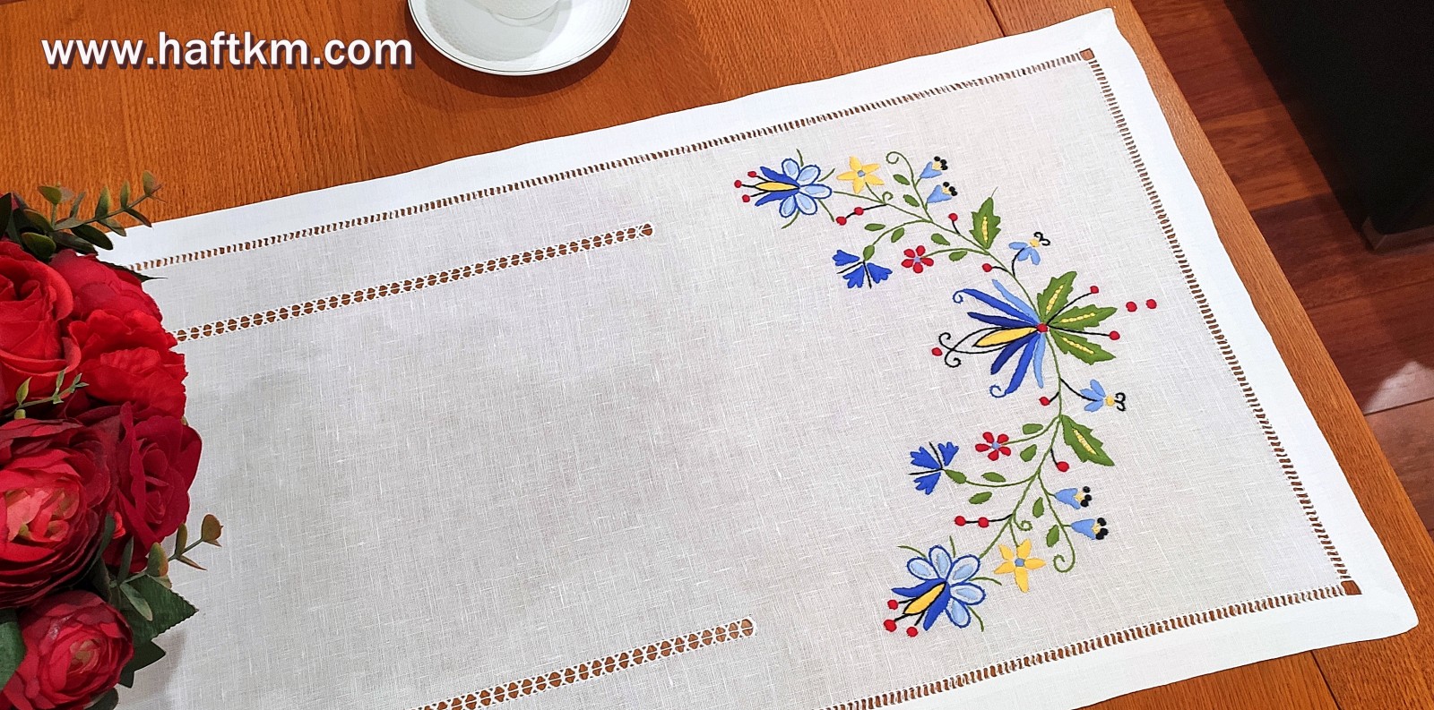 techniką hafciarską - haft wypukły. Ponadto bieżnik został misternie ozdobiony, elegancką i estetyczną mereżką.