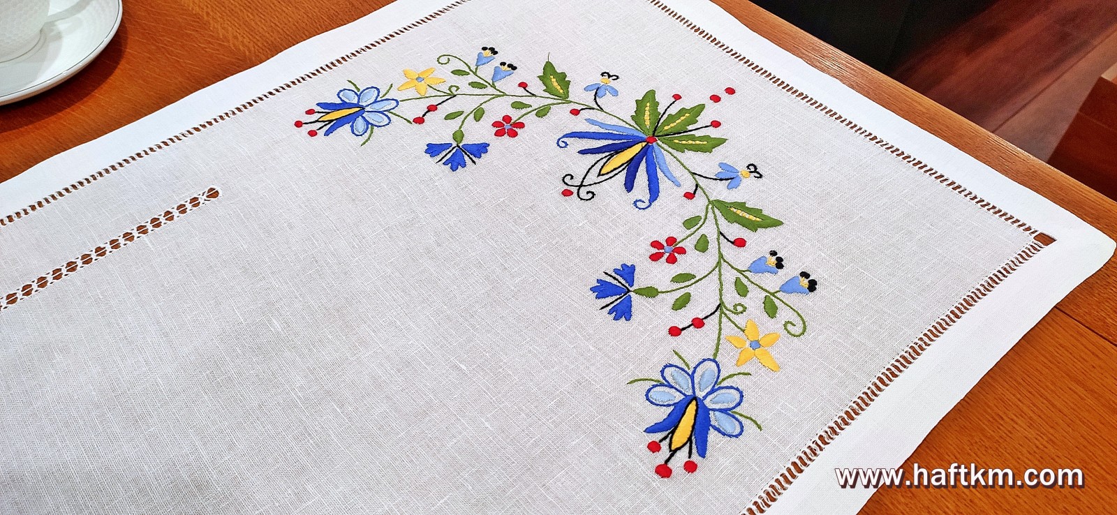Piękny, ręcznie haftowany bieżnik z motywem kaszubskim.