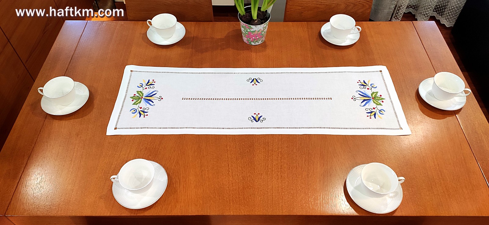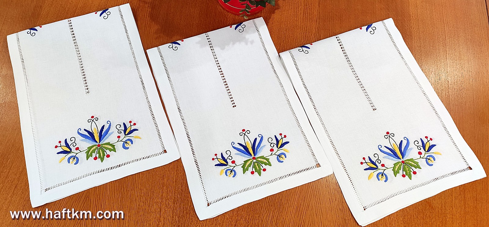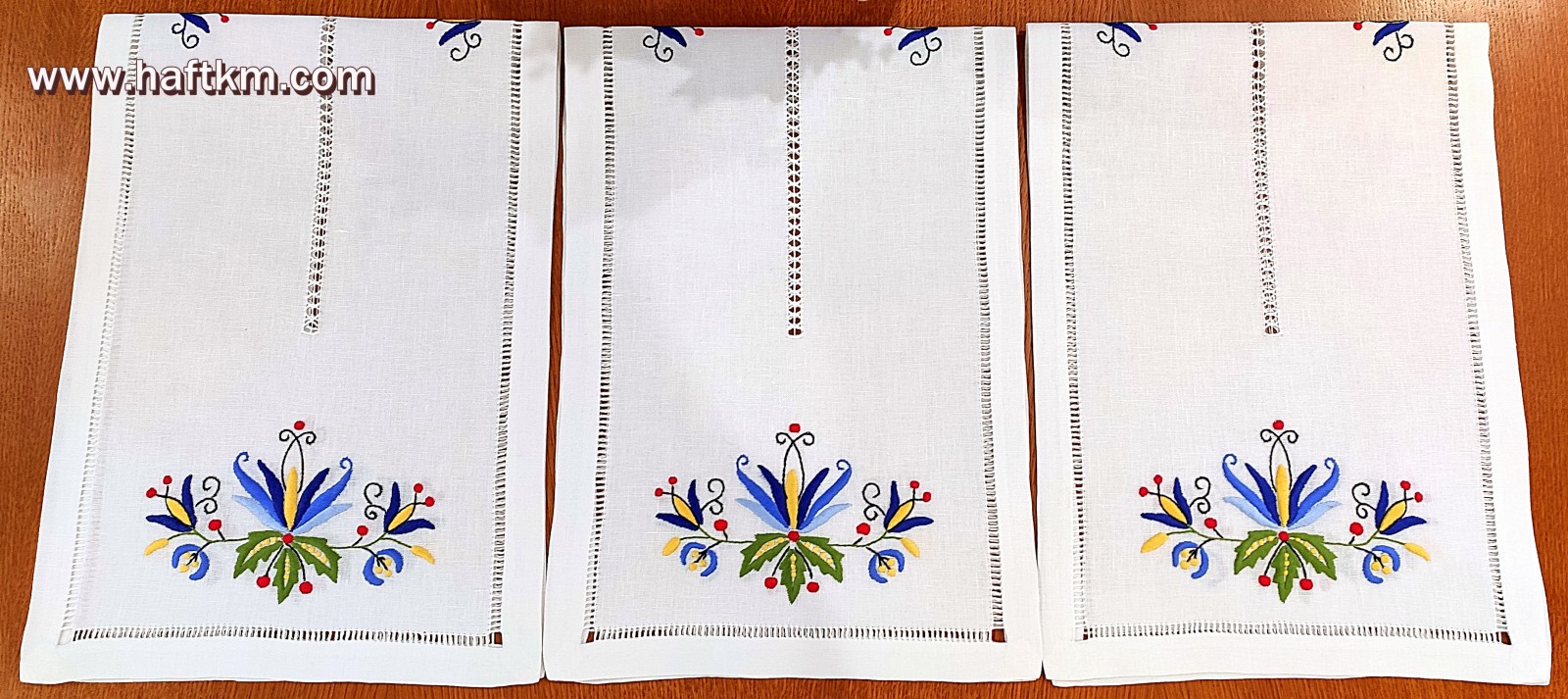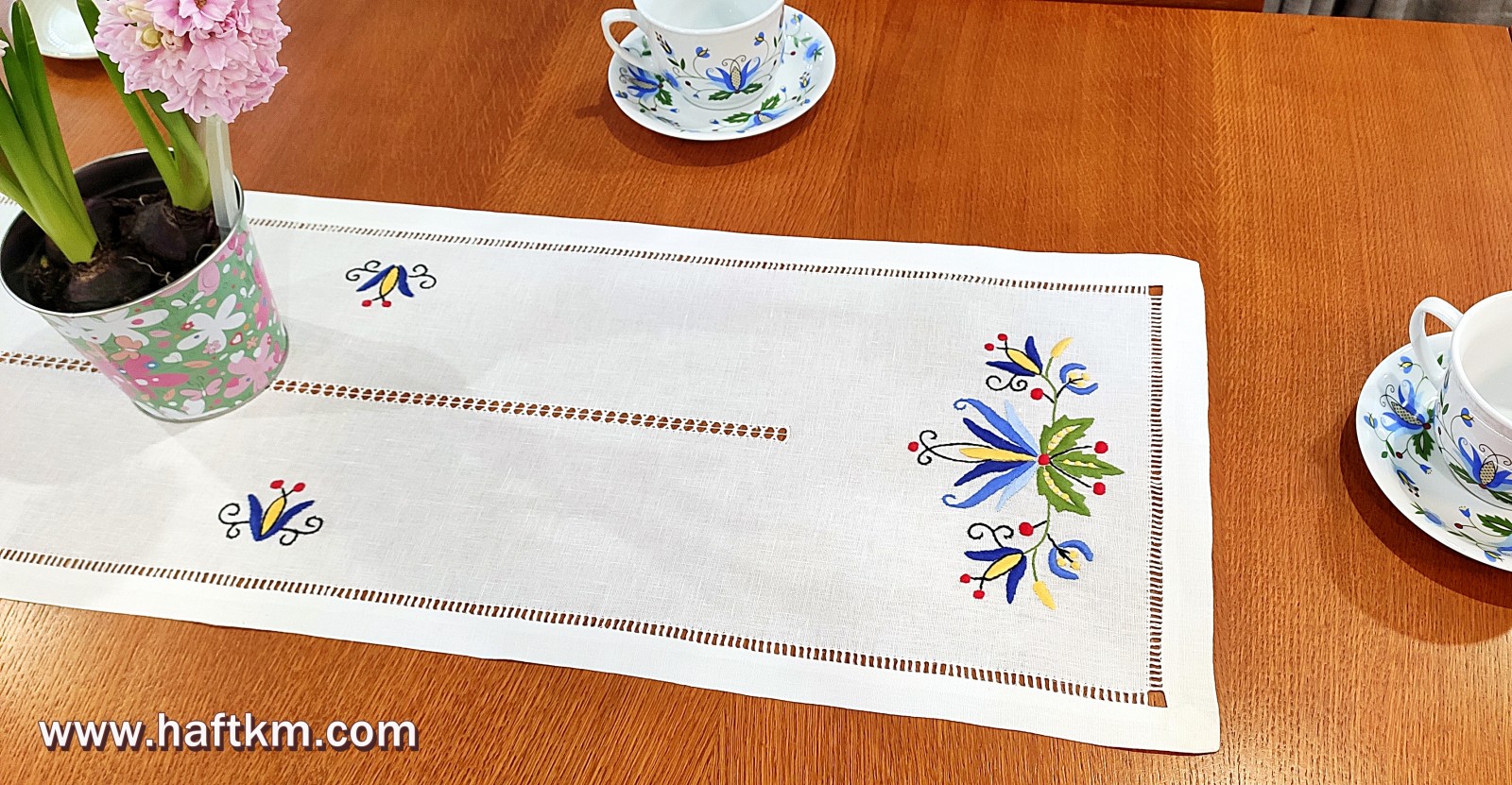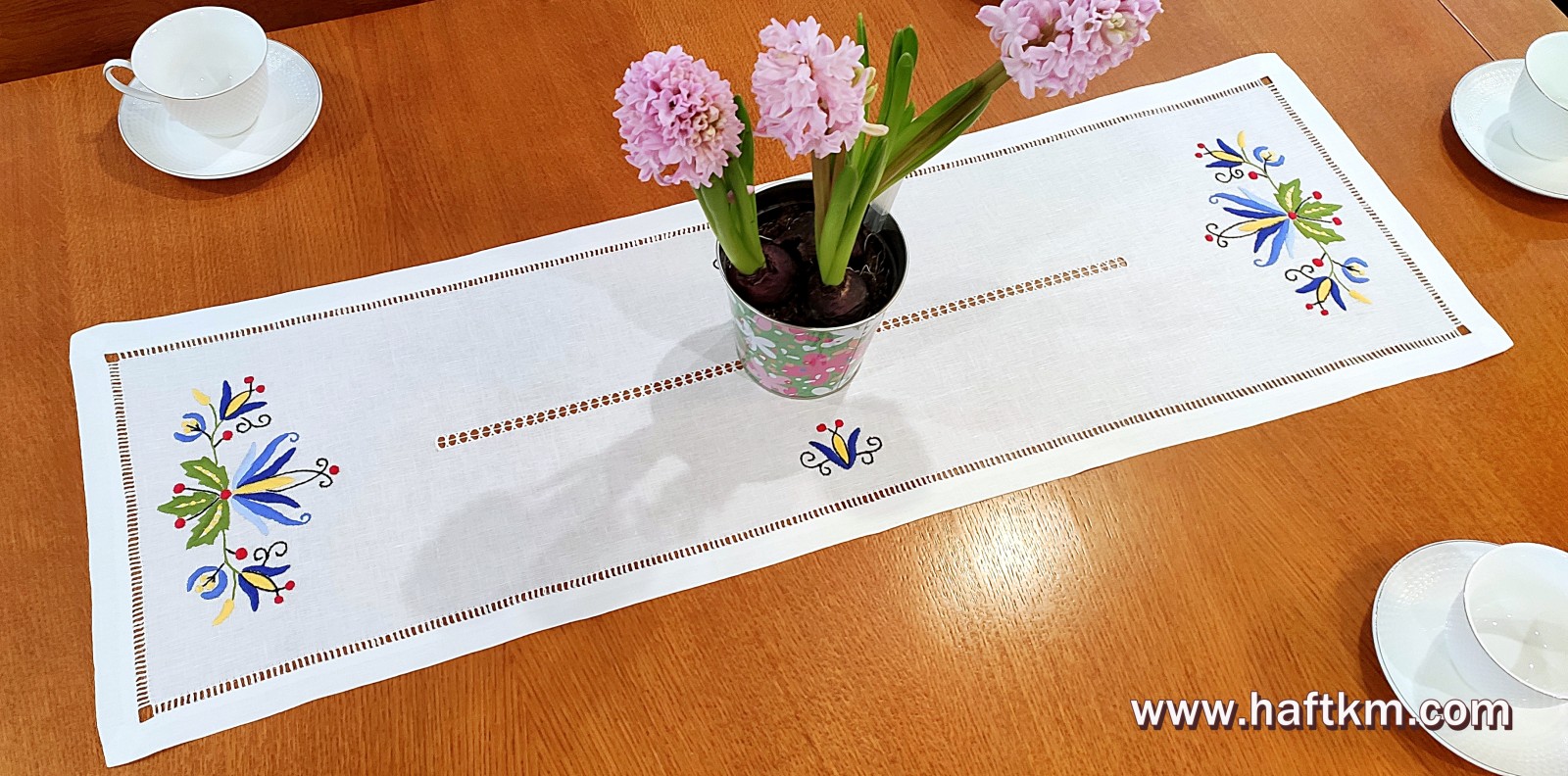 techniką hafciarską - haft wypukły. Ponadto bieżnik został misternie ozdobiony, elegancką i estetyczną mereżką.