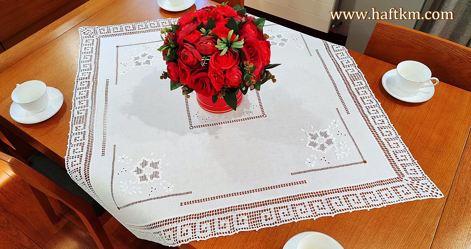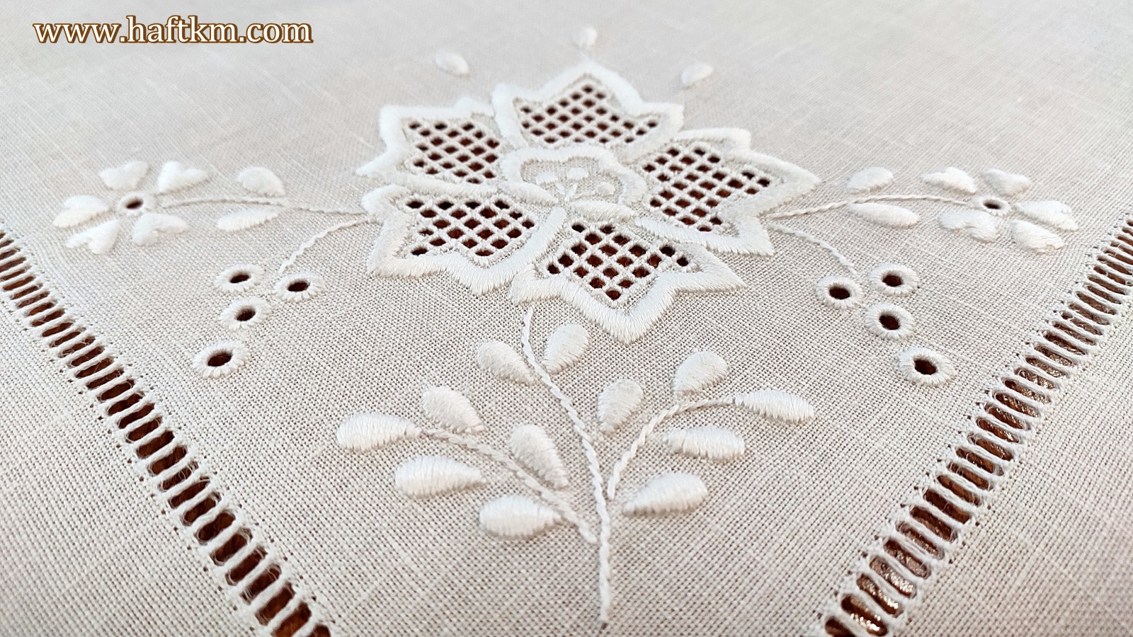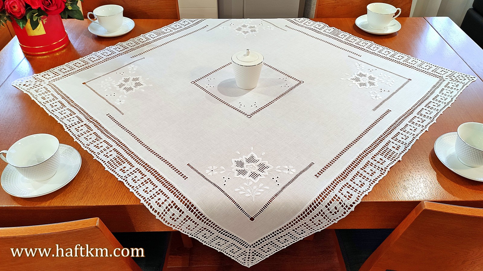techniką hafciarską - haft wypukły, haft toledo. Obrus został misternie ozdobiony elegancką i estetyczną mereżką. Brzegi obrusa ozdabia, piękna koronka szydełkowa wykonana ręcznie.