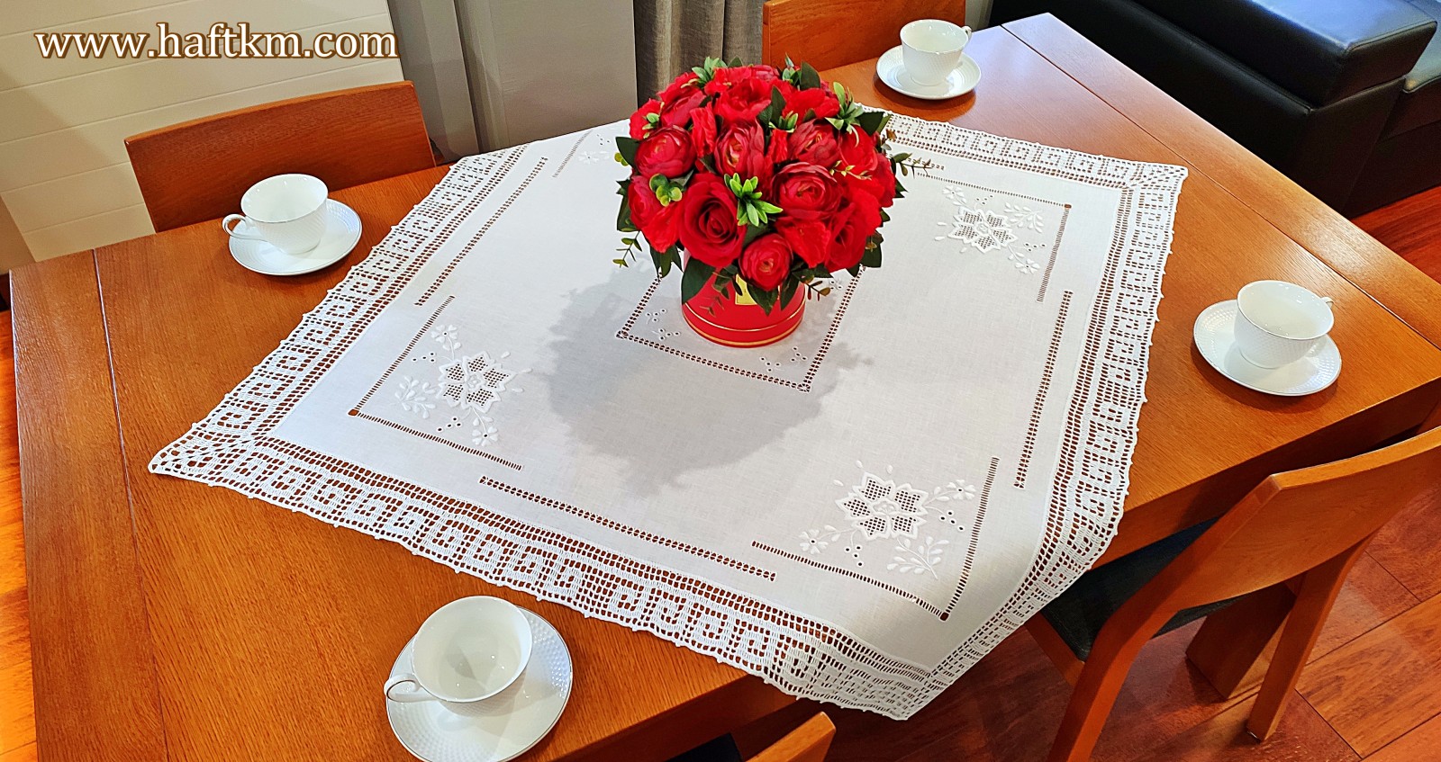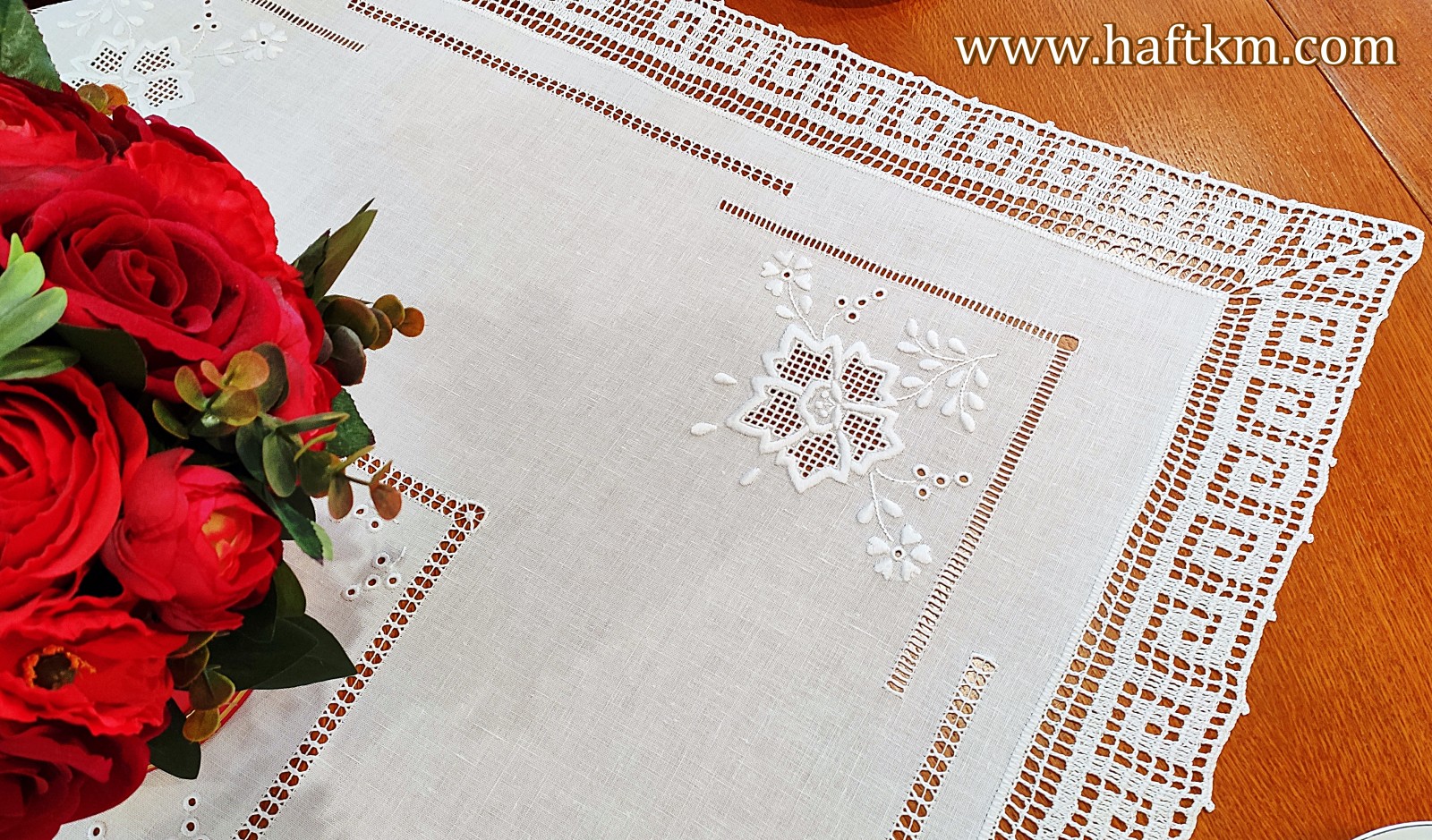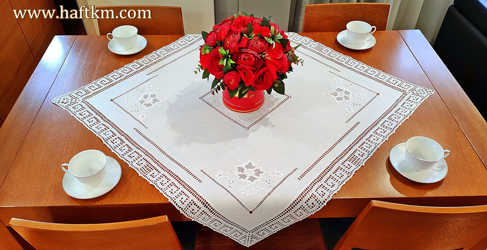 techniką hafciarską - haft wypukły, haft toledo. Obrus został misternie ozdobiony elegancką i estetyczną mereżką. Brzegi obrusa ozdabia, piękna koronka szydełkowa wykonana ręcznie.