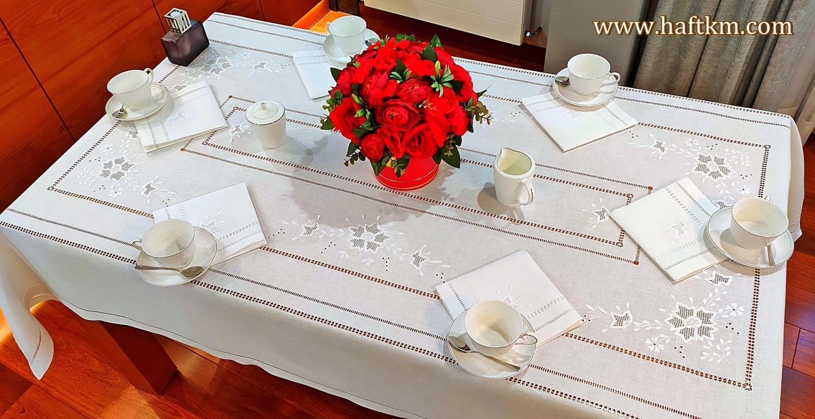 techniką hafciarską - haft wypukły, haft toledo. Ponadto obrus został misternie ozdobiony elegancką i estetyczną mereżką.