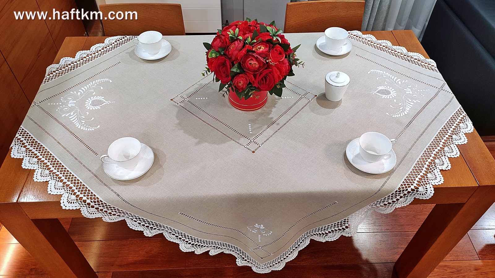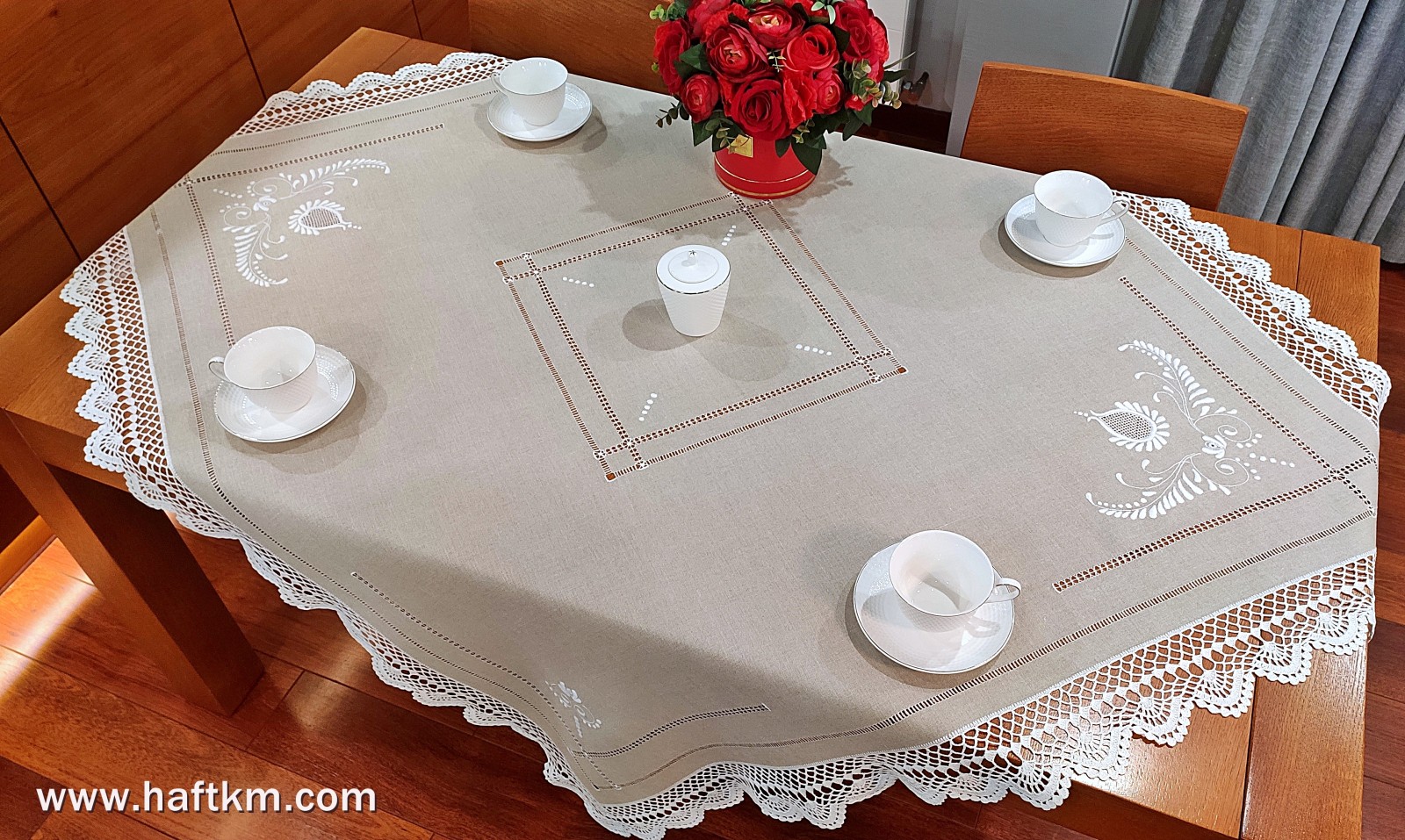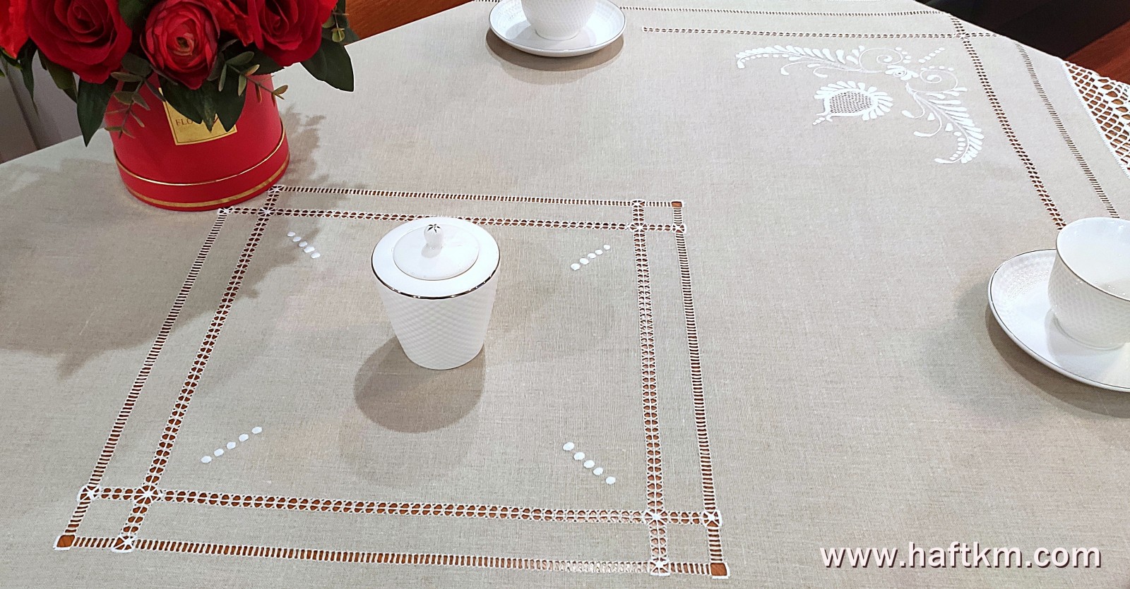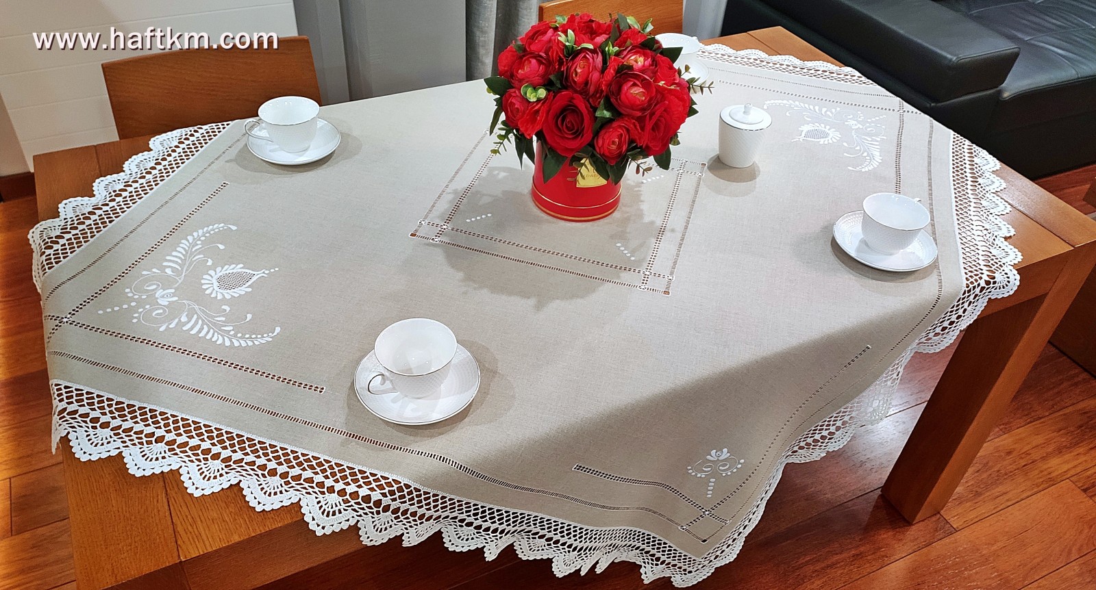 techniką hafciarską, haft wypukły, haft toledo. Ponadto serweta została misternie ozdobiona elegancką i misterną koronką szydełkową.