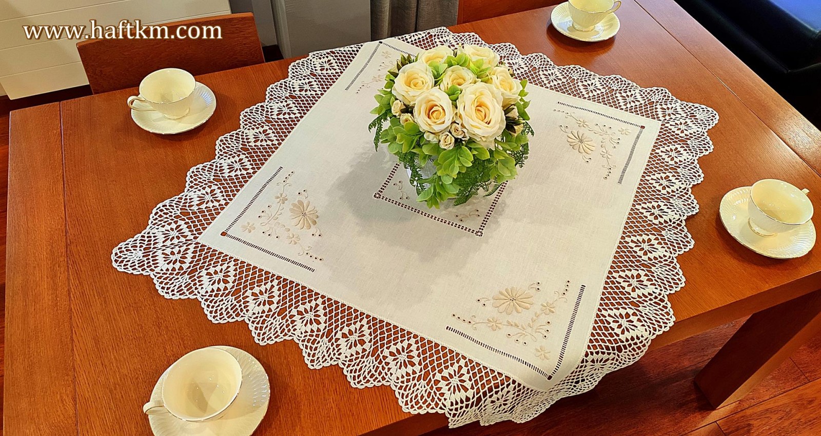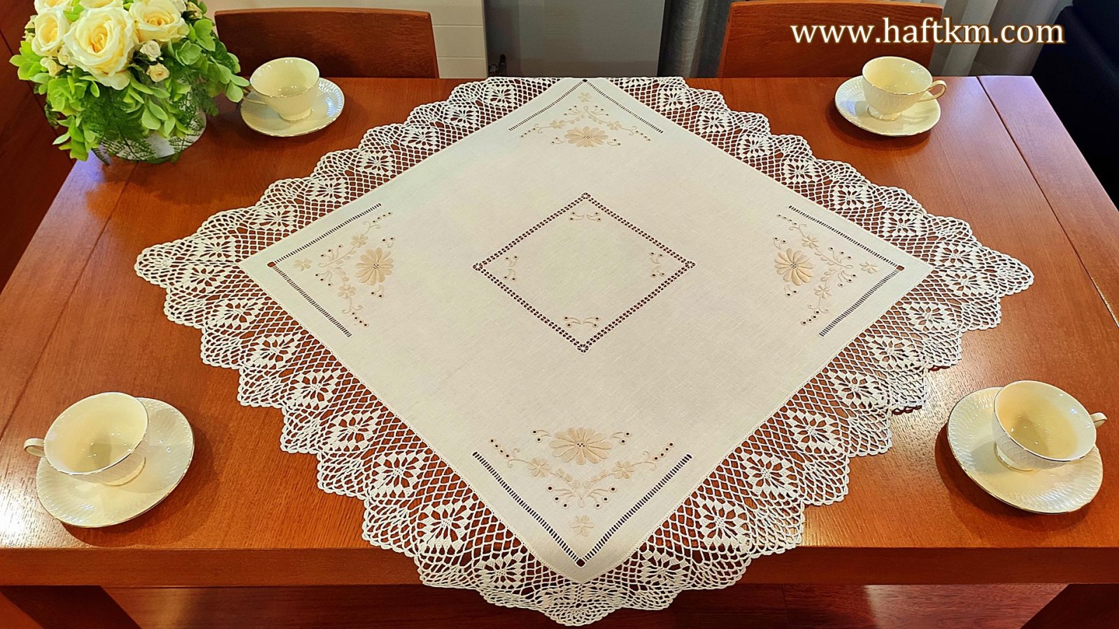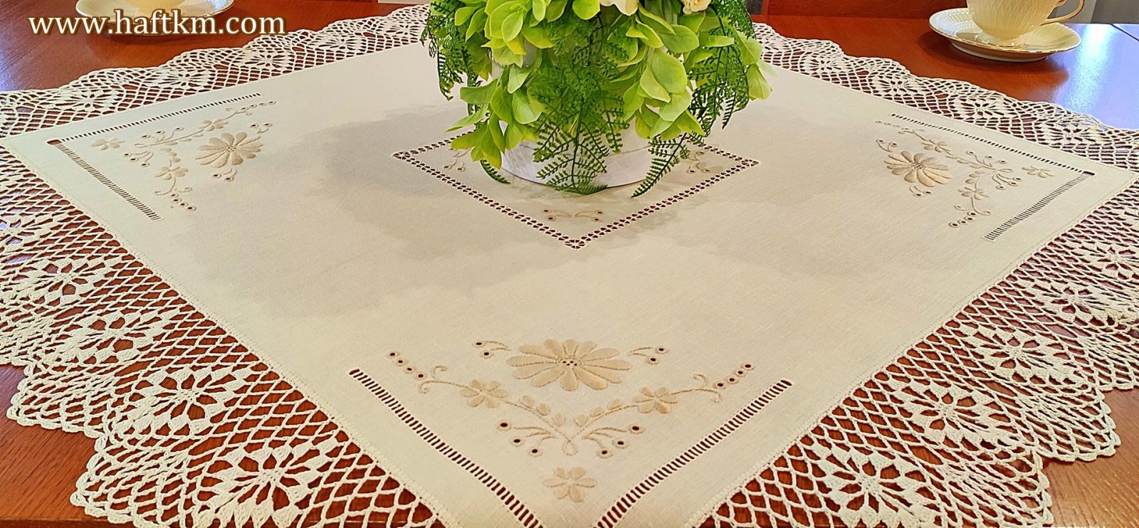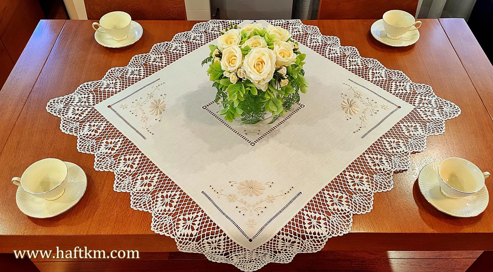 techniką hafciarską - haft wypukły, haft toledo. Serweta został misternie ozdobiony elegancką i estetyczną mereżką. Brzegi serwety ozdabia, elegancka koronka szydełkowa.