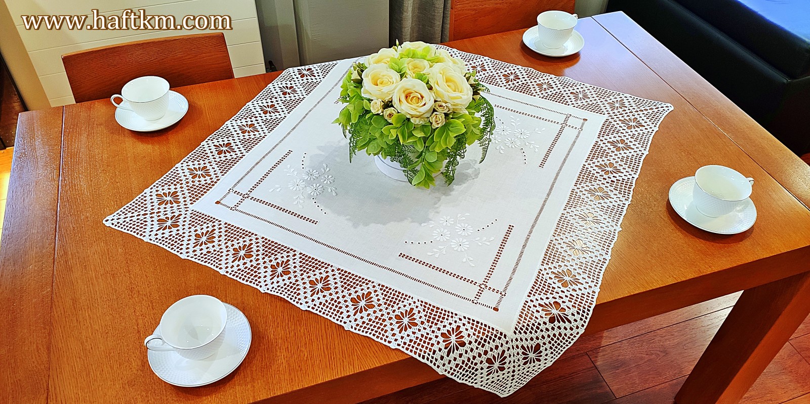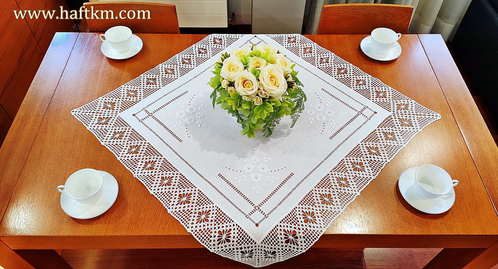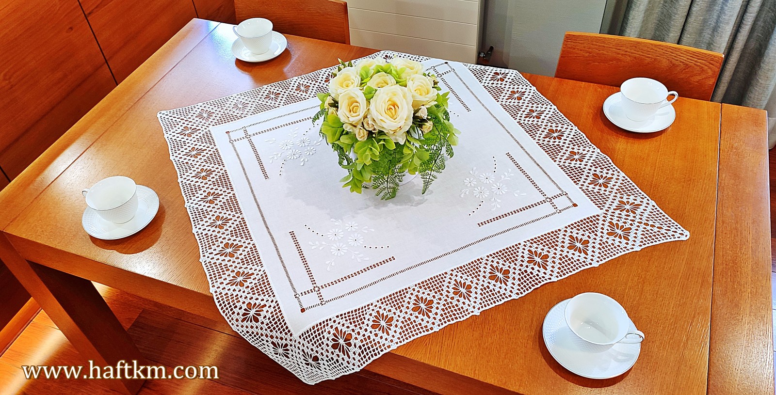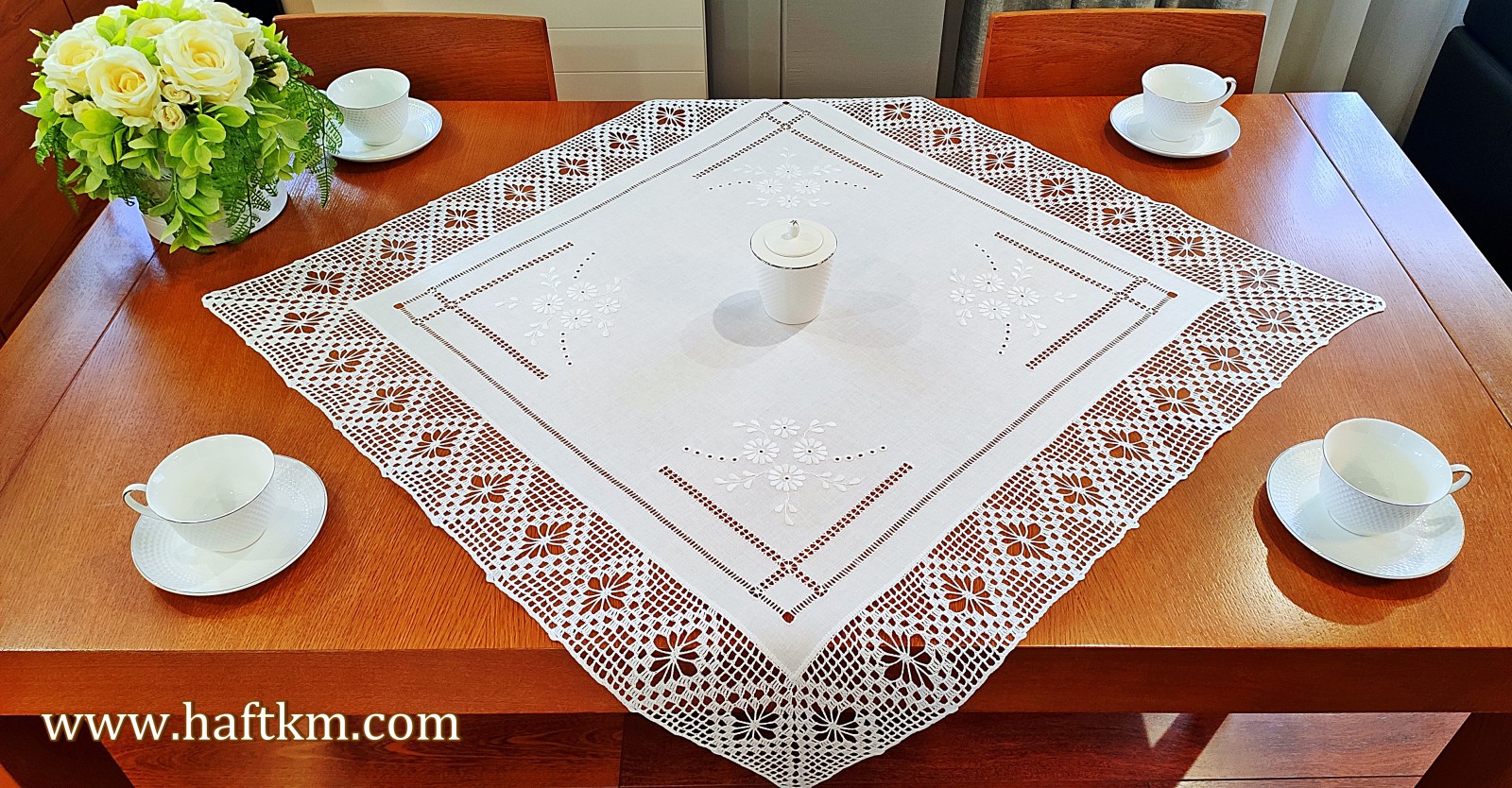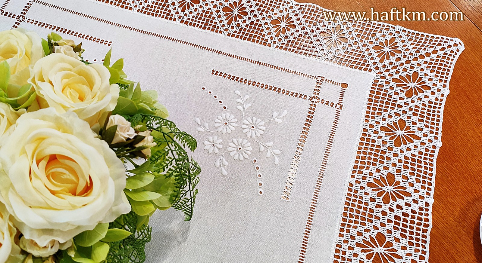 techniką hafciarską, haft angielski. Ponadto serweta została misternie ozdobiona elegancką i misterną koronką szydełkową.