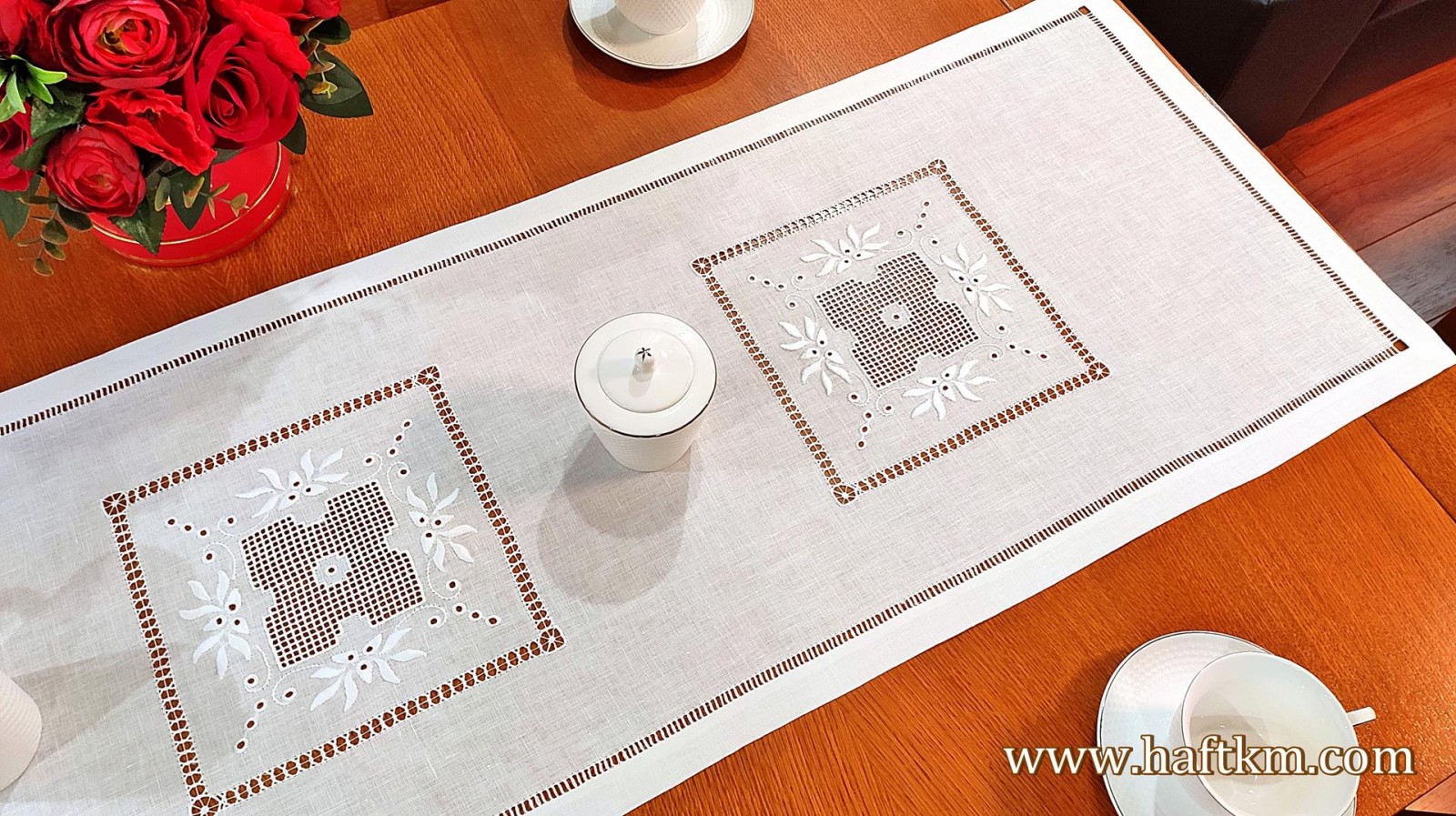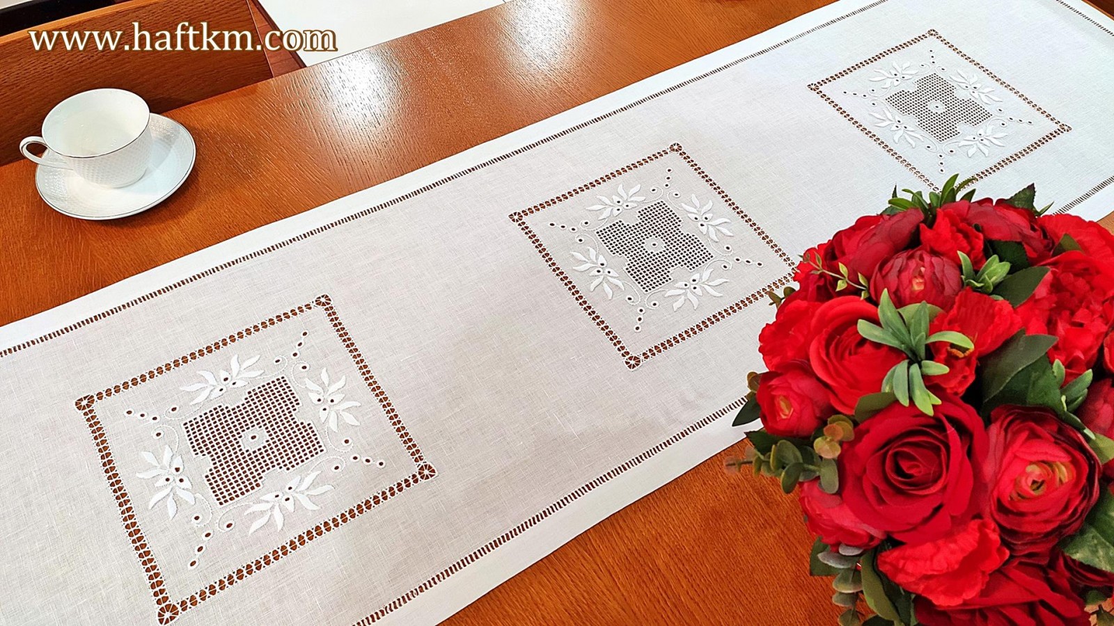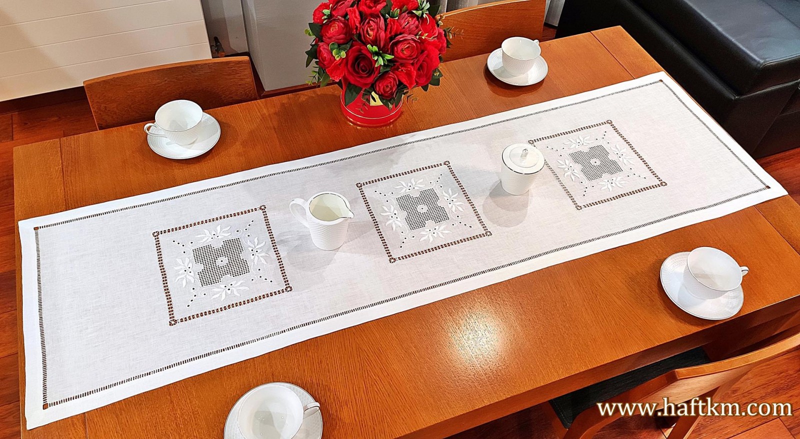techniką hafciarską, haft wypukły, haft toledo. Ponadto bieżnik został misternie ozdobiony elegancką i estetyczną mereżką.