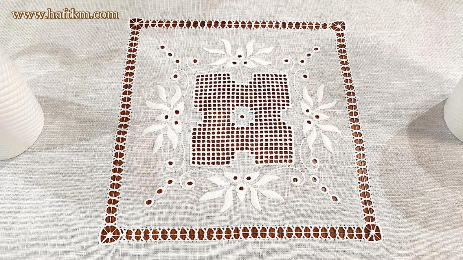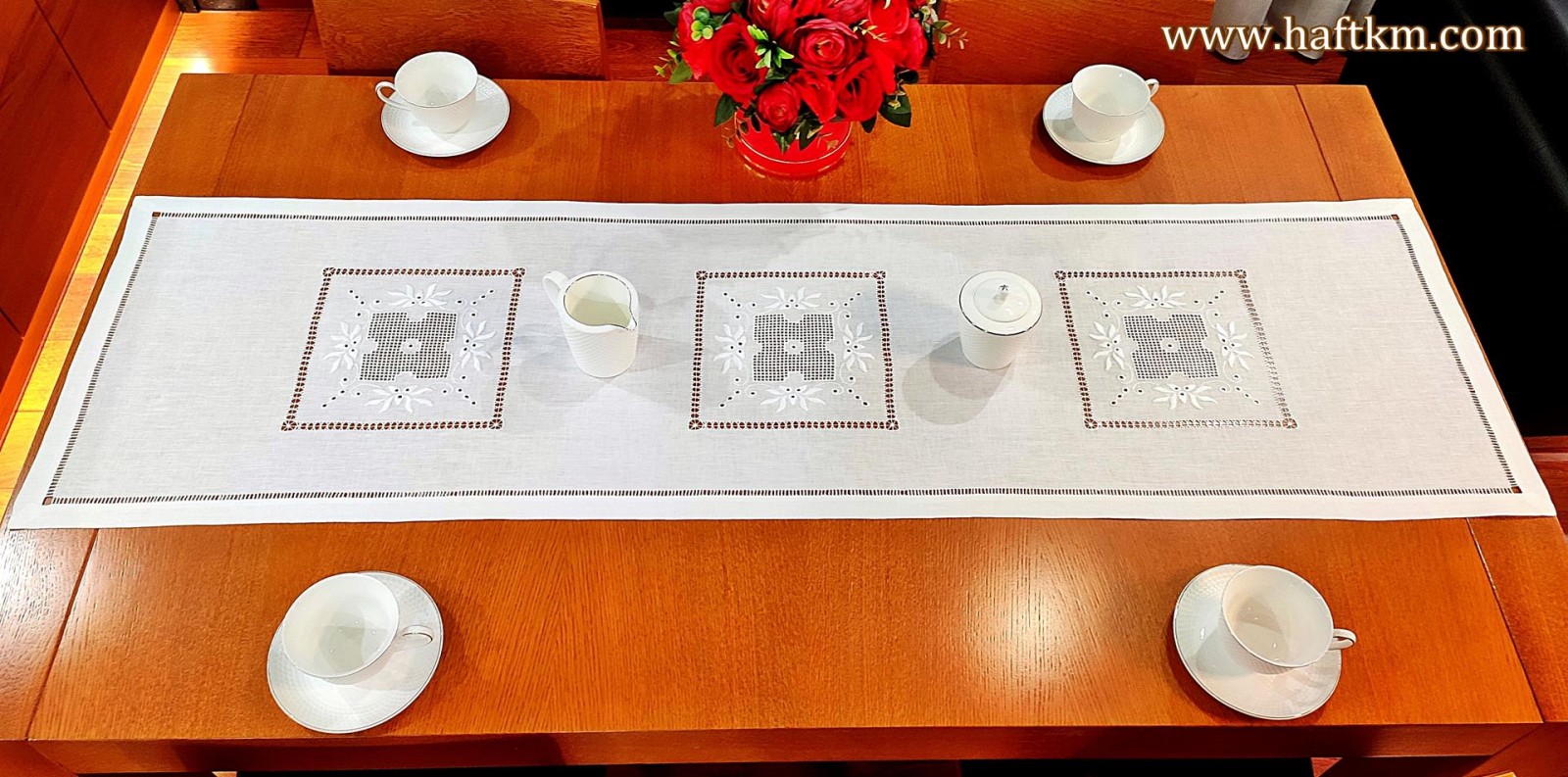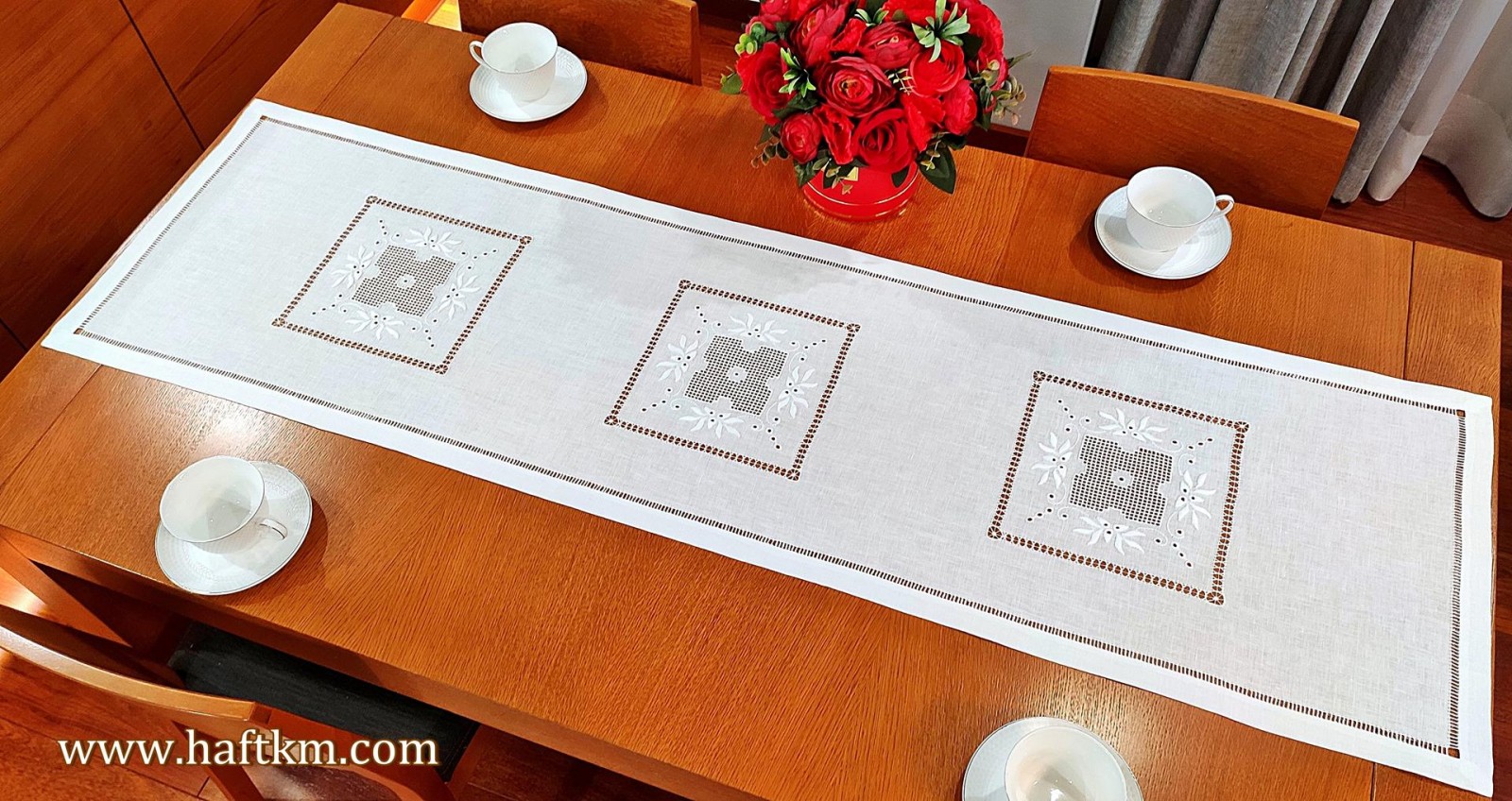 techniką hafciarską, haft wypukły, haft toledo. Ponadto bieżnik został misternie ozdobiony elegancką i estetyczną mereżką.